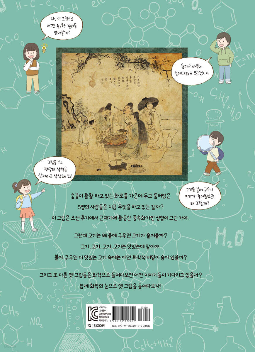 금으로 그린 그림에, 손가락으로 그린 그림도 있어요! 옛 그림 하면 어떤 화가의 어떤 그림이 떠오르나요? 김홍도의 「씨름도」가 떠오른다고요? 물론 이 그림은 너무나도 유명한 옛 그림 중 하나지요. 하지만 이 외에도 우리가 미처 알지 못했던 옛 그림도 많이 있답니다. 조선의 왕 인조가 아낀 화가인 이징이 그렸다는 「니금산수도」는 본 적이 있나요? 엄청 구하기 어려운 금으로 그림을 그렸다지 뭐예요. 그 외에 이런 그림도 있어요. 심사정이 손가락으로 그렸다는 「송하음다」라는 그림을 보면, “와우, 정말 손가락으로 그렸다고?” 하는 감탄이 나올 거예요. 다양하게 엄선한 옛 그림 20점이 실린 이 책을 펼쳐보며 옛 그림에 대한 새로운 경험을 해보아요. 그림 속 사람들은 무엇을 하고 있는 걸까요? 그림 속 상황에 대한 이야기를 화학 이론으로 풀어냈어요! 조선 시대의 성협이 그린 「고기굽기」를 한번 볼까요? 뿅 하고 우리 함께 그림 속으로 들어가 보아요. 주위를 둘러보니 다섯 명의 남자들이 모여서 고기를 구워 먹고 있어요. 생생하게 그려져 있어 그림을 보면서 나도 모르게 입맛을 다시게 돼요. 먼저 지글지글 불판에서 익고 있는 고기에 눈길이 가요. 고기를 집어먹고 싶어지네요. 하지만 이런 궁금증이 고개를 들어요. 고기는 왜 익으면서 크기가 작아지고 단단해지는 걸까? 벌겋게 달아오른 숯은 어떻게 만드는 걸까? 벙거지처럼 생긴 불판은 숯불의 열이 잘 전달되는 걸까? 고기를 먹은 사람 배 속에서는 어떤 일이 일어날까? 하고 말이에요. 이 책에서는 그림을 보고 문득 드는 질문을 화학적으로 풀어 보았어요. 그림과 화학의 절묘한 만남을 체험해 보아요. 그림 속 상황과 우리 생활이 연결되어 있다고요? 그림 속 화학 이야기를 실제 생활에서 만나는 꿀팁! 그림도 감상하고, 그림 속에 숨겨진 화학 원리에 대한 이야기도 찾아냈나요? 여기서 끝이 아니에요. 옛 그림을 감상하며 풀어낸 화학적 원리를 이제 직접 체험해 보아요. 바로 우리 생활과 연결된 이야기로 실험해 보는 거예요. 어렵다고요? 그렇지 않아요. 온도가 올라가면 물질이 팽창해요. 김득신의 대장간 그림에서 우리는 물질의 팽창에 대한 이야기를 생각해 보았어요. 그렇다면 실제 우리 생활에서 물질이 팽창하는 쉬운 예를 찾아보고 직접 실험해 보아요. 바로 탁구공이에요. 찌그러진 탁구공을 펼 수 있는 방법이 있어요. 물질은 열을 받드면 팽창하는 성질을 이용하면 되지요. 뜨거운 물속에 찌그러진 탁구공을 넣어 보아요. 시간이 지나면 찌그러진 탁구공이 펴질 거예요. 이 책에서는 옛 그림을 감상하고, 그림 속 화학 이야기를 설명한 것에서 그치지 않고, 각 화학 원리를 간단하고 쉽게 체험해 볼 수 있는 팁도 마련했지요. 교과 연계 5학년 2학기 미술 2단원 표현의 날개를 펼치며/ 3장 우리 옛 그림을 찾아서 5학년 1학기 과학 1단원. 온도와 열 5학년 1학기 과학 3단원. 용해와 용액 5학년 2학기 과학 3단원. 날씨와 우리 생활 5학년 2학기 과학 5단원. 산과 염기 6학년 1학기 과학 2단원. 여러 가지 기체 6학년 1학기 과학 3단원. 식물의 구조와 기능 6학년 2학기 과학 3단원. 연소와 소화 |