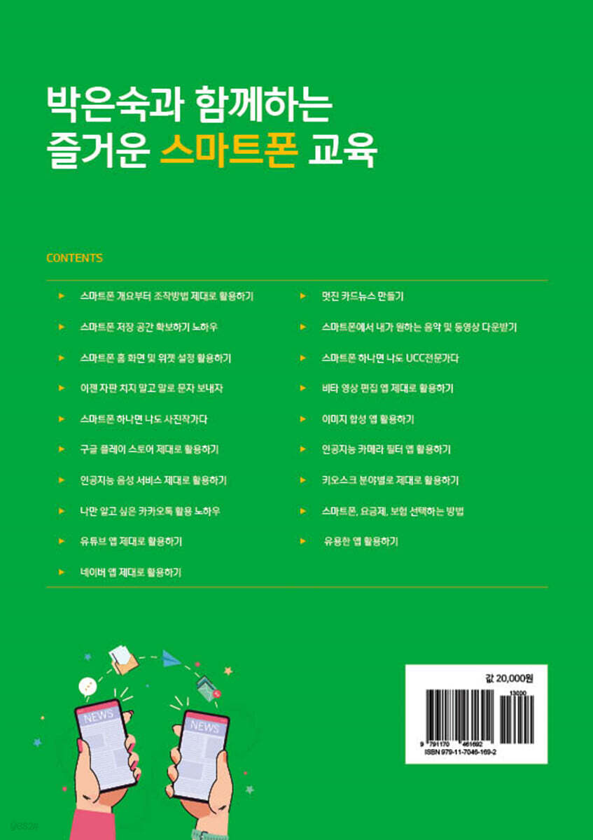 sns소통연구소는 2010년부터 스마트폰 교육 전문가를 양성하기 위해 국내 최초의 스마트폰 강사 자격증인 [스마트폰 활용지도사] 교육을 전문적으로 하고 있습니다. 이 책은 소통연구소의 강사 과정에서 배출되어 전국 각 기관과 단체에서 활발하게 수업하고 계신 3,100여 명의 스마트폰 활용지도사 선생님들의 교육 커리와 강의 중 자주 발생하는 문제 상황을 참조하여 만들어졌기 때문에 스마트폰 활용 교육을 하고 계신 선생님들의 교재 선택의 고민을 해결해 줄 수 있다 자부합니다. 또한, 스마트폰 활용에 서투신 시니어 실버 분들이 보기 편하게 책 크기를 A4사이즈로 하여 글자 크기를 늘려, 편하고 쉽게 따라 하실 수 있도록 하였다. 이 책을 교재로 사용하시는 강사분들께는 수업의 수월성을 마련해 드리고 수강생분들께는 스마트폰 마스터의 길을 열어드리는 길잡이가 될 수 있도록 제작하였습니다. “스마트폰 제대로 배우고 익히면 인생이 즐거워 지고 비즈니스가 풍요로워집니다.” 이 책이 많은 분들에게 인생의 등불이 되고 즐거움을 선물해주는 도구로 사용되었으면 하는 바람을 전합니다. - 스마트폰을 최적화해 느려지는 것을 해결할 수 있어요. - 말로 문자를 보낼 수 있어요. - 채팅방을 만들어 친구들에게 약속장소를 지도로 보낼 수 있어요. (친구생일에 선물을 보내고 회비도 보낼 수 있어요) - 멋진 풍경을 눈에 보이는 대로 찍을 수 있어요. - 카드를 만들어 친구에게 보낼 수 있어요. - 나도 사진작가처럼 멋진 사진을 찍을 수 있어요 (상황별 촬영 방법, 앱을 사용해 사진 보정,효과,편집을 할 수 있어요.) - 스마트폰 안에 비서를 둘 수 있어요. - 키오스크 앞에서 당당할 수 있어요 또한 이번에는 유용한 앱들을 더 추가 하였습니다. 저희 에스엔에스소통연구소의 모든 임직원들은 모든 분들이 인생이 즐거워지고 비즈니스가 풍요로워지는 일에 일조가 될 수 있도록 언제나 최선을 다할 것을 약속드립니다. 소통연구소 출판부 책을 내면서... 대한민국 국민 5,162만명! 스마트폰 개통대수 7,600만대! 이번에 출간하는 책은 14년 동안 뉴미디어 마케팅 교육(스마트폰, SNS마케팅 등)을 해오고 있는 SNS소통연구소에서 시니어 실버분들의 즐거운 인생을 위해 시니어 실버가 보기 편하게 제작한 책입니다. 책 크기도 A4 크기이고 글자 크기도 14포인트로 제작해 시니어 실버분들이 책을 보는 데 있어 매우 편하게 되어 있습니다. SNS소통연구소는 14년 동안 시니어 실버들에게 스마트폰 활용 교육을 하면서 꼭 필요한 스마트폰 활용 기능이 무엇인지 누구보다도 잘 알고 있습니다. 따라서 SNS소통연구소에서 발행한 이 책은 스마트폰 활용을 잘 못하시는 시니어 실버분들에게 훌륭한 스마트폰 기본활용의 지침서가 될 것입니다. 또한, 전국에서 스마트폰 활용 교육을 하고 계시는 스마트폰 강사님들도 이 책을 스마트폰 기본 교육 시 교재로 사용하시면 강사님과 수강생 분들에게 많은 도움이 되실 거라 자부합니다. 추후 시니어 실버들을 위한 스마트폰 활용 중급편, 고급편 뿐만 아니라 스마트폰 교육 관련 다양한 분야도 준비 중에 있습니다. (예를 들어 스마트폰 카메라, 스마트폰 UCC, 유튜브 크리에이터, 블로그 등) SNS소통연구소는 2010년도부터 스마트폰 활용 교육을 전문적으로 해오고 있습니다. 스마트폰 교육 전문가를 양성하기 위해서 국내 최초로 스마트폰 강사 자격증인 [ 스마트폰 활용지도사 ] 교육을 통해 현재까지 3 ,200명 이상 되는 분들을 양성했습니다. 자격을 취득하고 훈련을 통해 전문가로 거듭난 [ 스마트폰 활용지도사 ] 선생님들은 전국 각 기관 및 단체에서 왕성히 활동을 하고 있습니다. 이번 책 구성도 전국에서 강의를 하는 스마트폰 활용지도사 선생님들의 교육 커리큘럼을 참고해서 탄생하게 된 것입니다. 필요로 하는 전부를 담아내지는 못하지만 그래도 이번 책을 통해 스마트폰 활용 교육 강사님들이나 수강생들 모두에게 도움이 되었으면 좋겠습니다. SNS소통연구소가 항상 강조하고 있는 "스마트폰 제대로 배우고 익히면 인생이 즐거워지고 비즈니스가 풍요로워집니다!"를 대한민국 국민 모두가 공감하고 제대로 스마트폰 활용을 하셨으면 하는 바람이 간절합니다. |