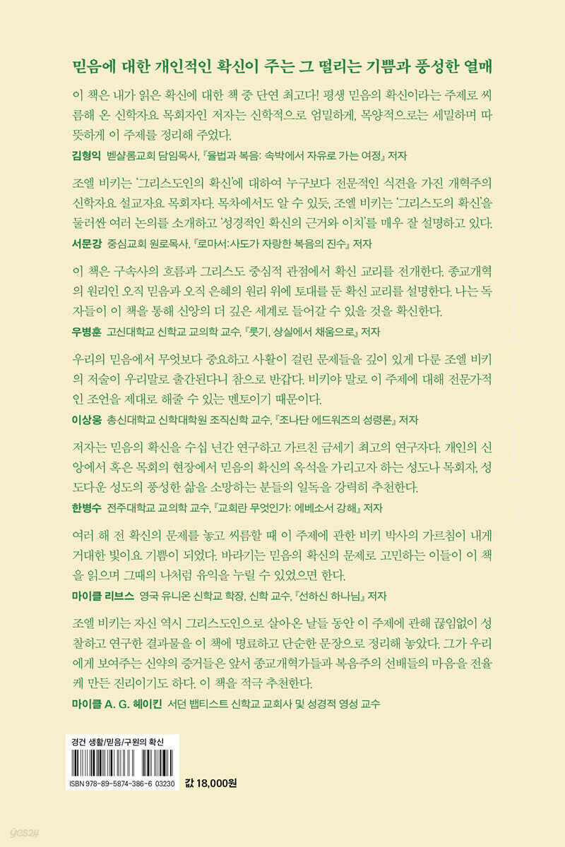 조엘 비키는 ‘그리스도인의 확신’에 대하여 누구보다 전문적인 식견을 가진 개혁주의 신학자요 설교자요 목회자다. 목차에서도 알 수 있듯, 조엘 비키는 ‘그리스도의 확신’을 둘러싼 여러 논의를 소개하고 ‘성경적인 확신의 근거와 이치’를 매우 잘 설명하고 있다. - 서문강 (중심교회 원로목사, 『로마서:사도가 자랑한 복음의 진수』 저자)
