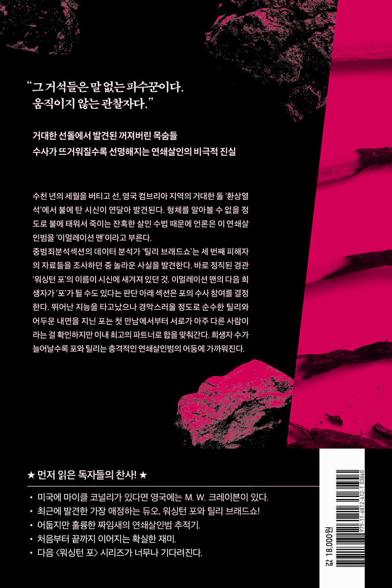 수사가 뜨거워질수록 선명해지는 연쇄살인의 비극적 진실 한국에 처음으로 소개되는 작가 M. W. 크레이븐이 『퍼핏 쇼』로 〈워싱턴 포〉 시리즈의 첫 작품을 선보인다. 작가는 이 작품을 2018년 출간하였으며, 2019년 영국추리작가협회(CWA)에서 주관하는 영미 범죄문학 최고의 영광 ‘골드 대거상’을 수상한다. 시리즈의 2편 『Black Summer』와 3편 『The Curator』 역시 같은 상의 후보에 선정되었으며 4편 『Dead Ground』는 CWA에서 최고의 스릴러소설에 수여하는 ‘이언 플레밍 스틸 대거상’을 받아, M. W. 크레이븐은 이 시리즈로 일약 스타로 떠올랐다. 영국 컴브리아 지역의 선사 유물 ‘환상열석’에서 불에 타 죽은 시신이 연달아 발견된다. 두 번째 시신이 발견된 이후 중범죄분석섹션이 수사에 참여하고, 곧이어 발견된 세 번째 시신을 조사하던 중 충격적인 자료를 획득한다. 시신의 몸에 정직된 경관 ‘워싱턴 포’의 이름이 새겨져 있던 것. 섹션은 포가 다음 희생자가 될 수도 있다는 판단 아래 포의 업무 복귀를 결정한다. 한편, 피해자의 시신에서 포의 이름을 발견한 천재 데이터 분석가 ‘틸리 브래드쇼’는 부족한 사회성으로 인해 직장에서 괴롭힘을 당한다. 온실 속 화초처럼 자랐지만 그의 뛰어난 능력에 주목한 포는 틸리를 자신의 수사팀으로 끌어들인다. 전혀 다른 두 사람이 서서히 합을 맞춰가는 와중에 네 번째 희생자의 시체가 발견되고, 전대미문의 연쇄살인은 끝없이 미궁에 빠져든다. “그 거석들은 말 없는 파수꾼이다. 움직이지 않는 관찰자다.” 중범죄분석섹션의 경위 ‘스테퍼니 플린’은 영국 컴브리아 지역의 허드윅 농장으로 한 남자를 찾아간다. 그는 과거 플린의 상사였으나, 수사 내용이 담긴 정보를 외부에 노출한 실책으로 정직된 경관 ‘워싱턴 포’이다. 플린은 포에게 컴브리아 지역에서 발생한 연쇄살인에 관해 말하기 시작한다. 거대한 돌, ‘환상열석’에서 형체를 알아볼 수 없을 정도로 불에 태워 죽이는 잔혹한 수법 때문에 이 연쇄살인범은 이른바 ‘이멀레이션 맨’으로 불린다. 포는 세 번째 피해자의 자료를 훑던 중 충격적인 내용을 확인한다. 바로 피해자의 시신에 자신의 이름인 ‘워싱턴 포’ 그리고 숫자 5가 새겨져 있던 것. 섹션은 포가 다섯 번째 피해자가 될 수 있다는 판단 아래 플린을 포에게 보낸 것이다. 그리고 얼마 뒤 이멀레이션 맨의 네 번째 피해자가 코커마우스의 환상열석에서 발견된다. 섹션의 결정으로 포는 이멀레이션 맨 검거를 위해 업무에 복귀하고, 시신에서 자신의 이름을 발견한 천재 데이터 분석가 ‘틸리 브래드쇼’를 수사에 합류시킨다. 11개월 전에 읽은 고용계약서를 달달 외우고 있을 만큼 뛰어난 두뇌를 지녔지만 경악스러울 정도로 사회성이 부족한 틸리는 이른바 섹션의 특별 인원이다. 둘은 첫눈에 서로가 아주 다른 사람이라는 것을 확인하지만, 이내 최고의 파트너로 수사에 박차를 가한다. 워싱턴 포와 틸리 브래드쇼, 스테퍼니 플린과 또 다른 경관 킬리언 리드까지, 이멀레이션 맨을 잡기 위한 수사팀이 꾸려졌다. 네 명의 피해자들, 그리고 다섯 번째 피해자가 될 수도 있는 포와의 연결 고리를 찾으려는 가운데 수상한 우편물 하나가 포에게 도착한다. 평범한 갈색 봉투 안에 든 것은 흔한 엽서 한 장. 엽서에 적힌 짧은 메시지는 사건을 다시 원점으로 돌린다. 분명한 건 이멀레이션 맨은 포를 사건에 끌어들이고 싶어 한다는 사실이다. 포는 이 범죄에 연루되어 있다. 어쩌면 불에 타 죽는 것보다 더 잔혹하고 끔찍한 이유로……. 사건의 진실에 가까워질수록 감당하기 힘든 이멀레이션 맨의 정체가 드러나고, 포는 사건의 어둠보다 더욱 어두운 자신의 과거에 다가선다. 시리즈 〈밀레니엄〉을 넘어설 강력한 수사 듀오의 탄생 살인범을 끈질기게 따라잡는 ‘포&틸리’의 범죄 추적기! M. W. 크레이븐은 어떠한 흔적도 남기지 않는 치밀한 연쇄살인범을 설정한 뒤, 이 소설의 제목 “퍼핏 쇼the puppet show”처럼 연쇄살인범이 경관들을 마치 꼭두각시처럼 부리도록 한다. 증거가 있는 곳이라면 물불 가리지 않고 뛰어드는 포와 그의 동료 수사관들은 연쇄살인범의 흔적을 열심히 뒤쫓지만 고개를 들어보면 살인범이 놓은 미끼를 물었다는 사실을 재차 확인하고야 만다. 거의 다 쫓아왔다고 느낄 때쯤 다시 달아나는 추적의 묘미가 책의 마지막 장까지 이어진다. 하지만 작품을 끝까지 읽은 뒤에 남는 것은 꼭두각시처럼 부려졌다는 데에 대한 허탈함보다는 그렇게 할 수밖에 없었던 사연을 향한 작가의 묵직한 시선이다. 대중적인 재미를 잡으면서 동시에 캐릭터의 과거를 깊이 있게 파고드는 이 작품은 크레이븐이 얼마나 뛰어난 이야기꾼인지를 보여주는 동시에 독자들 마음속에 오래도록 남을 범죄소설의 새로운 기준점을 제안한다. 브래드쇼는 누구보다 물정에 밝은 사람은 아니었지만, 성인인 만큼 누구나 그렇듯이 끔찍한 결정을 내릴 자유가 있었다. 그리고 이상하게 들릴 테지만 두 사람은 합이 잘 맞았다. 부적응자들이 흔히 그렇지, 포는 생각했다. _ 212쪽 『퍼핏 쇼』로 시작된 크레이븐의 〈워싱턴 포〉 시리즈는 〈포&틸리