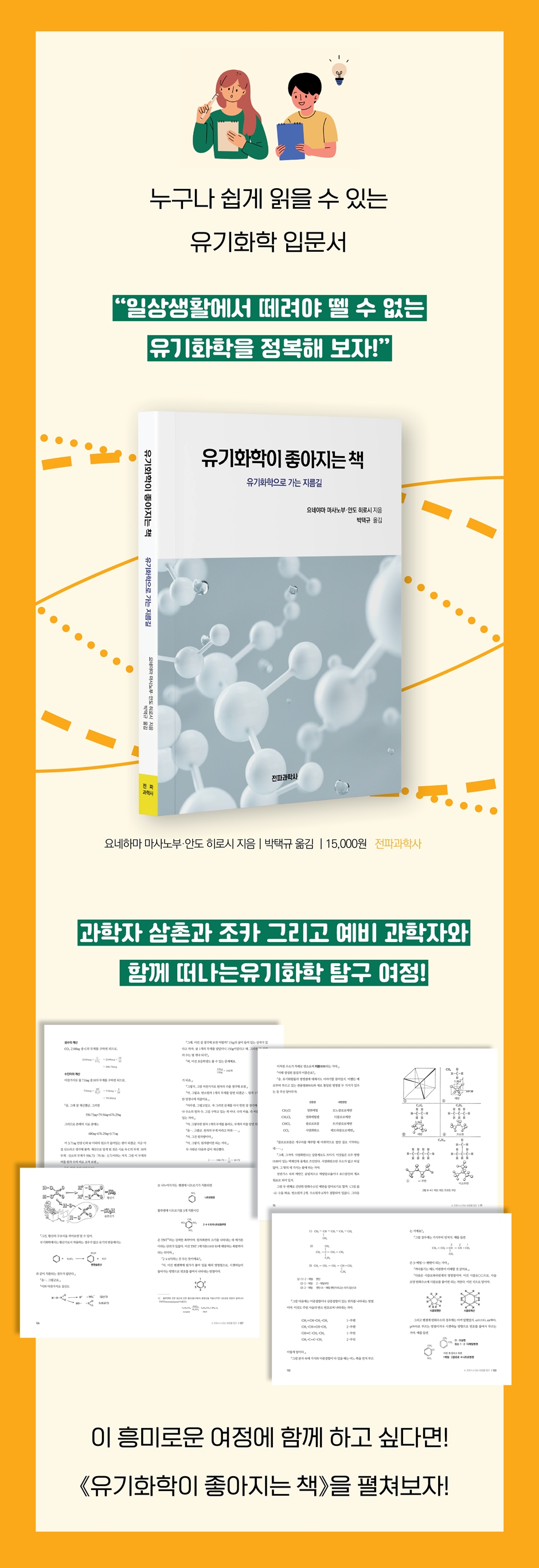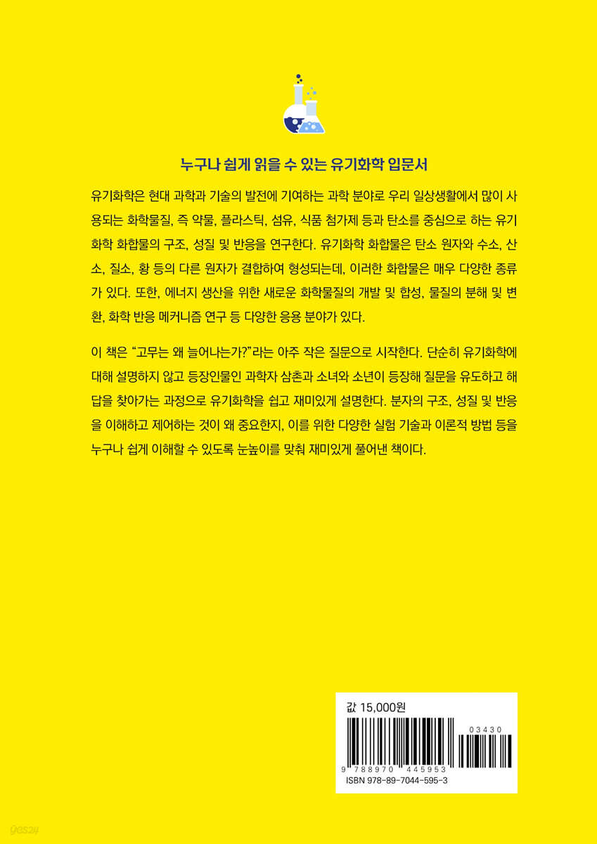 그 신비로운 세계로 들어가 보자! 화학은 주로 물질의 구조와 그 변화를 다루는 학문인데, 화학이라고 하면 굉장히 어렵고 복잡하게 느껴진다. 더구나 중고교 과정에서 다루는 화학 과목은 화학의 기본 원리를 설명하며 학생들이 이해할 수 있도록 화학의 여러 분야를 포괄적으로 다루고 있다. 다만 아쉬운 점은 그러다 보니 유기화학 분야는 매우 적게 다루고 있다는 점이다. 자연계에 존재하는 화합물은 그 종류가 헤아릴 수 없을 만큼 많다. 그중에서도 유기화합물은 그 종류와 수가 엄청나게 많아 우리 생활과 특히 밀접하게 연관되어 있다고 할 수 있다. 이런 유기화학의 중요성을 조금이나마 알리기 위해 쓰인 이 책은 고무에 대한 질문에서부터 시작해서 관련 질문을 유도하고 해답을 찾아가는 과정을 재미있게 설명하고 있다. 유기화학에 대한 탐구가 대화체로 전개되어 유기화학이 무엇인지, 유기화학을 어떻게 연구하는지 등을 쉽게 이해하는 데 도움을 준다. 어렵게만 느껴지는 화학, 그중에서도 유기화학에 쉽게 다가설 수 있게 풀어낸 책이다. 등장인물들(과학자 삼촌, 소녀, 소년)과 함께 유기화학의 세계로 들어가 보자. |