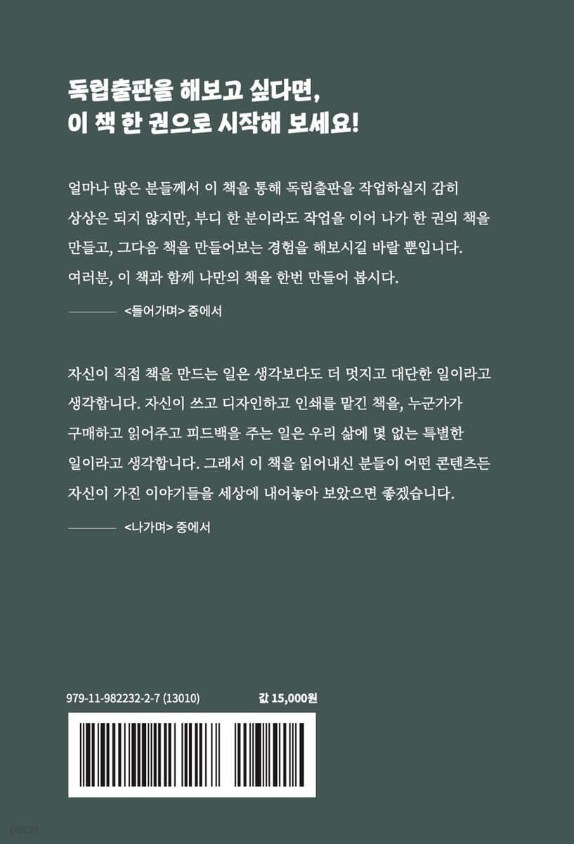 얼마나 많은 분들께서 이 책을 통해 독립출판을 작업하실지 감히 상상은 되지 않지만, 부디 한 분이라도 작업을 이어 나가 한 권의 책을 만들고, 그 다음 책을 만들어보는 경험을 해보시길 바랄 뿐입니다. 여러분, 이 책과 함께 나만의 책을 한번 만들어 봅시다.