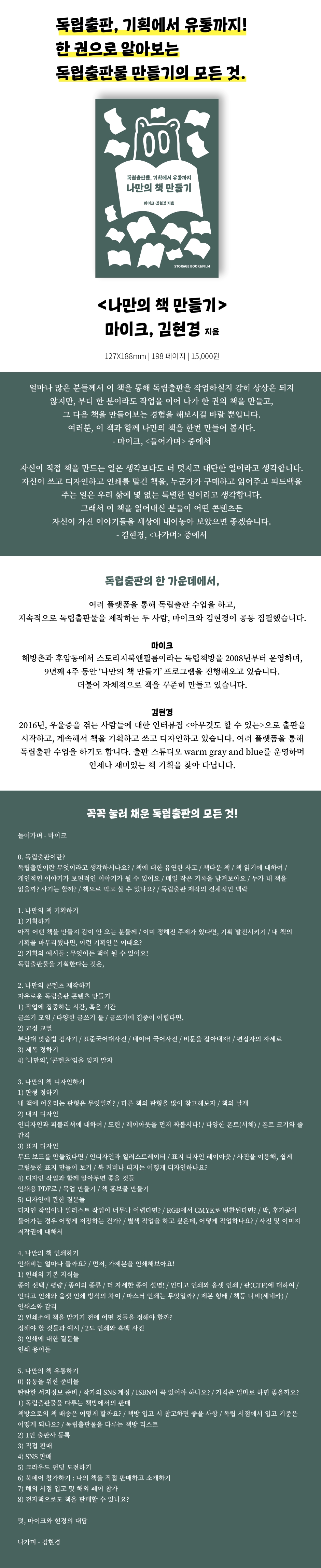 0. 독립출판이란? 독립출판이란 무엇이라고 생각하시나요? / 책에 대한 유연한 사고 / 책다운 책 / 책 읽기에 대하여 / 개인적인 이야기가 보편적인 이야기가 될 수 있어요 / 매일 작은 기록을 남겨보아요 / 누가 내 책을 읽을까? 사기는 할까? / 책으로 먹고 살 수 있나요? / 독립출판 제작의 전체적인 맥락 1. 나만의 책 기획하기 1) 기획하기 아직 어떤 책을 만들지 감이 안 오는 분들께 / 이미 정해진 주제가 있다면, 기획 발전시키기 / 내 책의 기획을 마무리했다면, 이런 기획안은 어때요? 2) 기획의 예시들 : 무엇이든 책이 될 수 있어요! 독립출판물을 기획한다는 것은, 2. 나만의 콘텐츠 제작하기 자유로운 독립출판 콘텐츠 만들기 1) 작업에 집중하는 시간, 혹은 기간 글쓰기 모임 / 다양한 글쓰기 툴 / 글쓰기에 집중이 어렵다면, 2) 교정 교열 부산대 맞춤법 검사기 / 표준국어대사전 / 네이버 국어사전 / 비문을 잡아내자! / 편집자의 자세로 3) 제목 정하기 4) ‘나만의’, ‘콘텐츠’임을 잊지 말자 3. 나만의 책 디자인하기 1) 판형 정하기 내 책에 어울리는 판형은 무엇일까? / 다른 책의 판형을 많이 참고해보자 / 책의 날개 2) 내지 디자인 인디자인과 퍼블리셔에 대하여 / 도련 / 레이아웃을 먼저 짜봅시다! / 다양한 폰트(서체) / 폰트 크기와 줄 간격 3) 표지 디자인 무드 보드를 만들었다면 / 인디자인과 일러스트레이터 / 표지 디자인 레이아웃 / 사진을 이용해, 쉽게 그럴듯한 표지 만들어 보기 / 북 커버나 띠지는 어떻게 디자인하나요? 4) 디자인 작업과 함께 알아두면 좋을 것들 인쇄용 PDF로 / 목업 만들기 / 책 홍보물 만들기 5) 디자인에 관한 질문들 디자인 작업이나 일러스트 작업이 너무나 어렵다면? / RGB에서 CMYK로 변환된다면? / 박, 후가공이 들어가는 경우 어떻게 저장하는 건가? / 별색 작업을 하고 싶은데, 어떻게 작업하나요? / 사진 및 이미지 저작권에 대해서 4. 나만의 책 인쇄하기 인쇄비는 얼마나 들까요? / 먼저, 가제본을 인쇄해보아요! 1) 인쇄의 기본 지식들 종이 선택 / 평량 / 종이의 종류 / 더 자세한 종이 설명! / 인디고 인쇄와 옵셋 인쇄 / 판(CTP)에 대하여 / 인디고 인쇄와 옵셋 인쇄 방식의 차이 / 마스터 인쇄는 무엇일까? / 제본 형태 / 책등 너비(세네카) / 인쇄소와 감리 2) 인쇄소에 책을 맡기기 전에 어떤 것들을 정해야 할까? 정해야 할 것들과 예시 / 2도 인쇄와 흑백 사진 3) 인쇄에 대한 질문들 인쇄 용어들 5. 나만의 책 유통하기 0) 유통을 위한 준비물 탄탄한 서지정보 준비 / 작가의 SNS 계정 / ISBN이 꼭 있어야 하나요? / 가격은 얼마로 하면 좋을까요? 1) 독립출판물을 다루는 책방에서의 판매 책방으로의 책 배송은 어떻게 할까요? / 책방 입고 시 참고하면 좋을 사항 / 독립 서점에서 입고 기준은 어떻게 되나요? / 독립출판물을 다루는 책방 리스트 2) 1인 출판사 등록 3) 직접 판매 4) SNS 판매 5) 크라우드 펀딩 도전하기 6) 북페어 참가하기 : 나의 책을 직접 판매하고 소개하기 7) 해외 서점 입고 및 해외 페어 참가 8) 전자책으로도 책을 판매할 수 있나요? 덧, 마이크와 현경의 대담 나가며 - 김현경 |