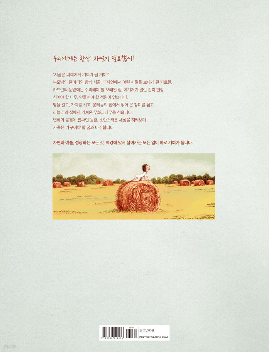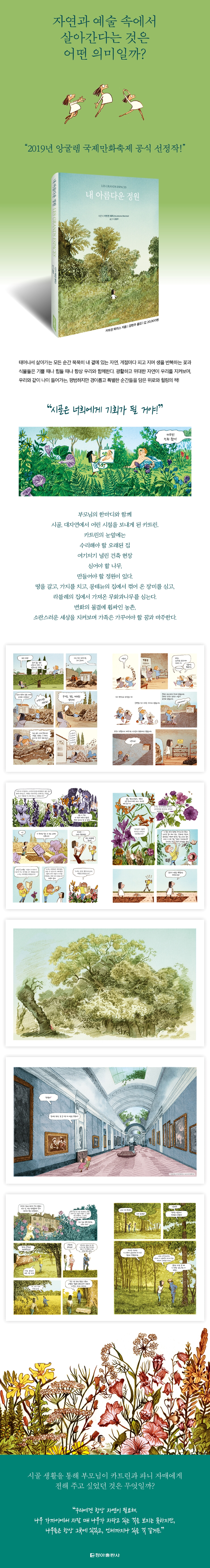직접 만들고 가꾸며 만끽한 어린 시절 이야기 카트린은 어린 시절 부모님, 동생 파니와 함께 한적한 시골의 무너져 가는 농장으로 이사한다. 그곳에서 가족은 직접 거실과 방, 주방과 화장실을 만들고, 집 주변을 정리해 꽃과 나무를 심고 채소를 기르며 새로운 터전을 가꾼다. 카트린과 파니는 들판과 숲을 놀이터 삼아, 꽃과 곤충, 가축들을 친구 삼아 하루하루를 신나게 모험한다. 채소밭 한쪽에 작은 정원을 만들어 상상의 나래를 펼치고, 폐허에서 발견한 오래된 화석을 집에 만든 박물관에 전시하고, 마을 곳곳에서 어른들의 사정과 개발에 관한 어려운 이야기들을 듣기도 한다. 시간이 지날수록 카트린은 작은 정원에서 세상의 소란과 동떨어져 사색하고 그림을 그리며 성장한다. 카트린에게 작은 정원은 자연 그 자체이자 세상의 전부였다. 어른이 된 카트린은 묻는다. “30년 전에 왜 그렇게 큰 건물과 큰 정원이 있는 곳에서 살기로 했어요?” “우리에겐 항상 자연이 필요했어. 나무 가까이에서 자랄 때 나무가 자라고 있는 것을 보지는 못하지만, 영원하다는 느낌을 받아. 나무들은 항상 그곳에 있었고, 언제까지나 있을 것 같거든.” 시골 생활을 결정하며 부모님이 카트린과 파니에게 진정으로 전해 주고 싶었던 것은 힘들 때 자연으로부터 위로받은 기억 그 자체였다. 태어나서 살아가는 모든 순간 묵묵히 서 있는 나무, 계절마다 피고 지며 생을 반복하는 꽃과 식물들은 기쁠 때나 힘들 때나 항상 우리 곁에 있다. 광활하고 위대한 자연이 우리와 같이 나이 들어가며, 우리를 지켜보는, 평범하지만 경이롭고 특별한 순간들을 이 책은 담고 있다. 자연과 문학, 자연과 예술 그리고 자연과 인간 널찍하고 탁 트인 지평선, 그곳을 온통 채운 초록빛, 꽃과 벌레로 가득한 숲속 풍경에서 우리는 편안함을 느낀다. 그뿐만 아니라 자연은 그 자체로 우리 상상력을 자극해서 역사상 수많은 작품의 배경과 모티프가 되기도 했다. 이 책에는 카트린이 자연을 통해 느끼고 배운 감정들을 담고 있는 여러 문학 작품과 명화도 등장한다. 피에르 로티, 마르셀 프루스트의 작품 속 구절들, 재치 있게 패러디한 코로, 푸생, 프라고나르, 위베르 로베르, 카스파르 프리드리히의 명화들은 우리를 웃게 하는 동시에 감탄을 자아낸다. 이 책을 펴낸 카트린 뫼리스는 프랑스의 대표적인 만화가 중 한 명이다. 그녀는 2015년 세계를 놀라게 한 샤를리 에브도 테러를 경험하고, 삶과 자연, 예술, 인간에 관해 더 깊이 고민하고 작품으로 담고 있다. 현대 문학과 디자인, 그래픽 아트 등 그녀가 공부한 모든 것으로 자연으로부터 받은 위로와 성장의 순간을 담아낸 이 책은 읽는 이에게 자연에 대한 동경과 향수를 불러일으킨다. 동시에 숨겨진 여러 작품을 알아보는 재미와 예술적, 문학적 깊이를 전하며, 자연과 문학, 자연과 예술, 자연과 인간은 어떤 관계인지 생각해 보게 한다. |