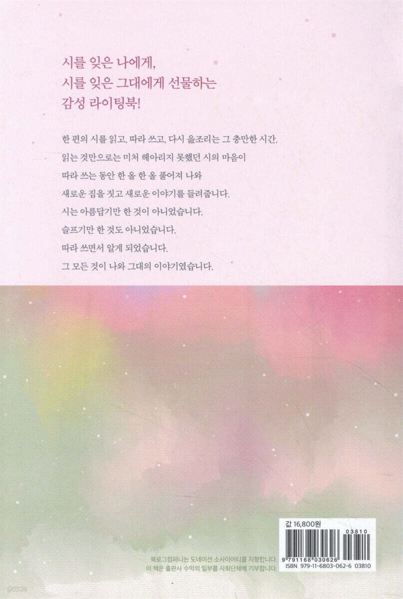 감성 캘리그라퍼 배정애의 만남 이 책에는 윤동주, 김수영, 정지용같이 이미 우리들의 곁을 떠나고 없지만 마음속의 별이 되어 사람들의 가슴에 영원히 남은 시인들의 시를 실었다. 또한 도종환, 정현종, 장석주 등 지금 우리가 가장 사랑하는 시인들의 시를 골라 담았다. 누구나 공감할 수 있고, 마음에 오랫동안 담아둘 수 있어 한국인이 가장 사랑하는 시들이다. 여기에 로버트 프로스트, 칼릴 지브란, 폴 엘뤼아르 등 세계 문학사에 큰 발자국을 남긴 외국 시인들의 명시를 엄선해 실었다. 말 그대로 전 세계 사람들이 평생 간직하고픈 시, 꼭 따라 써야 하는 시들이 모두 모인 것. 80편의 시가 전달하는 사랑과 행복, 용기와 희망의 언어를 따라 쓰면, 풍족해진 감성이 내 삶을 채우는 근사한 경험을 할 수 있다. 또한 베스트셀러 『캘리愛 빠지다』의 작가, 대한민국 대표 감성 캘리그라퍼 배정애가 그녀만의 감성으로 시를 해석해 캘리그라피로 재탄생시켰다. 시인의 언어와 배정애의 감성이 만나 춤을 추고 꽃을 피워내 독자의 가슴을 촉촉하게 적신다. 이것만으로도 이 책을 소유할 이유는 충분하다. 내 마음을 표현하는 시를 읽고, 쓰고, 가슴에 새기다 그의 전화를 받아 기분 좋은 날에, 창밖에 비가 주룩주룩 내리는 날에, 사랑하는 이와 심하게 다투고 난 날에 쓰고 싶은 시는 모두 다르다. 내 마음을 대변하는 시를 쉽게 찾을 수 있도록 사랑의 아름다움, 이별의 아픔, 삶의 진실, 계절과 자연이라는 네 가지 파트로 시를 나누어놓았다. 쓰고 싶은 시를 찾아 페이지를 펼치면, 시의 감성을 표현하는 아름다운 사진과 색깔이 당신을 맞이한다. 쓰지 않고 그저 보기만 해도 기분이 좋아진다. 또한 작고 핸디한 사이즈로 만들어 가지고 다니면서 시를 쓸 수 있도록 했다. 집에서, 학교에서, 직장에서, 산책 나온 공원에서, 전철에서… 그 어디서도 시를 쓰는 충만한 경험을 할 수 있다. 이제, 내 안에 숨어 있는 시를 꺼낼 시간이다. |