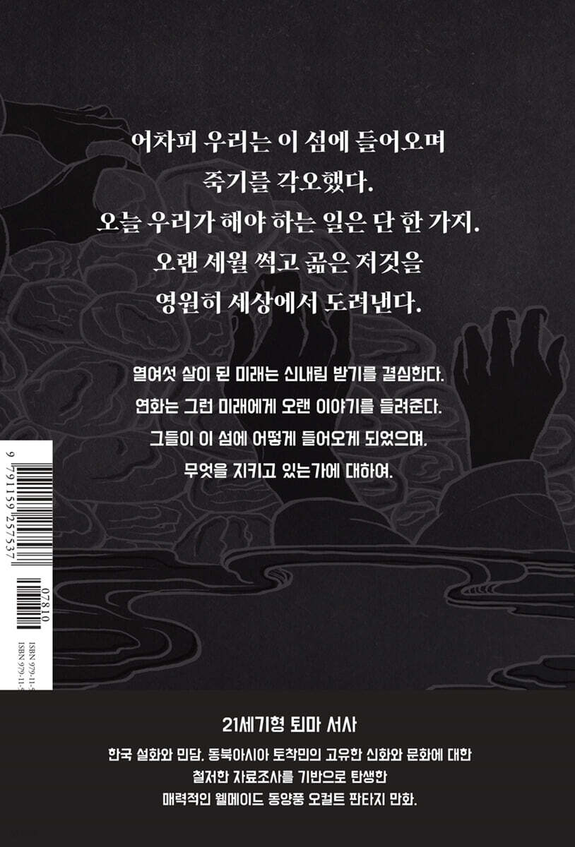 ---「21화 중도(中島) (12)」 중에서 “그런 성정과 업보는 그저 감응만으로 생겨나는 것이 아니다. 어린아이 장난이라 해도 생명을 쉽사리 죽이는 성정을 지녔던 게지. 그 일을 멸지(滅趾)의 교훈*으로 삼는다면 복일 것이고, 멸이(滅耳)의 액**까지 이른다면, 그 또한 그 아이의 업보다. 그러니 네가 그 일로 스스로를 책망할 필요는 없다.” ---「21화 중도(中島) (12)」 중에서 “사람이 음양의 도에 부합하기 위해선 먼저 명(明)과 광(光)의 이치를 깨달아야 한다. 명이란, 안을 비추어 밝히는 것이니, 곧 자기 자신을 아는 것이라. 그것을 담혜(湛兮)라 한다. 광이란, 바깥을 비추어 밝히는 것이니 곧 타인과 세상을 아는 것이라. 그것을 지혜(知兮)라 한다.” ---「22화 중도(中島) (完)」 중에서 “만물의 구분은 체(體)에 있지 않고 용(用)에 있는 것이라….” ---「22화 중도(中島) (完)」 중에서 “생각해보거라. 궁을 지킬 무장들과 나라를 함께 이끄는 문신들에게 돌아가야 할 쌀과 황금이 무당의 치마폭으로 감겨 들어갔으니 어찌 그 왕가가 무사할 수 있었겠느냐?” ---「24화 승목(乘木) (2)」 중에서 “사람은 본디 타고난 재질이나 환경에 관계없이 스스로 배우고 생각하고 익히고 개선하면 누구나 신통(神通)할 수 있는 존재다. 그러한 인간의 본성은 사람이 가진 것 중 가장 귀하고 아름다운 것이라 금강(金剛)이라 칭한다.” ---「25화 승목(乘木) (3)」 중에서 “사람은 누구나 저마다의 귀한 것을 가지고 태어나지만, 부처님이 와도 어찌할 도리 없는 부류가 딱 하나 있는데,바로 자포(自暴)하고 자기(自棄)하는 자들이지.” ---「25화 승목(乘木) (3)」 중에서 “칠성아. 거울에 때가 묻고 금이 가 있으면 아무도 들여다보지 않는 법이다. 네가 스스로를 다스리지 못한다면 사방 천지에서 수많은 신장을 불러 모아본들 무슨 소용이겠니?” ---「27화 승목(乘木) (5)」 중에서 “길에서 죽는 게 뭐. 그게 뭐 어떻다고 그러는 거야. 천오 형님이 그랬어. 가장 아름다운 꽃은 항상 길에서 피는 법이라고.” ---「27화 승목(乘木) (5)」 중에서 “어차피 우리는 이 섬에 들어오며 죽기를 각오했다. 오늘 우리가 해야 하는 일은 단 한 가지. 오랜 세월 썩고 곪은 저것을 영원히 세상에서 도려낸다.” ---「27화 승목(乘木) (5)」 중에서 “허허허. 내가 너희에게 당과를 사준 것은 너희가 즐거워하는 모습이 나를 즐겁게 하기 때문이다. 나를 위해 한 행동인데 너희가 왜 고마워해야 하겠느냐?” ---「28화 승목(乘木) (6)」 중에서 “칠성이가 말한 사람들도 적어도 한 번은 부처님이었던 순간이 있었단다. 부처님도 한때는 중생이었던 것처럼 말이지. 다만 그들은 분노나 근심 같은 것들에 대한 집착을 자신의 참 모습이라고 너무나 오랫동안 믿은 나머지 ‘사람이 본래 부처가 아니면 무엇이란 말인가?’라는 질문조차 떠올릴 수 없을 정도로 너무 멀리 가버린 것이지.” ---「28화 승목(乘木) (6)」 중에서 “이매신. 넌 과오를 뉘우치기는커녕 죽어서도 거짓말만 하고 있어. 네 말은 하나같이 거짓일 뿐이야. 당신은 이미 만겁이 지나도 씻지 못할 죄를 지었어. 당장 마음을 고쳐먹지 않으면 후회하게 될 거야. 명심해!” ---「32화 승목(乘木) (10)」 중에서 “이것을 알려야 해. 이번엔… 방해하면 안 돼. 이건… 모두의 목숨이 걸린 일이야.” ---「33화 승목(乘木) (11)」 중에서 “연화야. 강을 만나면 나무를 타야 하고, 산을 만나면 타고 온 나무를 버려야 한단다. 그것이, 세상의 이치란다.” ---「33화 승목(乘木) (11)」 중에서 “붉구나. 긴 하루가 되겠어. 참으로 긴 하루가….” ---「33화 승목(乘木) (11)」 중에서 “그들이 다시 깨어나면 저 끈 떨어진 칠성이 놈 하나 어찌하는 것쯤이야 문제도 아닐 것입니다.” ---「38화 승목(乘木) (16)」 중에서 |