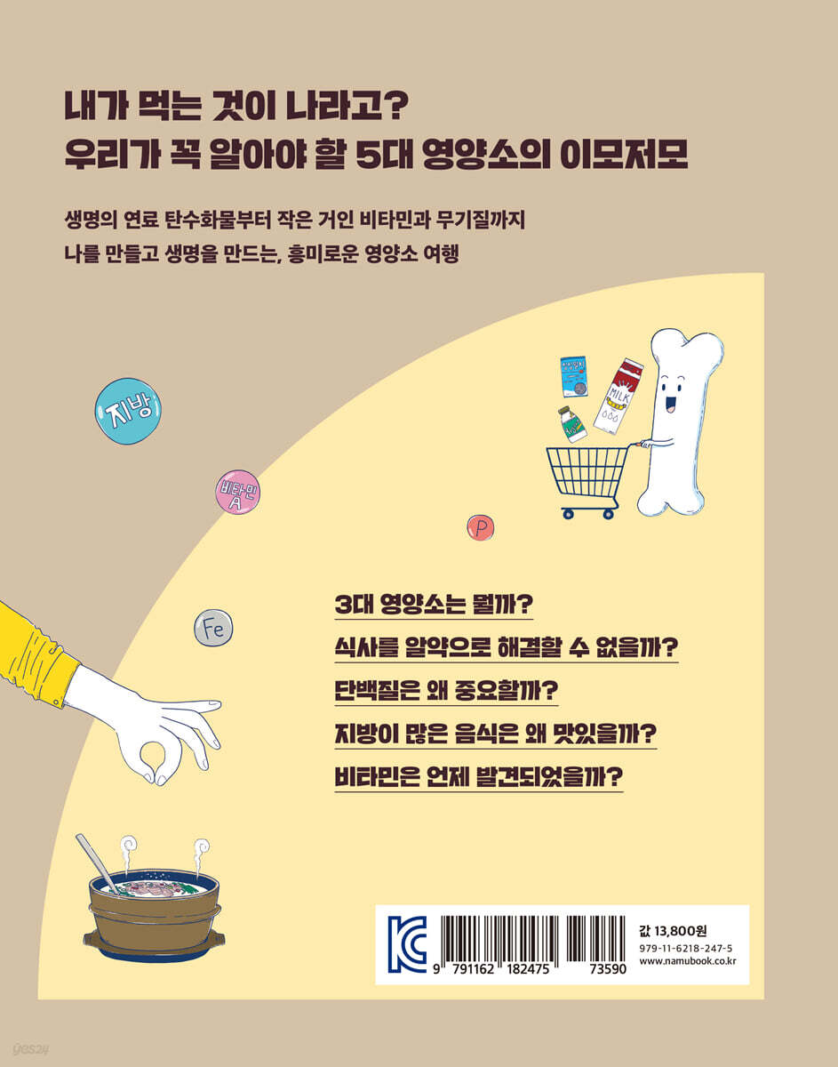 영양소는 우리 몸에서 어떤 일을 할까? 영양학의 시조는 프랑스의 화학자 앙투안 라부아지에예요. 18세기 후반에 살았던 그는 물질이 산소와 결합하는 ‘산화’라는 현상과 산소와 반응해서 에너지를 내는 ‘연소’의 과정을 연구해 화학사에 큰 업적을 남긴 인물이죠. 라부아지에는 우리가 음식을 소화시키는 것 역시 산소와 음식물이 반응해서 연소하는 것과 비슷하다는 사실을 알아냈어요. 이러한 연구를 바탕으로 탄수화물, 지방, 단백질이라는 3대 영양소가 밝혀졌고, 뒤를 이어 무기질 원소와 비타민도 발견되었지요. 우리의 주식인 쌀, 밀가루, 빵 등에 많이 들어 있는 탄수화물은 탄소, 수소, 산소로 이루어진 분자예요. 탄수화물은 소화 기관을 지나면서 잘게 분해되고 소화되어 포도당으로 변한 다음 에너지를 내는 연료로 사용되지요. 소고기, 돼지고기 등 고기에 많이 들어 있는 단백질은 동물의 몸을 구성하는 물질이에요. 단백질은 아미노산으로 이루어져 있는데 특히 필수 아미노산은 우리 몸에서 만들어 내지 못하기 때문에 꼭 음식으로 먹어야만 해요. 단백질은 효소, 항체, 근육 세포, 콜라겐 등을 만들기 때문에 매우 중요해요. 그래서 인류는 고기를 좋아하도록 진화하게 되었죠. 튀김 음식을 생각할 때 떠오르는 지방은 현대인들이 많이 걱정하는 영양소예요. 지방이 있는 음식은 맛있기는 하지만 몸에 좋지 않기도 하니까요. 지방은 1g에 9kcal를 내는 아주 효율적인 영양소예요. 하지만 동물성 지방에 많이 들어 있는 콜레스테롤은 혈관을 막아 동맥 경화증이나 심장병, 뇌졸중을 일으키는 원인이 되기도 하고, 가공식품이나 과자에 많이 들어 있는 트랜스 지방도 몸에 나쁜 영향을 주어요. 이외에도 아주 적은 양이지만 꼭 필요한 비타민과 무기질에 대해서도 알기 쉽게 설명해 주는 이 책은, 과학 지식과 함께 내 몸을 지키는 훌륭한 안내서가 되어 줄 거예요. · 교과연계 초등 5-1 과학 5. 다양한 생물과 우리 생활 초등 6-1 과학 4. 식물의 구조와 기능 초등 6-2 과학 4. 우리 몸의 구조와 기능 중1 과학 Ⅴ. 물질의 상태 변화 중2 과학 Ⅰ. 물질의 구성 중2 과학 Ⅳ. 식물과 에너지 중2 과학 Ⅴ. 동물과 에너지 |