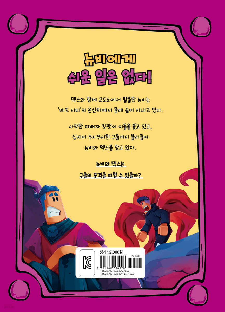 상상력을 키우는 동화로 만나자! 하루 평균 4000만명 이상이 이용하고 있는 게임인 ‘로블록스’는 전 세계 어린이들에게 사랑받고 있다. 로블록스 안에서 자신의 캐릭터를 꾸미고 친구들과 게임을 하는 로블록스는 가상세계를 말하는 메타버스의 대표주자로 꼽힌다. 『뉴비의 로블록스 모험 일기』를 통해 게임으로만 즐기던 로블록스를 상상력이 커지는 이야기로 만나보자. 뉴비의 모험 이야기를 따라 책을 읽다 보면 게임의 흥미를 넘어 읽기의 재미를 느낄 수 있다. 게임을 하는 것처럼 생동감 넘치는 묘사와 비유는 상상력을 자극한다. 이야기를 상상하다 보면 상상력과 창의력도 커지는 계기가 될 것이다. 책 읽기가 어려웠던 어린이에게도 동화책을 읽을 수 있는 시작이 될 수 있으며 읽기 능력의 향상과 성취감을 얻을 수 있다. 게임보다 재미있는 뉴비의 모험 이야기를 읽어 보자! 덱스와 함께 ‘매드 시티’의 교도소를 탈출한 뉴비는 은신처에 숨어서 지내고 있다. 숨어 지내는 동안, 매드 시티에서 가장 위협적이고 무시무시했던 덱스는 하루 종일 소파에 누워 과자를 먹으며 텔레비전을 보는 한심한 인간이 되었다. 그러던 어느 날, 등에 어마어마한 촉수가 있는 구울이 도시를 파괴하며 뉴비와 덱스를 찾고 있다는 소식을 듣게 된다. ‘매드 시티’의 끔찍한 범죄 왕인 킹팻이 뉴비와 덱스를 잡기 위해 불러들인 구울은 뉴비와 덱스를 공격하는 것에 그치지 않고 ‘매드 시티’를 파괴해버리고 있다. 뉴비와 덱스는 구울의 공격을 막고 ‘매드 시티’도 지킬 수 있을까? “함께라면 어떤 문제도 헤쳐 나갈 수 있어!” 뉴비의 모험과 함께 협동심과 사회성을 배워 보자! 뉴비는 덱스와 함께 구울의 공격을 막고 ‘매드 시티’를 지키고자 한다. ‘매드 시티’를 지키고 싶은 허먼 경찰 서장과 뉴비의 옛 친구인 메이저 크리에이티브까지 힘을 합쳐 구울을 막아낸다. 티격태격 의견이 안 맞을 때도 있지만 함께 힘을 합친다면 어려운 일도 잘 해결할 수 있는 협동심을 배울 수 있다. 또 뉴비는 생각이 다른 덱스를 이해하기도 하고 설득하기도 한다. 뉴비의 모험 이야기를 읽다 보면 친구들 사이에서 지켜야 하는 배려를 알 수 있고, 친구들과 함께라면 더욱 커지는 용기를 느끼며 우정의 소중함도 생각하게 된다. |