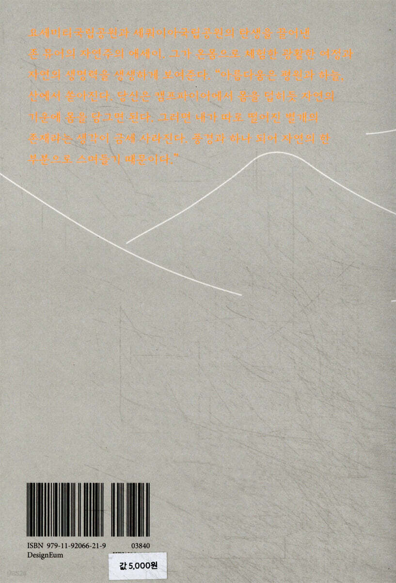 --- p.97 애호가들에게는 이 산들이 100마일이나 멀게 느껴지지 않는다. 산의 정기와 하늘의 선량함이 이 산들을 절친한 친구처럼 가깝게 느끼도록 해주기 때문이다. 산들은 벽처럼 이곳 분지를 둘러싼 언덕들의 일부인 듯 서 있다. 이곳은 야외에 나온 느낌이 들지 않는다. 당신이 느끼는 아름다움은 평원과 하늘, 산에서 쏟아진다. --- p.104 세쿼이아나무가 세상에서 가장 큰 나무라면, 시에라의 갈색곰 또는 회색곰은 말하자면 동물들 가운데 세쿼이아에 해당한다. 시에라 곰은 요세미티국립공원 전역을 저벅저벅 걸으며 돌아다니지만 그를 만나는 즐거움을 누리는 여행객은 드물다. 그는 웅장한 숲과 협곡 어디에서든 날씨와 상관없이 편안하게 자신의 강한 힘을 만끽하며 나무와 바위, 덥수룩한 수풀과 조화롭게 잘 지낸다. 참으로 행복한 친구 아닌가! 이토록 유쾌한 곳에 그의 가문이 뿌리내렸으니 말이다. --- p.161 몇몇 사슴 종은 어디에서건 자기 집 안방처럼 편안해 보인다. 땅이 거칠든 매끈하든, 저지대든 고지대든, 습지든, 척박한 곳이든, 빽빽한 숲이든, 덥든 춥든, 어떤 날씨에나 대륙 어디에서나 빛나는 건강을 유지하며 절대로 서투른 발걸음은 내딛지 않는다. 서 있을 때나 누워 있을 때나, 걸을 때나 먹이를 먹을 때나, 목숨을 건지기 위해 줄행랑을 칠 때조차 흐트러짐 없이 우아한 자태를 유지하며 그 어떤 풍경에도 아름다움과 생기를 더해준다. 사슴이야말로 매력적인 동물이며 대자연이 낳은 멋진 자랑거리다. --- p.179 날씨가 잔잔하면 이 호수는 주변 숲과 산, 하늘을 담아내는 기막히게 멋진 거울이 된다. 그러다 때에 따라 우박과 비가 후두두 내리기도 하고, 갑작스러운 폭풍에 파도가 일어 연안 경계에 있는 자갈과 모래를 씻어내기도 한다. 호수 동쪽과 남쪽에 있는 애브사러카산맥과 윈드리버고원에 모인 물이 옐로스톤호수 안으로 쏟아져 들어간 뒤 호수 북쪽 측면에서 옐로스톤강이 되어 넓고 잔잔하고 위엄 있게 흘러나온다. --- p.221 야생 사과나무Pyrus rivularis는 멋지고, 튼튼하고, 잘생긴 사랑스러운 나무다. 비버초원 가장자리나 하천을 따라 비옥하고 서늘한 토양에서 잘 자란다. 캘리포니아주에서 오리건주와 워싱턴주를 거쳐 알래스카주 남동부에 이르기까지 분포한다. 오리건에서는 빽빽하게 엉킨 덤불을 이루는데, 뚫고 들어갈 수 없는 경우도 있다. 가장 큰 나무의 몸통 지름이 1피트에 이른다. 꽃이 피면 풍성하게 무리 지은 향기로운 흰색 꽃들이 멋진 구경거리를 제공한다. 열매는 크기가 무척 작고 신맛이 지독하게 강하지만 몸에는 좋다. 새와 곰, 인디언뿐만 아니라 모험을 즐기는 크고 작은 생명체들이 즐겨 먹는다. --- p.292 |