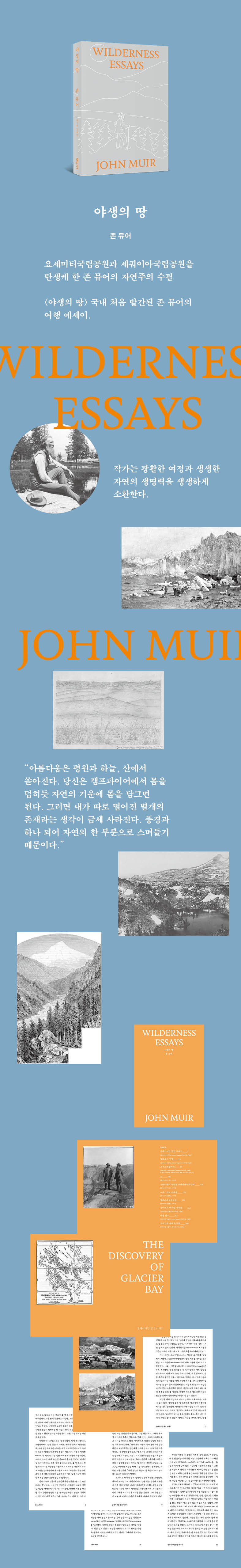 요세메티의 인자한 거인, 존 뮤어의 수필집이 국내에서 처음으로 출간되었다. 존 뮤어는 스코틀랜계 미국인, 환경보호가이자 수필가, 세계적인 규모의 환경단체인 시에라 클럽의 창립자이자 초대 회장이다. 1889년 존 뮤어는 [센츄리 매거진]의 편집장인 로버트 존슨을 초청하여 요세미티를 국립공원으로 지정해야 하는 이유와 방법을 이야기했고 결국 1890년 요세미티가 국립공원으로 지정되었다. 그는 숲과 국립공원의 보존에 일생을 헌신하였으며 자연의 아름다움을 지지하는 많은 이들의 열렬한 옹호를 받고 있다. 광활한 자연에 대한 깊고 섬세한 관찰 존 뮤어는 가방에 로버트 번스의 시집과 밀턴의 〈낙원 상실〉, 신약 성서와 일기장을 챙겨 긴 여행을 떠났다. 그는 자신이 본 것과 그것을 보면서 느꼈던 바를 글로 표현하기 시작했다. 그의 글에는 빙하와 진흙, 숲과 동물들, 뮤어는 지질학적 특징과 자연에서 마주칠 수 있는 식물과 동물, 새, 날씨가 세심하게 묘사되어 있다. “골짜기의 사계절은 늘 따뜻하고 환하며 1년 내내 꽃이 만개한다. 그래도 매년 식물과 곤충의 생명을 잉태하는 원대 한 시작은 12월과 1월에 비가 내리는 것으로 대장정의 막을 올린다. 비와 함께 뜨겁고 뿌옇던 공기가 깨끗해지고 시원해진다. 그러면 여섯 달 동안 농부의 곡식 통에 있었던 것처럼 건조한 상태로 대지에 놓여 있던 식물의 씨앗이 보물과 같은 생명을 활짝 펼친다. 마치 겉껍질에서 떡잎이 나오듯 나비는 번데기에서 나온다. 계곡과 골짜기로 그물망처럼 뻗은 메마른 물줄기에 갑자기 맑은 물이 쏟아진다. 먼지가 수북이 앉은 미라가 죽은 자들 가운데서 다시 살아나 혈색 도는 얼굴로 웃는 것처럼 투명한 물이 반짝이며 이 못에서 저 못으로 쏟아져내린다.” “세쿼이아나무가 세상에서 가장 큰 나무라면, 시에라의 갈색곰 또는 회색곰은 말하자면 동물들 가운데 세쿼이아에 해당한다. 시에라 곰은 요세미티국립공원 전역을 저벅저벅 걸으며 돌아다니지만 그를 만나는 즐거움을 누리는 여행객은 드물다. 그는 웅장한 숲과 협곡 어디에서든 날씨와 상관없이 편안하게 자신의 강한 힘을 만끽하며 나무와 바위, 덥수룩한 수풀과 조화롭게 잘 지낸다. 참으로 행복한 친구 아닌가!” 자연을 사람들에게 돌려주다 존 뮤어는 ‘내 삶의 유일한 목적은 사람들이 대자연의 사랑스러운 모습에 시선을 돌리게 하는 것’이라고 밝혔다. 그는 풍경 묘사뿐만 아니라 자연 경관과 인간의 관계를 담아내려 애썼다. 그의 글에는 광활하고 기나긴 여정과 위험, 인간의 힘을 초월한 자연의 생명력이 생생하게 소환된다. 그의 에세이 ‘알래스카 여행’에서 뮤어는 알래스카의 아름다움을 극찬하고 관광객들의 방문을 권유했다. 독자들은 그의 발자취를 따라 그가 그토록 설득력 있게 묘사했던 지역들을 찾고 싶어진다. 뮤어 글은 자연의 아름다움을 칭송하는 데에서 더 나아가 삶의 지혜와 나아갈 길을 안내하는 지침서로 오늘날에도 많은 여행자의 사랑을 받고 있다. “아름다움은 평원과 하늘, 산에서 쏟아진다. 당신은 캠프파이어에서 몸을 덥히듯 자연의 기운에 몸을 담그면 된다. 그러면 내가 따로 떨어진 별개의 존재라는 생각이 금세 사라진다. 풍경과 하나 되어 자연의 한 부분으로 스며들기 때문이다.” |