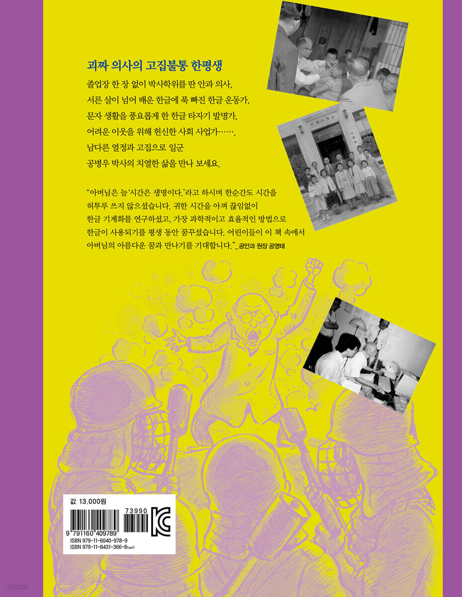 어린이를 위한 인물 평전 ‘한겨레 인물탐구’ 시리즈의 아홉 번째 책으로《공병우, 한글을 사랑한 괴짜 의사》가 출간되었다. 이 책은 우리나라 최초의 개인 안과 ‘공안과’를 세운 의사이자 세벌식 자판을 개발한 한글 타자기 발명가였던 공병우의 개성 있는 삶을 그렸다. 어린이들에게 공병우는 낯선 인물이다. 그가 발명한 타자기는 전 시대의 유물이 된 지 오래이며, 생전에 그토록 꿈꾸었던 세벌식 자판의 표준화도 오늘날에는 공허한 외침이 되어 버렸다. 그럼에도 어린이들에게 이 인물의 삶을 소개하는 이유를 작가는 한글 기계화의 혜택에서 찾고 있다. 전 세계에서 가장 낮은 문맹률을 바탕으로 우리나라가 교육, 문화, 정보 통신 분야에서 빠른 발전을 이루게 된 데는 한글이 우수한 글자인 덕도 있지만, 한글 기계화를 향한 열정 어린 노력들이 있었기 때문이다. 실용적인 타자기 발명, 워드프로세서와 소프트웨어의 개발, 서체 개발 등이 가져온 문화적 혜택은 우리 삶에 혁신을 가져왔다. 그러한 기계화?전산화의 첫 발을 뗀 사람이 바로 공병우이다. 한편, 열정과 고집으로 똘똘 뭉친 공병우의 삶은 그 자체로 많은 이야기를 담고 있다. 가장 인간적이며 개성 있는 삶의 궤적을 그리고 간 공병우의 전기가 어른, 어린이 모두에게 매력 있게 읽히는 이유이다. 고집쟁이 시골 소년, 의사가 되다 공병우는 1907년 평안북도 한 시골 마을에서 태어났다. 죽을 고비를 넘기고 귀하게 자라 어려서부터 고집도 세고 욕심도 많았다. 학창시절에는 선배한테 대들며 칼부림도 하고, 보란듯이 학교를 비판하는 글을 발표하는 ‘트러블 메이커’였다. 농업학교 2학년 때 일본인 교장 선생님의 권유로 의학도의 길을 찾아, 독학으로 평양의학강습소에 입학했다. 공병우는 기세를 몰아 의학강습소를 졸업하기도 전에 의사 자격시험을 통과한다. 열세 살 때 보통학교 1학년에 입학해 스무 살에 의사가 되었으니 7년 만에 초, 중, 고등학교와 대학 과정을 모두 끝내 버린 셈이다. 물론 졸업장은 한 장도 받지 못했다. 의사가 된 뒤에도 도전은 계속됐다. 공병우는 의사로서 누릴 수 있는 편안한 삶을 버리고 경성의전에 견학생으로 들어가 병리학을 연구했다. 특유의 끈기와 열의로 연구에 파고든 그는 망막 질환에 대한 논문으로 나고야대학 박사 학위까지 받았다. 우리나라 의학박사를 손으로 꼽을 수 있을 정도였던 시절이었다. 1938년 공병우는 서울 안국동에 ‘공안과’를 열었다. 우리나라 최초의 개인 안과 병원이었다. 타자기와 한글 연구에 일생을 바치다 젊은 의사 공병우는 그 무렵 독립운동가 이극로 선생으로부터 한글을 처음 접한다. 일제강점기에 서른 평생을 보낸 그는 한글을 제대로 배운 적이 없었다. 줄곧 일본어로 교육을 받았고, 더욱이 의학을 공부하면서는 한글로 된 책이나 글은 접해 보지 못했다. 한글로 우리 민족이 글눈을 뜨고 문화의 힘을 기를 수 있다는 이극로 선생의 말에 자극을 받은 공병우는 곧장 한글을 배워 활용하기 시작했다. 눈병 예방 안내문을 한글로 만들어 나누어 주고, 한글로 시력검사표를 만들기도 했다. 또, 일본어로 쓴 안과학 교과서를 우리말로 옮겨 펴내기도 했다. 타자기에 관심을 가지기 시작한 것도 그 즈음이다. 당시 영문 타자기는 국내에 꽤 들어와 있었지만, 한글 타자기는 구경하기 힘든 시절이었다. 앞서 개발된 한글 타자기는 속도가 느리고 불편해 실용화에 실패했다. 영어와 전혀 다른 한글의 생성 원리를 타자기에 반영하지 못한 탓이었다. 공병우는 병원 일도 제쳐 놓고 밤낮으로 연구에 매달린 끝에 ‘세벌식 쌍초점 한글 타자기’를 세상에 내놓는다. 공병우 타자기는 정부 기관과 미군청에서 쓰기 시작해 한국전쟁 이후에는 일반 기업과 개인들에게까지 널리 보급된다. 1960~70년대 산업화의 물결이 한국 사회를 뒤흔들던 분위기와 맞물려 타자기는 날개 돋친 듯 팔려나갔다. 공병우는 사업가로서도 큰 성공을 거두었다. 타자기 사업에 손을 떼고 안과 의사로 돌아갔던 공병우를 학글학계로 다시 불러낸 것은 1969년에 있었던 정부의 ‘자판 표준안’ 발표였다. 평소 잘못된 일이라면 쓴소리를 아끼지 않는 공병우가 눈엣가시였던 정부는, 가장 보편적으로 쓰이던 공병우 타자기를 배제하고 비합리적인 네벌식 자판을 표준안으로 내놓았던 것이다. 공병우와 각계 전문가들은 일제히 정부를 비판하고 나섰지만 정부는 힘과 권력으로 그들의 손과 발을 묶었다. 1983년에 다시 두벌식 자판이 표준안으로 채택되면서 세벌식 자판은 세상의 관심에서 멀어져 갔다. 공병우는 포기하지 않고 세벌식 자판 보급에 힘쓰며, 전동 타자기?점자 타자기 발명, 워드프로세서 개발, 한글 연구기관 설립, 서체 개발 등 한글 기계화를 위해 지속적인 노력을 기울였다. 또 한편으로는 소외 계층의 시각장애인들에게 개안수술을 해 주고 장애인의 자립을 돕는 등 사회 사업에도 적극적으로 참여했다. 공병우의 삶이 우리에게 준 것들 1995년 공병우가 세상을 떠나며 남긴 말은 ‘내 무덤을 만들 땅에 차라리 콩을 심어라.’였다. 겉치레를 싫어하고 효율과 실용성을 중시하던 그의 성격이 보이는
