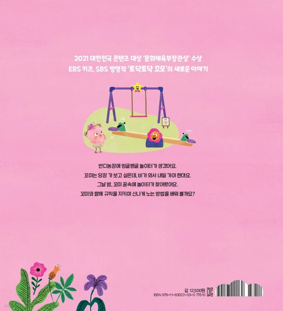 반디농장에 빙글뱅글 놀이터가 생겼어요. 꼬미는 당장 가 보고 싶은데, 비가 와서 내일 가야 한대요. 그날 밤, 꼬미 꿈속에 놀이터가 찾아왔어요. 꼬미와 함께 규칙을 지키며 신나게 노는 방법을 배워 볼까요?