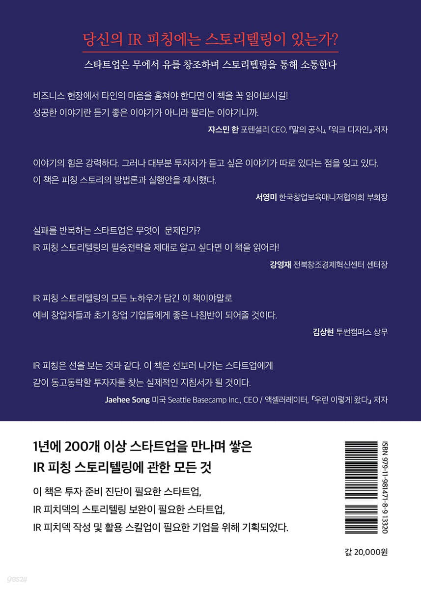 이 책의 진가는 스타트업 IR 피칭의 스토리텔링 활용법을 투자자의 관점에서 완벽하게 정리했다는 것이다. 나는 이 책을 피칭의 원칙과 공식을 제시한다는 점에서, 스타트업에 몸담은 누구라도 꼭 읽어야 할 필수 지침서라고 생각한다. 일독을 권한다. - 고은산 (와이앤아처 상무, 스타트업 액셀러레이터)