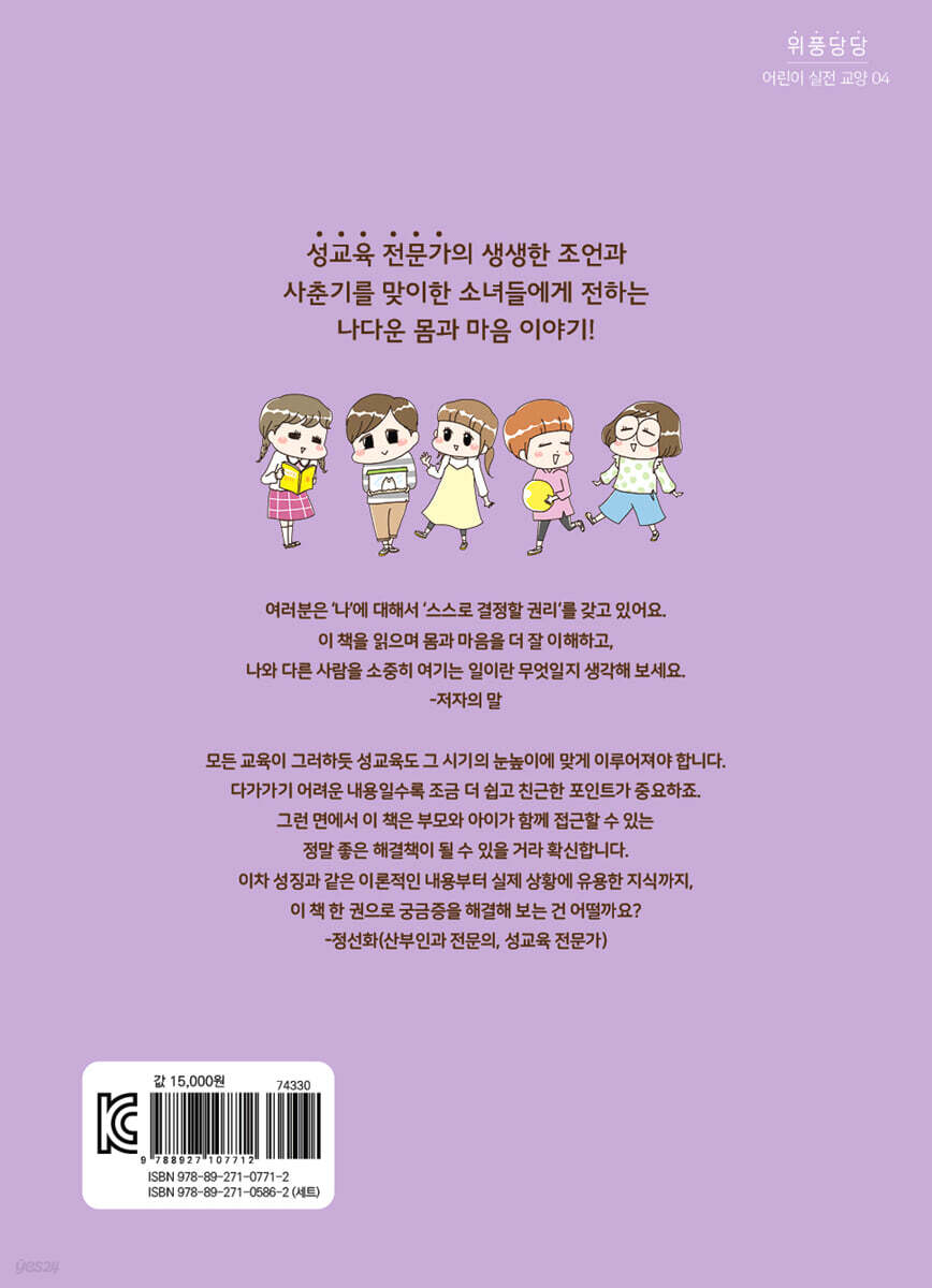 모든 교육이 그러하듯 성교육도 그 시기의 눈높이에 맞게 이루어져야 합니다. 다가가기 어려운 내용일수록 조금 더 쉽고 친근한 포인트가 중요하죠. 그런 면에서 이 책은 부모와 아이가 함께 접근할 수 있는 정말 좋은 해결책이 될 수 있을 거라 확신합니다. 이차 성징과 같은 이론적인 내용부터 실제 상황에 유용한 지식까지, 이 책 한 권으로 궁금증을 해결해 보는 건 어떨까요? - 정선화 (산부인과 전문의, 성교육 전문가)