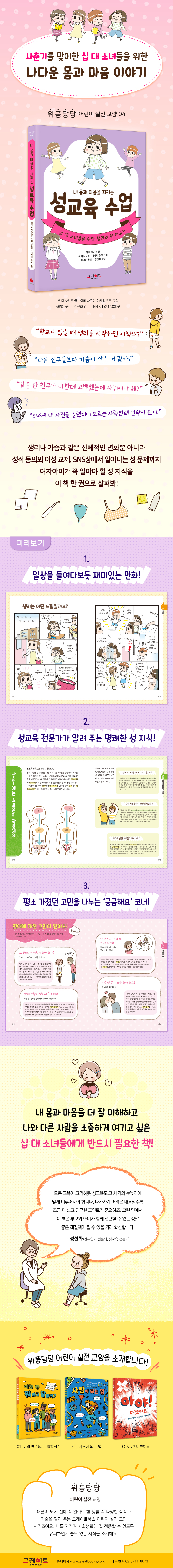 『내 몸과 마음을 지키는 성교육 수업』은 생리를 비롯한 이차 성징과 성적 동의, 이성 교제와 디지털상에서 일어나는 성 문제까지 십 대 소녀들이 알아야 할 성 지식을 빠짐없이 다루고 있어요. 산부인과 의사이자 최고의 성교육 전문가가 알려 주는 성 지식을 공감을 불러일으키는 만화, 솔직하면서도 명쾌한 설명과 함께 살펴보세요. 내 몸과 마음을 더 잘 이해하고, 나와 다른 사람을 소중히 여기는 일이란 무엇일지 배울 수 있을 거예요.