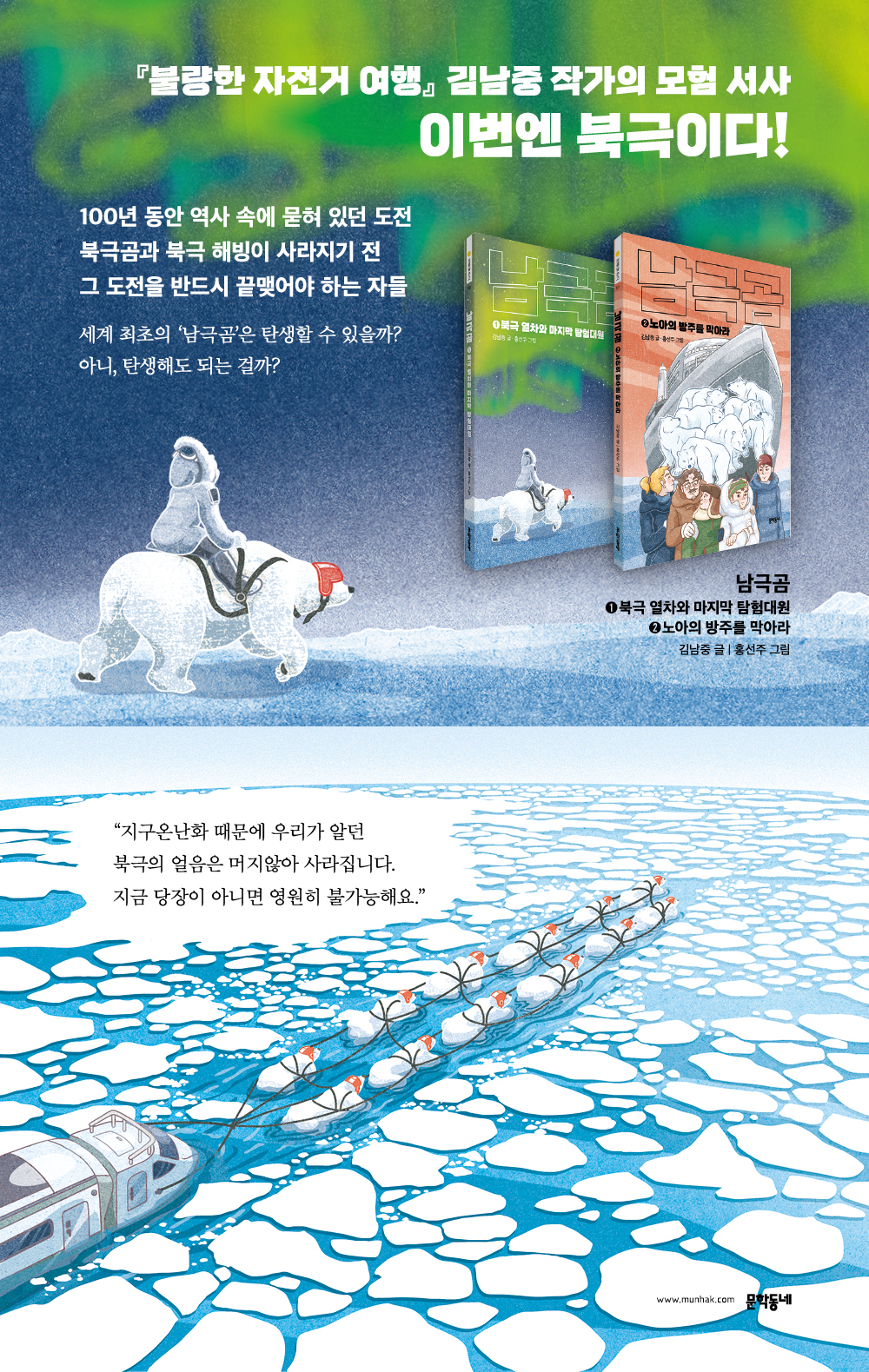 북극곰과 북극 해빙이 사라지기 전 그 도전을 반드시 끝맺어야 하는 자들 갈수록 더워지는 이상기후로 서울의 아파트 화단에서 작은 바나나 한 송이가 모습을 드러낸다. 은우는 야생동물 사진작가인 엄마가 북극에 출장 간 동안 키워 낸 바나나를 자랑할 생각에 들떠 있다. 그러던 어느 날 엄마의 실종 소식을 접하고, 은우는 엄마가 살아 있다는 희망 하나로 아빠와 북극행을 결심한다. 특전사 출신의 엄마는 3천 미터 하늘에서도 웃으며 고공낙하를 할 수 있는 사람이니까. 하와이를 거쳐 알래스카에 발을 디딘 은우와 아빠. 사람 하나 없이 바람만 부는 마을은 여름인데도 춥게만 느껴진다. 은우는 아빠 모르게 엄마와 같이 실종된 현지 가이드의 집을 찾아갔다가 가이드의 손자 미카를 만난다. 북극 환경이 익숙해 보이는 미카와 은우는 실종된 엄마와 할아버지를 찾기 위해 북극해로 나아간다. 목숨 걸고 몸싸움을 하는 야생의 북극곰들, 그리고 북극에서는 마주칠 수 없는 뜻밖의 존재에 시선을 빼앗긴 순간 두 아이는 어디론가 납치되고, 그곳에서 엄마, 할아버지와 재회하는 동시에 눈으로 보아도 믿기지 않는 것들을 목격한다. 곧 이 비밀 기지를 지휘하는 척과 그의 대원이 하나둘 등장하면서 ‘북극 열차’ 프로젝트의 실체가 드러난다. 로알 아문센이 북극점 최초 도달을 위해 비밀리에 시도했다 실패해 역사의 뒤안길로 사라졌던 북극곰 썰매 작전이 당시 곰 조련사였던 비에른의 후손들을 통해 이어지고 있었던 것. 은우가 마지막 대원으로 탑승하며 북극 열차는 모든 출발 준비를 마친다. “사람들은 갖가지 방법으로 북극점에 도달했어요. 썰매로, 비행기로, 열기구로, 오토바이로, 스노모빌로, 심지어 스키를 신고 걸어서 간 사람도 있어요. 그렇지만 북극곰이 끄는 열차로 도전한 사람은 없어요. 위대한 아문센의 도전이 우리 식으로 완성되는 거예요.” _본문 중에서 “지구온난화 때문에 우리가 알던 북극의 얼음은 머지않아 사라집니다. 지금 당장이 아니면 영원히 불가능해요.” _본문 중에서 아슬아슬 무모해 보이는 북극 열차는 여러 사람들의 기대와 우려를 실은 채 거칠고 새하얀 북극을 밤낮없이 달린다. 하루는 녹은 팥빙수 같은, 하루는 꽁꽁 얼어붙은 아이스바 같은 얼음길을 달리며 은우는 탐험대원들과도 북극곰들과도 조금씩 교감해 나간다. 미끄러운 경사 길에서는 북극곰들과 함께 힘을 합쳐 썰매를 끌고, 지구의 머리 꼭대기에 있는 낯선 별자리들을 하나하나 눈에 담으며 ‘진짜 탐험대원’이 되어 간다. 하지만 북극열차는 북극점을 눈앞에 두고 생각지 못한 벽에 부딪히는데……. 세계 최초의 ‘남극곰’은 탄생할 수 있을까? 아니, 탄생해도 되는 걸까? 누군가에게는 평생의 숙제, 누군가에게는 최종 목적을 위한 디딤돌, 누군가에게는 탈출을 위한 동행이었던 북극점 도달. 그러나 은우는 북극 열차 뒤에 가려진 척의 진짜 계획을 알게 된다. 작전명은 ‘노아의 방주’, 북극곰들을 남극으로 보내 최초의 ‘남극곰’을 만드는 것. 멸종 위기에 처한 북극곰과 망가져 가는 북극을 살리고 싶은 마음은 모두 같지만 그 방법에 대해서는 생각이 달랐던 인물들은 결국 팽팽히 맞선다. 세상에 없던 ‘남극곰’을 탄생시키려는 이들과 그 계획을 어떻게든 막으려는 이들이 대치하고, 여기에 은우네 일행의 탈출 계획까지 맞물리면서 긴장감은 한층 더 고조된다. “나는 노아의 방주에 내 인생을 걸었어. 정말 북극을 위한다면 그쪽도 행동을 하지 그래? 입으로만 생색내지 말고 재산이나 목숨 같은 걸 좀 걸어 봐.” VS “자연은 사람이 보지 못하는 부분까지 연결되어 있어. 거기에 사람이 끼어들면 더 엉망이 돼. 우리가 지구에서 만든 문제는 우리가 지구에서 해결해야지.” 오늘의 북극을 배경으로 한 도시 아이의 모험이 우리에게 건네는 무궁무진한 질문 여행보다 피시방 게임이 좋고, 도전보다 편안함을 추구하던 은우에게 북극에서의 사건들은 강렬한 인생 경험이 된다. 광활한 자연 속에서, 함께하는 이들에게서 끊임없이 영향을 받는 은우는 점점 대담해지고, 스스로를 넘어 사방의 존재에게로 시선을 넓혀 나간다. 얼음평원에서 마지막 곰과 단둘이 오로라를 만나는 순간은 은우가 이루어 낸 성장만큼 눈부시고 경이롭기 그지없다. 집과 학교를 오가는 일상 속에서는 상상조차 할 수 없었던 일들을 겪으며 은우는 자신과 세상이 얼마나 촘촘하게 연결되어 있는지를 온몸으로 깨우친다. 이 이야기는 극지라는 낯선 공간, 기후위기라는 당면한 주제를 다루며 아이들의 모험 본능을 자극하는 동시에 함께 살아가기 위한 노력에 대해 깊이 생각하게 한다. 북극곰과 북극의 현실을 두고 각자의 방향대로 치열하게 고민하는 인물들의 속사정을 들여다보면, 함께 힘을 모아 세상을 더 좋은 쪽으로 변하게 할 수 있다는 희망이 마음 한편에 심길 것이다. 꼼꼼한 취재와 온몸의 경험으로 쓴 이야기 북극의 구석구석을 탐험해 보는 시간 김남중 작가는 집필 전 북극곰을 직접 만나기 위해 우리나라 최초의 쇄빙연구선 ‘아라온호’에 탑승했다. 치밀한 사전조사와 함께 북극해의 차가운 바닷바람을 