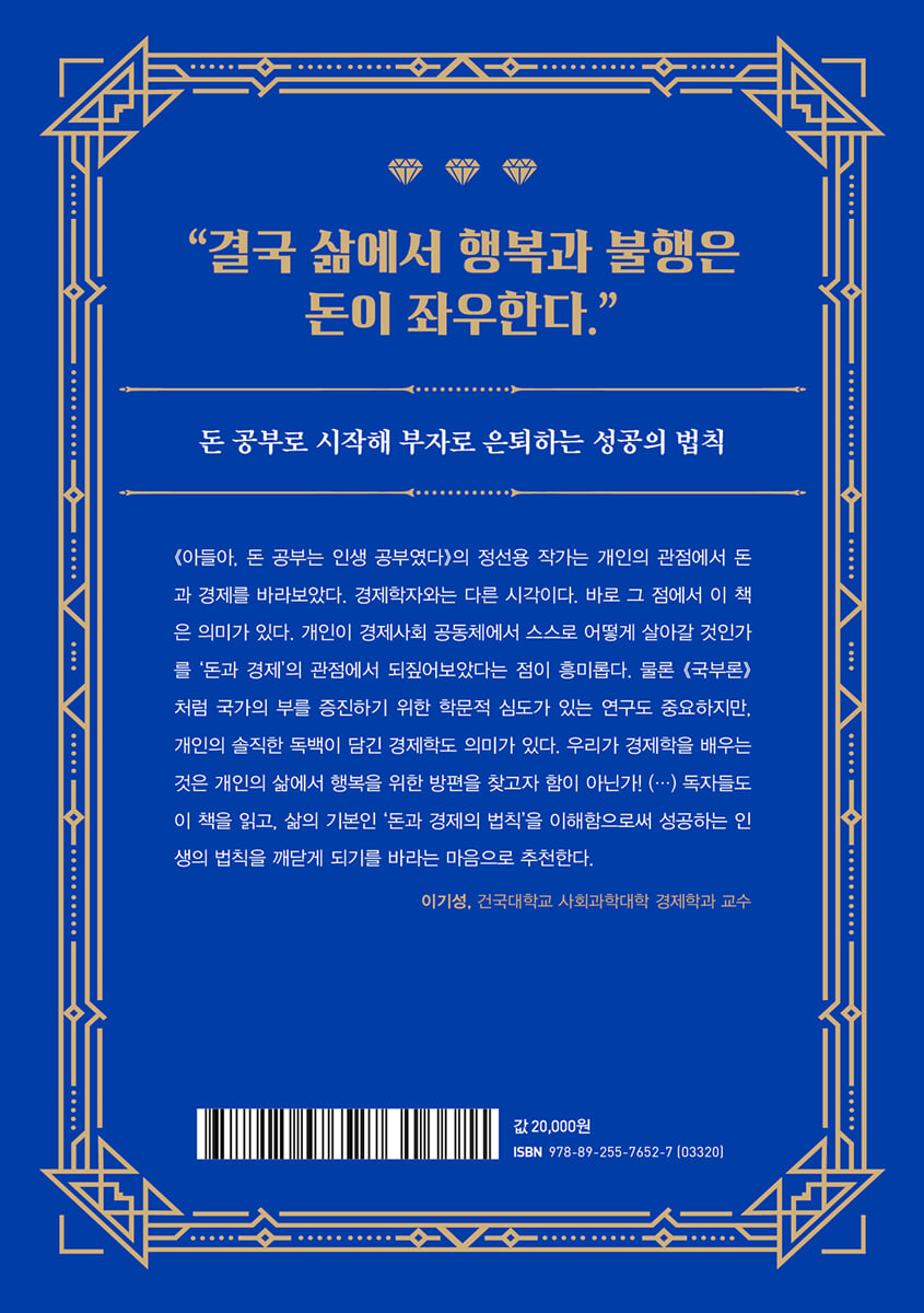 『아들아, 돈 공부는 인생 공부였다』의 정선용 작가는 개인의 관점에서 돈과 경제를 바라보았다. 경제학자와는 다른 시각이다. 바로 그 점에서 이 책은 의미가 있다. 개인이 경제사회 공동체에서 스스로 어떻게 살아갈 것인가를 ‘돈과 경제’의 관점에서 되짚어보았다는 점이 흥미롭다. 물론 『국부론』처럼 국가의 부를 증진하기 위한 학문적 심도가 있는 연구도 중요하지만, 개인의 솔직한 독백이 담긴 경제학도 의미가 있다. 우리가 경제학을 배우는 것은 개인의 삶에서 행복을 위한 방편을 찾고자 함이 아닌가! (…) 독자들도 이 책을 읽고, 삶의 기본인 ‘돈과 경제의 법칙’을 이해함으로써 성공하는 인생의 법칙을 깨닫게 되기를 바라는 마음으로 추천한다. - 이기성 (건국대학교 사회과학대학 경제학과 교수)
