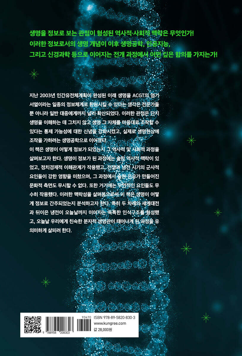 이 책은 우선 생명을 정보로 보는 관점이 형성된 역사적 및 사회적 맥락을 전체적으로 훒으며 재구성해보고 있으며, 이러한 정보로서의 생명 개념이 이후 생명공학, 인공지능, 신경과학 등으로 이어지는 전개과정에서 어떤 깊은 의미를 내포하고 있는지 밝히고, 그것이 오늘날 신자유주의와 전 지구적 생명 상업화에 어떻게 영향을 미쳤는지를 살펴보고 있다. 1부는 생명을 정보로 표상할 수 있고, 이 정보를 해석해서 생명이라는 정보체계를 읽을 수 있다는 생각이 수립된 냉전 시기를 중심으로 사이버네틱스, 정보 이론, 컴퓨터 과학, 게임이론 등의 연구에서 나타난 인식적 경향을 토대로 ‘정보로서의 생명’이라는 개념의 출현과정을 고찰한다. 이들 냉전 시대의 전후 테크노사이언스가 기본적으로 가지고 있던 전제들이 분자생물학을 정보과학으로 만든 중요한 원인이었음을 밝히려는 것이다. 2부는 생명 정보 개념이 확장되면서 오늘날 우리에게 중요한 의미를 가지게 된 여러 과학 분야들로 체화된 과정을 살펴본다. 일차적으로 생명공학이 수립되고 그 실행양식과 산물이 상업화 경향과 결합하면서 보건, 의료를 비롯해서 시민사회에 미치는 영향을 고찰한다. 또한 1990년대 이후 신경과학과 인공지능 등의 새로운 전개양상 속에서 이러한 개념이 어떻게 심화 발전했는지 살펴본다. 오늘날 과학의 상업화, 또는 과학의 전 지구적 사유화 체제의 심화는 생명 그 자체를 대상화하고 있다. 이러한 상업화와 사유화의 뿌리에서 정보로서의 생명 개념이 어떤 인식적 기반을 제공하는지 밝히려 한다. |