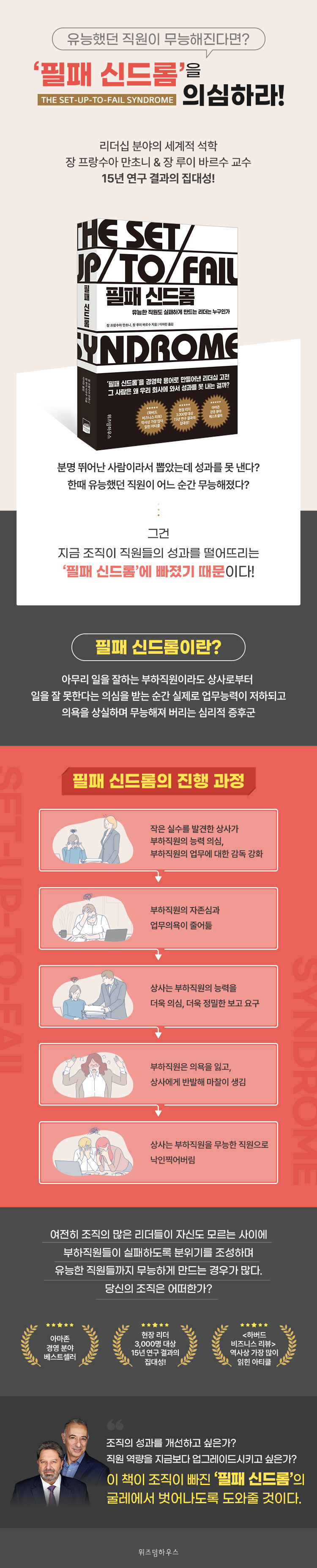 [하버드 비즈니스 리뷰] 역사상 가장 많이 읽힌 아티클전 세계 리더들이 극찬한 리더십 분야 최고 교수들의 역작!현장 리더 3,000여 명을 대상으로 한 15년 연구 결과의 집대성!리더십 분야의 세계적 석학인 장 프랑수아 만초니 박사와 장 루이 바르수 박사는 15년이 넘는 시간 동안 상사와 부하의 관계에 대해 연구를 하다 상당히 흥미로운 현상을 포착한다. 아무리 일을 잘하는 부하직원이라도 상사로부터 일을 잘 못한다는 의심을 받는 순간 실제로 무능해진다는 것이다. 부하직원이 한 번 실패를 하거나 낮은 성과를 내면 상사는 직원이 성공할 의지가 없다거나 업무의 우선순위를 정하지 않았다거나, 혹은 지시를 따르지 않았다는 등 어떤 이유에서든 그에게 문제가 있다고 생각한다. 저자들은 성과가 낮은 직원으로 낙인찍힌 직원들은 상사의 낮은 기대치에 맞는 성과를 내게끔 유도되고, 결국에는 개인도 조직도 실패할 수밖에 없게 되는 역학구도를 ‘필패 신드롬(set-up-to fail syndrome)’이라 명명했다. 어느 조직이나 필패 신드롬을 피해갈 수 없는 이유는 심리학적으로 자신의 주관에 부합하는 정보만을 인식하려는 확증편향 때문이다. 《필패 신드롬: 유능한 직원도 실패하게 만드는 리더는 누구인가》는 개인이, 또 조직 전체가 어떻게 ‘필패 신드롬’에 빠져드는지 그 원인을 면밀히 파악하고, 필패 신드롬을 치료할 수 있는 처방전까지 제시해준다. 처음 [하버드 비즈니스 리뷰]에 실렸던 내용은 당시 엄청난 호응을 받으며, 역사상 가장 많이 읽힌 아티클이 되었다. 이후 현장 리더 3000여 명을 대상으로 15년 동안 연구한 결과가 바로 이 책이다.'필패 신드롬'을 경영학 용어로 만들어낸 리더십 고전유능했던 직원이 무능해진다면? 먼저 ‘필패 신드롬’을 의심하라철학자 프란시스 베이컨은 “의견이 생기기 시작하면 그것을 뒷받침할 만한 근거를 가능한 한 모두 찾아낸다. 우리의 관점에 반하는 근거를 보게 되면 간과하거나 폄하하거나 쓸모없는 것으로 생각할 만한 방법을 찾는다. 그래야 우리가 원래 갖고 있던 의견이 보편적인 진실인 것처럼 매달릴 수 있기 때문이다”라고 말했다. 필패 신드롬에 빠진 사람들은 이처럼 자기가 보고 싶은 것만 보고 믿고 싶은 것만 믿으려 한다. 그리고 이를 뒷받침할 만한 근거 찾기에만 집중한다. 심지어는 자기 생각이 틀렸다는 근거를 발견해도 이를 인정하지 않으려 하기 때문에 문제가 더욱 불거지게 된다.저자들은 필패 신드롬의 악순환에 빠지는 까닭이 ‘꼬리표’를 붙이는 과정과 관련이 있다는 사실을 알았다. 진화 심리학자들은 범주화가 석기 시대에 인간이 발달하고 생존할 가능성을 향상시켜주는 ‘능력’ 가운데 하나였다고 주장한다. 관리자 입장에서 보면 꼬리표 붙이기는 불확실하고 정보가 넘치는 환경에서 효율적으로 빠른 결정을 하는 데 도움을 주기 때문이다. 하지만 꼬리표를 신뢰할 수 없는 가장 큰 이유는 그 속도 때문이다. 리더들을 상대로 사람을 평가하는 데 얼마의 시간이 걸리는지에 대한 질문을 하자 10분에서 6개월까지 대답은 천차만별이었다. 꼬리표를 붙이는 속도가 빠르면 빠를수록 유능한 직원을 무능한 직원으로 낙인찍는 속도도 빨랐다.조직에서 유능하다고 평가받았던 직원이 갑자기 무능해진다면 무엇보다 ‘필패 신드롬’에 주목해야 한다. 필패 신드롬은 한 사람의 문제로 끝나지 않기 때문이다. 한 사람의 섣부른 확신에서 시작된 이 파장은 조직 전체를 무기력에 빠뜨리는 엄청난 파괴력을 갖고 있다. 관계의 문제에서 자유로울 수 없는 직장인이라면,단 한 명의 부하라도 있는 사람이라면, 반드시 읽어야 할 책!이 책을 먼저 읽은 독자들의 반응은 다양했다. 어떤 사람은 “내가 일부 부하직원에게 무슨 일을 했는지 이제 깨달았습니다”라는 반응을 보였는가 하면, 또 어떤 사람은 “제 상사가 제게 하는 반응이 바로 이런 식입니다”라며 공감을 표했다. “나와 둘째 아이 사이에서 벌어지고 있는 상황을 이해할 수 있게 되었습니다”라는 의외의 반응을 보이는 사람도 있었다. 필패 신드롬은 결코 조직에만 벌어지는 일이 아니라는 사실을 알 수 있다. 성적이 낮은 학생들을 대하는 교사, 성적이 나쁜 선수들을 대하는 코치 등 필패 신드롬은 누구나 쉽게 걸릴 수 있었다.저자들은 필패 신드롬이라는 병은 반드시 고칠 수 있다고 말한다. 처음부터 부하직원의 의욕을 꺾으려고 적극적으로 노력하는 사람은 없다는 것이다. 상사든 부하직원이든 스스로 자신이 추측하고 확신하는 생각이 맞는지 의문을 던지는 데서 해결의 실마리를 찾을 수 있을 것이다. 이 책은 섣부른 확신, 성급한 결론, 일방적인 간섭이 아닌 상사와 부하, 교사와 학생, 코치와 선수가 서로를 격려하고 지원해줌으로써 더 나은 성과와 결과를 가져오는 답을 제시해준다. 우리는 누군가의 상사인 동시에 누군가의 부하이다. 이 책은 조직의 리더들에게만 해당되는 리더십에 관한 책이 아니다. 단 한 명의 부하라도 있는 사람이라면, 또 누군가의 부하직원이라면, 반드시 읽어야 할 책이다. 혼자서 탱고를 출 수 없지 않은가. 문제를 해결하는 실마리가 책 속