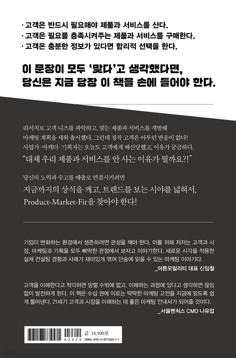 우리는 모든 것이 끊임없이 변하는 고객과 시장 앞에서 혼란스러울 때가 많다. 이 책은 그러한 우리에게 신선한 관점과 길을 제시한다. - 정승환 (라이언로켓 대표)