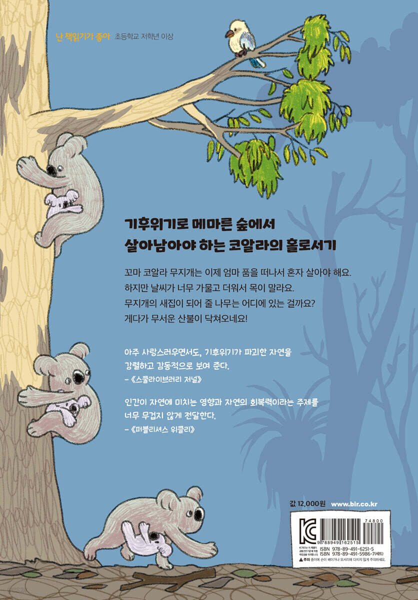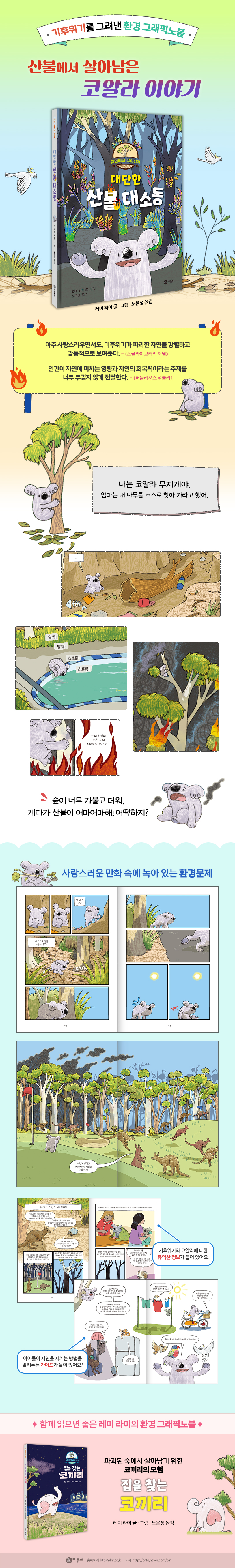 엄마는 비 온 뒤 먹구름이 걷히면서 알록달록 곱게 하늘을 물들일 때를 좋아해 무지개의 이름을 지었지만, 날이 가물어 진짜 무지개를 본 지 오래되었다. 무지개는 이제 엄마 없이 스스로 나무를 찾아야 한다. 그러나 날씨가 너무 가물고 덥다. 흐르던 개울은 쓰레기로 가득하고 숲 곳곳을 차지한 인간들이 무섭다. 게다가 끔찍한 산불마저 닥쳐온다! 무지개가 혼자서 잘 해낼 수 있을까? 어린 코알라인 무지개의 시점에서 메마른 숲은 너무 위험하다. 목마르고 지친 무지개는 로드킬을 당할 뻔하고, 물을 찾아 수영장에 갔다가 빠져 죽을 뻔한다. 인간의 개입으로 변해 버린 자연에서 살아가는 일이 동물들에게 얼마나 험난한지를, 레미 라이는 뛰어난 만화적 표현력으로 담아냈다. 무지개는 인간의 도움을 받아 산불에서 겨우 살아남는다. 동물의 생존을 위협하는 주범은 인간이지만 위기에 처한 동물을 구조하는 것도 인간이다. 이처럼 인간과 자연이 서로를 도울 수도, 파괴할 수도 있다. 기후위기 시대를 헤쳐 나가기 위해서 인간의 반성과 책임이 필요함을 『대단한 산불 대소동』은 아이들 눈높이로 잘 담아냈다. 산불이 나면 코알라를 더 볼 수 없을지도 모른다고? 코알라는 2022년 멸종위기종으로 공식 지정되었다. 2019년에 발생해 그다음 해까지 이어진 호주의 대규모 산불은 수많은 동물의 개체 수를 줄이고 서식지를 파괴했다. 움직임이 느려 쉽게 도망치지 못하는 코알라에게 산불은 특히 위험하다. 기후위기로 인해 건조해진 날씨가 산불을 일으키고, 산불이 숲을 파괴해 온실가스를 배출하는 악순환이 반복되고 있다. 우리나라에서도 대형 산불 피해가 눈에 띄게 증가하는 추세다. 왜 숲에는 가뭄이 들고 무지개가 위험을 겪어야 했던 걸까? 건조한 숲에 사람들이 지은 도로와 수영장, 골프장은 어떤 영향을 미쳤을까? 무지개의 이야기에 이입하며 떠올리게 되는 여러 질문들을 부록을 통해 해결할 수 있다. 마지막 장의 부록은 코알라에 대한 유익한 정보를 소개하고, 어린이가 환경을 지키기 위해 실천할 방법을 알려준다. |