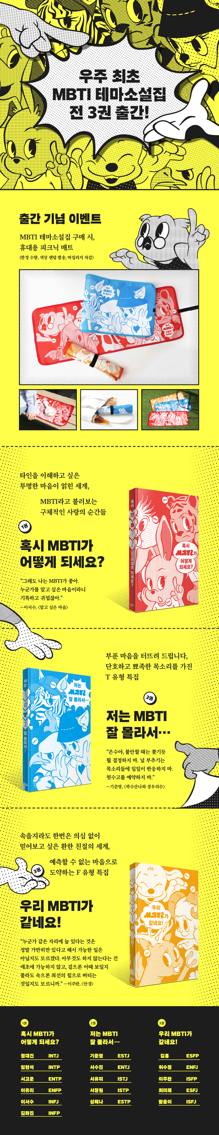 닫힌 마음을 열어주는 다정함의 끝판왕, F 유형 특집 3권 『우리 MBTI가 같네요!』는 다정함의 끝판왕 ‘F’ 유형 특집이다. T가 ‘Thinking’이라면, ‘F’는 ‘Feeling’이다. 자기만의 스타일로 탄탄한 독자층을 지닌 김홍, 위수정, 이주란, 최미래, 함윤이 소설가는 공감 능력을 필수 장착하고 소설에 참여했다. 저마다의 공감 색으로 칠해진 다섯 가지 MBTI 유형으로 묘사되는 인물을 통해 우리는 ‘나’와 같은 인물에게서 공감을 얻고, ‘나’와 다른 인물에게서 다름을 배운다. MBTI 기본 회화 3가지 이제 우리는 옆자리 동료의 힘든 마음을 위로할 수 있다, 우리에게 16가지의 MBTI만 있다면. 어린아이가 흘린 과자를 몰래 주워 먹듯이, 우리는 결국 또 하고 만 실수들을 몰래 집어 가슴에 쏙 넣을 수 있다. 우리를 설명해 줄 16가지의 MBTI만 있다면 말이다. 바야흐로 MBTI의 시대다. 오늘 누군가를 만났는데 그 누군가가 내 MBTI를 물어오지 않으면 괜스레 서운해질 정도다. 사회인이라면 적어도 ‘I’와 ‘E’의 차이 정도는 알아야 한다. MBTI를 묻고 답하며 얻은 정보로 우리는 서로에 대한 호감을 저 하늘 끝까지 밀어 올린다. 시작이 반이라고들 하니까, MBTI 기본 회화 3가지에서 시작해 보자. “혹시 MBTI가 어떻게 되세요?”가 첫인사다. (따라 해보자.) “저는 MBTI 잘 몰라서...” 하고 대답해도 괜찮다. (따라 해보자.) 물론, “우리 MBTI가 같네요!” 하는 답이 돌아오면 더없이 기쁘겠지만. (따라 해보자.) 기본 회화 다음은 이제 실전 소설의 세계다. “문제가 있다면 산해 씨가 너무 밝다는 거였다.” (김홍, 〈여기서 울지 마세요〉) 빵집 점장인 ‘나’와 아르바이트생 ‘산해 씨’의 우정을 그린 하이퍼리얼리즘 유머 소설. ‘나’는 작은 빵집의 점장이다. 산해 씨는 밝은 알바를 뽑아야 가게 분위기도 밝아지고 손님도 많아진다는 신조를 가진 ‘회장’의 가게에서 일하는 ESFP 아르바이트생이다. 하지만, 출근 두 달 만에 5000럭스를 돌파한 산해 씨의 밝기를 회장은 감당하지 못하고, 결국 산해 씨는 크리스마스에 해고 통보를 듣게 된다. 산해 씨 대신 LED 옷을 입고 가게를 밝히던 ‘나’는 그동안 산해 씨의 환한 빛에 얼마나 빚지고 있었는지 뒤늦게 깨닫는다. 그러던 어느 날, ‘나’는 TV를 보다가 〈순간포착 세상에 이런 일이〉에 나온 산해 씨를 보게 되는데……. ESFP는 밝기만 할까? 아니, 밝기만 하면 또 어때? 〈여기서 울지 마세요〉는 ‘밝음’에 대해 여러 생각을 하게 하는 소설이다. 누군가의 ‘밝음’을 착취할 권리가 누구에게도 없다는 것에 대해서도. - MBTI를 믿는 건 세상이 잘못되는 것과 관계없었다. 문제는 나였다. [...] 나는 그냥 비겁했다. 나를 위해 재채기를 해준 산해 씨에 비하면 반의반도 되지 못하는 인간이었다. 용기도 의지도 없는 내가 할 수 있는 일이라고는 이렇게 눈물을 쏟아내는 것밖에 없었다. ─38쪽 “혜신아, 9가 이기는 게임이 뭔지 알아?” (위수정, 〈9〉) 자신이라고 믿었던 과거의 모든 걸 두고 카지노에 붙박인 ‘혜신’의 이야기. 부부 동반으로 스키장에 놀러 갔던 ‘혜신’은 남편 ‘동재’를 따라 재미로 가게 된 카지노에서 ‘바카라’라는 게임을 하게 된다. 그리고 그날 혜신은 ‘노력과는 무관한 운’의 매력에 완전히 마음을 빼앗긴다. 게임이 끝나고 화장실에 간 혜신은 화장이 지워지고 눈 밑이 검어진 얼굴을 보며 생각한다. ‘이게 나인가? 이게 나……라니.’ 혜신은 친구의 집에서 자고 간다며 ‘동재’에게 거짓말하고, 카지노로 향한다. 그런 혜신에게 ‘소라’가 다가와 말을 건다. “죄송한데, 저 부탁 좀 드려도 될까요?” 동재는 이번이 마지막이라고 경고한다. “혜신아, 듣고 있어? 이번이 마지막이야.” 하지만, 혜신은 소라와 함께 동재가 준 돈으로 마지막 베팅을 하는데……. 혜신이 카지노를 떠나지 못하는 건 단순히 도박에 중독되어서일까? 아니면, 사람 좋아하는 평범한 주부가 아닌 진짜 자신의 모습에 중독되어서일까? 〈9〉는 평범한 것 같기도, 평범하지 않은 것 같기도 한 혜신을 통해 게임 같기도, 노동 같기도 한, 우리의 삶을 되돌아보게 한다. - 사실 내가 이런 사람이 아니거든. 왜, 그거 있잖아. 요즘 성격 구분하는 테스트……. MBTI? 응. 거기 보면 내가 딱 외향적이고 계획적인 그런 사람이거든. 정확하게 맞아. 그리고 너무 양심적이지. 그래서 이 모양으로는 가족들한테 못 가겠어. 도저히. 그건 그냥 핑계 아닐까요? ─69쪽 “난 이제 어떻게 살아야 할까.” (이주란, 〈안경〉) 갑작스러운 폭설로 인해 ‘나’와 ‘내 친구’는 발이 묶이게 된다. 마을버스와 택시의 운행이 중단되는 동안, 두 사람은 ‘나’의 집에서 카레를 만들어 먹거나, 인생 그래프를 그리거나, “이제 어떻게 살아야 할까?” 따위를 서로에게 물으며 시간을 보낸다. 지금의 자신이 싫어진 이야기를, 그만둔 지 한 달쯤 된 일에 대한 이야기를, 이젠 돈이 되는 일을 하겠다고 말하다가도, 둘의 대화는 또다시 “이제 어떻게 살아야 할까?”로 되돌아온다. 작가는 자신의 삶을 ‘리얼리티 관찰 프로그램을 찍는다면 통편집이 될’ 거라고 말하지만, 이주란의 소설을 읽는 사이 우리는 언
