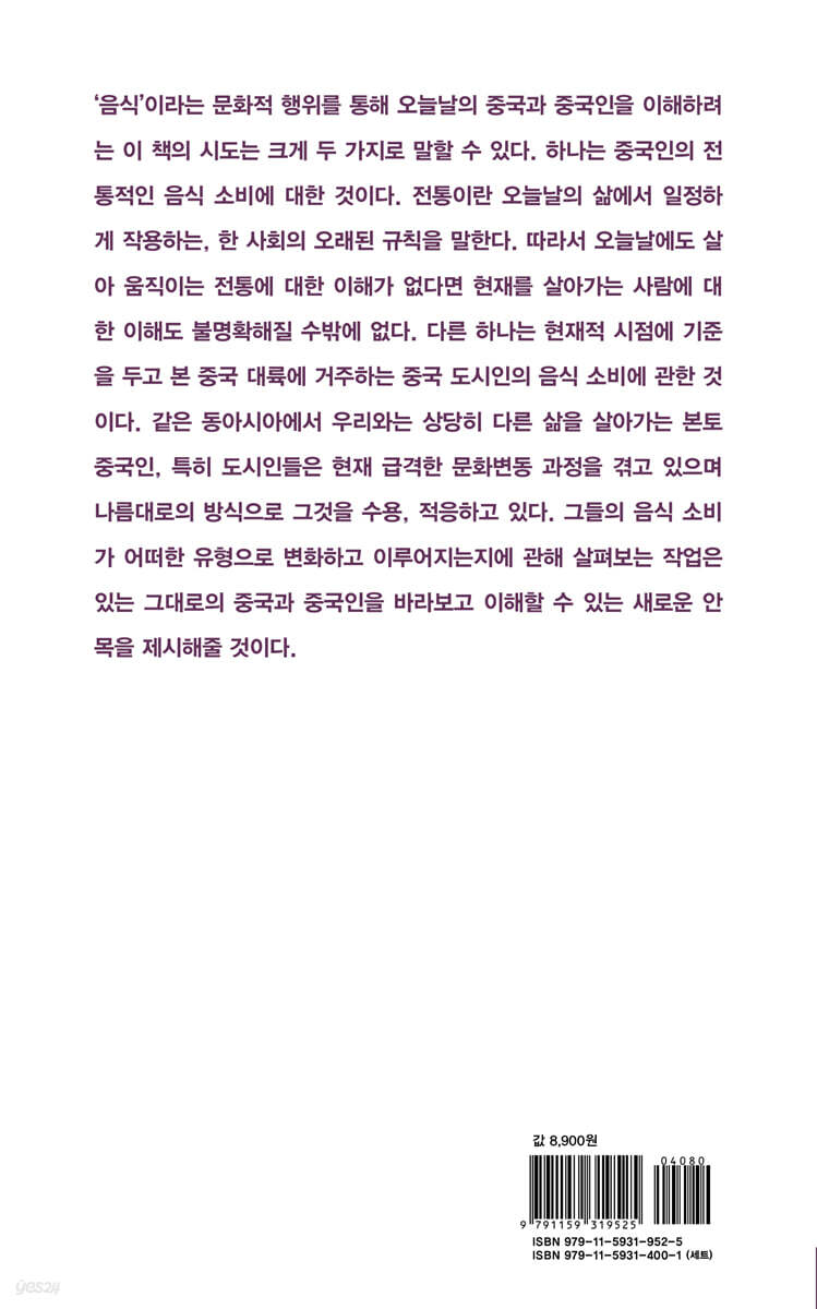 들어가는 말 제1장 중국, 중국인, 중국음식 1. 중국인에 대한 한국인의 생각 2. 과연 중국에는 짜장면이 없을까? 3. 짜장면에 대한 한국 사회의 오해 4. 중국, 중국인, 중국음식의 범주 제2장 중국인의 전통적인 음식 소비 1. 밥〔飯〕과 요리〔菜〕 2. 차〔茶〕와 술〔酒〕 3. 손님〔客人〕과 주인 그리고 주방 선생〔廚師〕 4. 음식에 대한 관념 5. 다민족 문화의 결정체, 중국음식 제3장 개혁개방 이후 중국 도시인의 음식 소비 1. 맥도널드와 KFC의 희비쌍곡선 2. 소황제를 위한 식품 3. 면류 기원지 중국의 구겨진 체면 4. 음식의 정치적 생산과 문화적 소비 5. 1990년대 중후반, 흔들리는 전통 식탁에 앉은 베이징 왕씨 6. 1990년대 중후반, 서구화의 길에 선 상하이 장씨의 음식생활 7. 전통과 현대의 갈등과 공존 맺는말 ─ 인류학자와 컨설턴트 부록 한중수교 30년, 한중 음식 교류 30년 1. 음식의 맛, 가깝지만 다른 나라 2. 수교 후 베이징의 한국음식 3. 수교 후 서울의 중국음식 4. 유감 : 김치 vs 파오차이 논쟁 주 더 읽어야 할 자료들 |