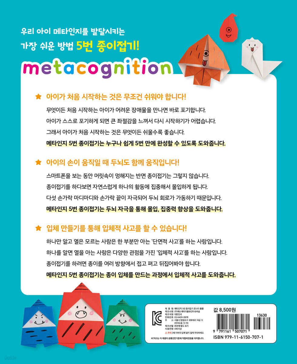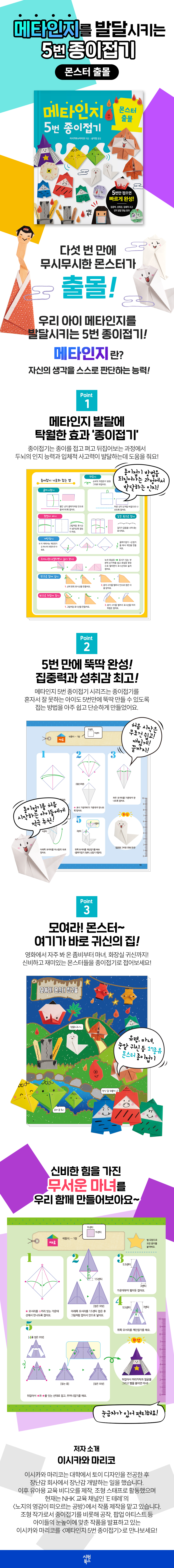종이접기 방법을 되짚어가는 과정에서 발달하는 인지 종이접기는 종이를 접고 펴고 뒤집어보는 과정에서 두뇌의 인지 능력과 입체적 사고력이 발달하는 데 도움을 준다. 종이접기 놀이는 비용이 적게 들뿐더러 중간에 실수를 해도 다시 시작하기 쉽다. 접었던 종이를 펴서 다시 접으면 되기 때문이다. 종이접기 방법을 되짚어가는 과정에서 자신이 이해한 것은 무엇인지, 잘못 이해한 것은 무엇인지, 제대로 하려면 어떻게 해야 하는지 스스로 답을 찾아낼 수 있다. 이러한 과정에서 아이들은 자신의 생각을 스스로 판단하는 능력인 ‘메타인지’를 기를 수 있다. 메타인지(metacognition) 발달심리학자 존 플라벨(J. H. Flavell)이 만든 용어로 ‘자신의 생각을 스스로 판단하는 능력’을 말한다. ‘인지에 대한 인지’라고도 합니다. 존 플라벨에 따르면, ‘내가 무엇을 알고 무엇을 모르는지에 대해 아는 것’부터 ‘내가 모르는 부분을 보완하기 위해 계획을 하고 그 실행 과정을 평가하는 것’까지 전반적인 인지 활동을 포함한다. [2] 5번 만에 뚝딱 완성 집중력과 성취감 최고! 처음 시작은 무조건 쉽고 재밌게 끝까지 해내는 경험 종이접기를 처음부터 잘하는 아이도 있지만 어려워하는 아이도 있다. 종이접기는 다섯 손가락 마디마디와 손가락 끝이 자극되어 두뇌 회로가 가동하는 최고의 학습 놀이다. 그런데 대부분 아이들은 어렵다고 느끼면 바로 포기해버린다. 스스로 포기하게 되면 큰 좌절감을 느껴 다시 시작하기가 어렵다. 메타인지 5번 종이접기 시리즈는 종이접기를 혼자서 잘 못하는 아이도 5번 만에 뚝딱 만들 수 있도록 접는 방법을 아주 쉽고 단순하게 만들었다. 종이접기를 처음 시작하는 아이들에게 딱 맞는 책이다. [3] 으스스~ 모여라 몬스터 친구들!! 갓파, 우산귀신, 도깨비불, 좀비 등 17종류 몬스터 종이접기 만화나 그림책에서 자주 보았던 인기 만점 몬스터, 신기한 도깨비, 무서운 귀신들까지 으스스한 몬스터들을 종이접기로 만날 수 있다. 대표적으로 드라마나 영화의 소재로 자주 나오는 좀비부터, 귀엽지만 무서운 유령과 신비한 힘을 가진 마녀까지! 신비하고 재미있는 몬스터들을 종이접기로 접어보자. 메타인지 5번 종이접기 시리즈는 동물, 꽃, 몬스터, 음식 등 주제별로 17종씩 나뉘어 있어서 만드는 재미를 더한다. |