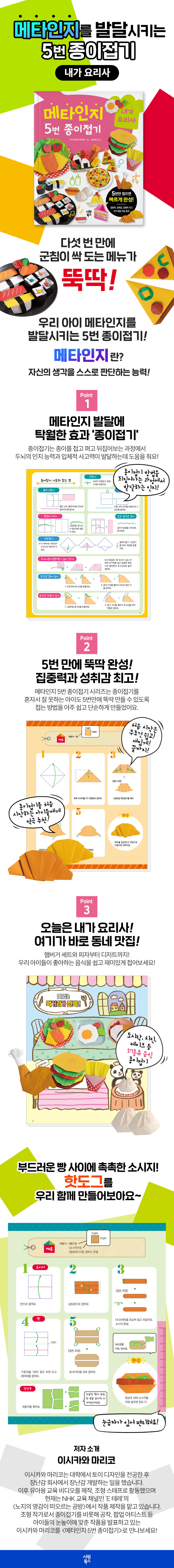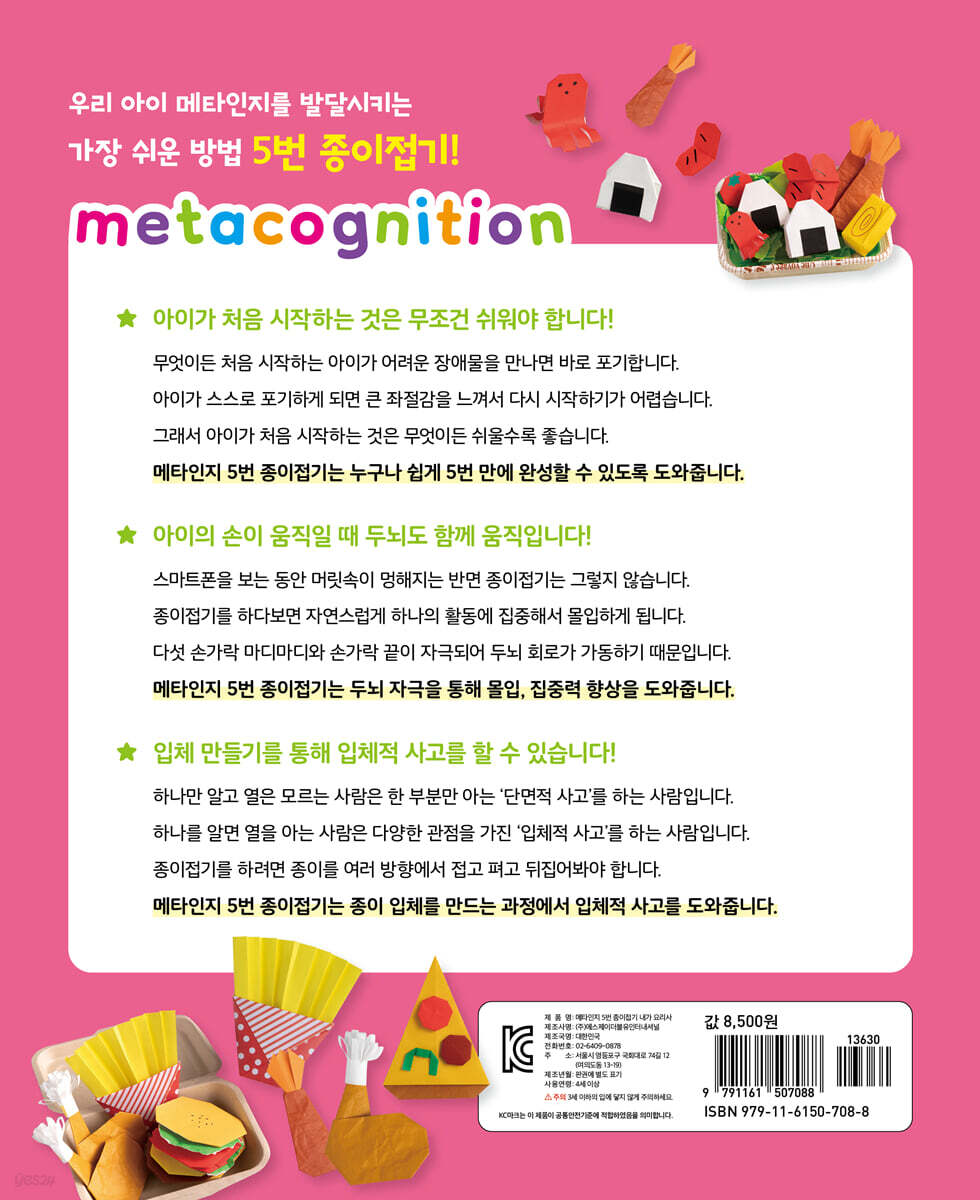 종이접기 방법을 되짚어가는 과정에서 발달하는 인지 종이접기는 종이를 접고 펴고 뒤집어보는 과정에서 두뇌의 인지 능력과 입체적 사고력이 발달하는 데 도움을 준다. 종이접기 놀이는 비용이 적게 들뿐더러 중간에 실수를 해도 다시 시작하기 쉽다. 접었던 종이를 펴서 다시 접으면 되기 때문이다. 종이접기 방법을 되짚어가는 과정에서 자신이 이해한 것은 무엇인지, 잘못 이해한 것은 무엇인지, 제대로 하려면 어떻게 해야 하는지 스스로 답을 찾아낼 수 있다. 이러한 과정에서 아이들은 자신의 생각을 스스로 판단하는 능력인 ‘메타인지’를 기를 수 있다. 메타인지(metacognition) 발달심리학자 존 플라벨(J. H. Flavell)이 만든 용어로 ‘자신의 생각을 스스로 판단하는 능력’을 말한다. ‘인지에 대한 인지’라고도 합니다. 존 플라벨에 따르면, ‘내가 무엇을 알고 무엇을 모르는지에 대해 아는 것’부터 ‘내가 모르는 부분을 보완하기 위해 계획을 하고 그 실행 과정을 평가하는 것’까지 전반적인 인지 활동을 포함한다. [2] 5번 만에 뚝딱 완성 집중력과 성취감 최고! 처음 시작은 무조건 쉽고 재밌게 끝까지 해내는 경험 종이접기를 처음부터 잘하는 아이도 있지만 어려워하는 아이도 있다. 종이접기는 다섯 손가락 마디마디와 손가락 끝이 자극되어 두뇌 회로가 가동하는 최고의 학습 놀이다. 그런데 대부분 아이들은 어렵다고 느끼면 바로 포기해버린다. 스스로 포기하게 되면 큰 좌절감을 느껴 다시 시작하기가 어렵다. 메타인지 5번 종이접기 시리즈는 종이접기를 혼자서 잘 못하는 아이도 5번 만에 뚝딱 만들 수 있도록 접는 방법을 아주 쉽고 단순하게 만들었다. 종이접기를 처음 시작하는 아이들에게 딱 맞는 책이다. [3] 맛있는 먹거리가 잔뜩! 좋아하는 음식을 만들자! 초밥, 도시락, 피자, 햄버거 등 21종류 음식 종이접기 집에서 먹는 음식, 식당 메뉴, 도시락 반찬 등 좋아하는 음식을 쉽고 재미있게 종이접기로 만날 수 있다. 대표적으로 아이들이 좋아하는 햄버거 세트와 피자 같은 패스트푸드부터, 달콤한 케이크와 푸딩을 비롯해 나들이 가서 맛있게 먹을 수 있는 도시락까지! 맛있고 먹음직스러운 음식들을 종이접기로 접어보자. 메타인지 5번 종이접기 시리즈는 동물, 꽃, 몬스터, 음식 등 주제별로 17~21종씩 나뉘어 있어서 만드는 재미를 더한다. |