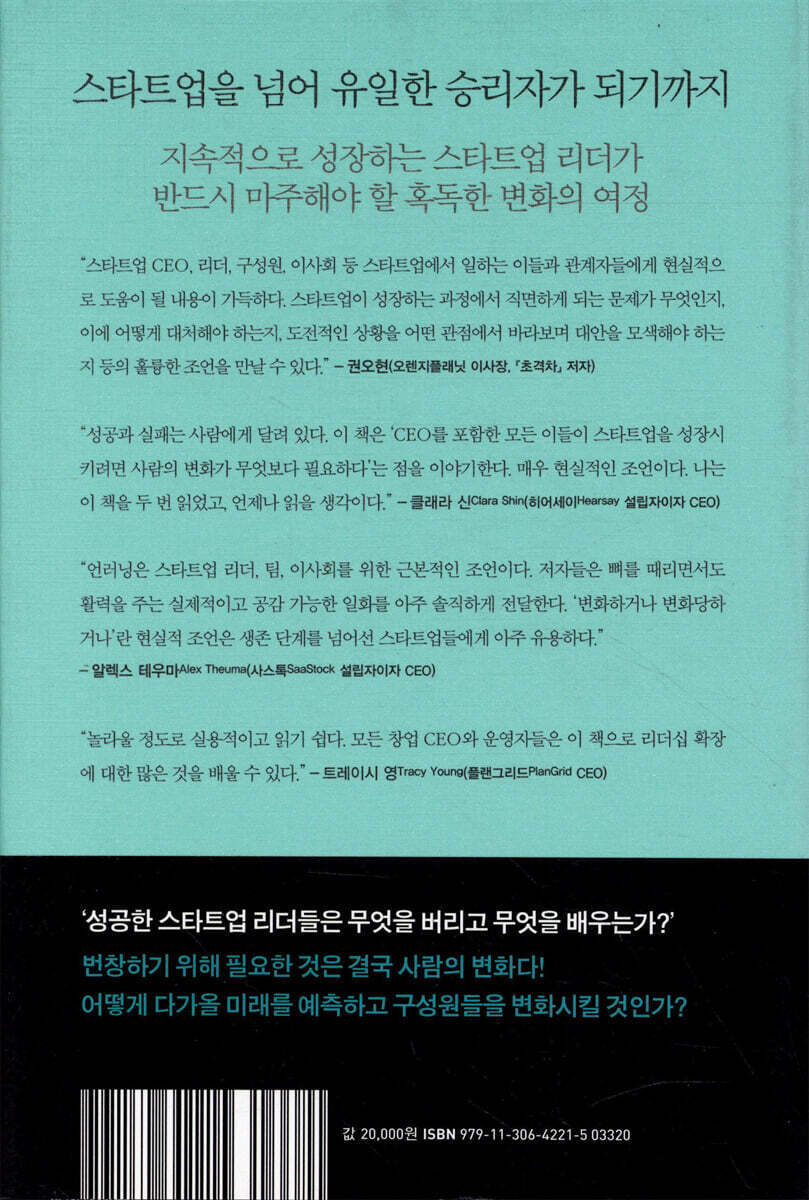 ---「제1장 「CEO」 38~39p」중에서 이 시점에서 CEO의 역할은 다시 바뀝니다. 어벤저스 스타일의 슈퍼 히어로들을 이끄는 것만으로는 더 이상 충분하지 않기 때문입니다. 영역 리더십을 가속화하고 지속 가능한 업종의 리더로 도약해야 합니다. 이 단계에서 CEO는 부대 전체를 통솔하고 지휘해야 합니다. 이것은 매우 생소한 역할입니다. CEO의 역할은 X맨을 양성하는 특수학교의 학장인 프로페서 X에 가까워집니다. (X맨의 본산이 학교라는 건 우연이 아닙니다.) 슈퍼 히어로 임원 각자는 이제부터 전장의 전사이자 차세대 슈퍼 히어로 리더를 양성하는 교사의 역할을 동시에 수행합니다. 프로페서 X는 개별 전투보다는 전쟁에서 승리하는 데 초점을 맞춥니다. 프로페서 X의 업무량은 이전보다 줄었지만 더 많은 사람들을 위해 그 업무를 반복하게 되죠. ---「제1장 「CEO」 48~49p」중에서 초기 슈퍼 히어로는 회사의 성장과 성공에 크게 기여한 임원입니다. 그들이 없었다면 회사가 존재하지 못했을 겁니다. 많은 스타트업 구성원들은 그들에 의해 채용되었죠. 회사는 경영진의 핵심 구성원인 슈퍼 히어로를 존중합니다. 하지만 회사가 확장되고 성장이 가속화됨에 따라 균열이 나타나기 시작합니다. 급속한 성장으로 인해 발생하는 시스템 이슈는 명확한 해결책이 없기에 크게 확대됩니다. 미래를 위한 계획은 과거에 수립했던 계획에 비해 크게 다르지 않습니다. “그것이 우리를 이곳까지 오게 했습니다… 우리는 지금 변화를 기할 수가 없어요(여력이 없어요).” 실행상의 어려움이 존재하고, 계획은 정체되며, 긴장이 고조됩니다. 슈퍼 히어로 리더는 좌절감을 느끼며 변화의 필요성은 인식하지만, 무엇을 해야 할지 확신을 갖지 못합니다. 외부의 압박은 방어기제만 불러일으킵니다. 어떤 경우에는, 문화적으로 시금석의 위치에 있던 슈퍼 히어로가 돌연 부정적인 세력으로 이동하기도 합니다. 자신이 지닌 초능력과 지휘 능력을 자부했던 슈퍼 히어로들은 실망스럽게도 그저 한 사람의 평범한 인간이 된 자신을 발견합니다. ---「제2장 「리더」 142~143p」중에서 팀의 중단 지점: 어떤 느낌일까? · 50명 규모: 50명 미만일 때 팀은 실행을 유기적으로 조직화할 수 있습니다. 회사가 성장함에 따라 여러 임원들이 합류하게 되면, 그런 방식의 실행은 중단되고 비체계적인 느낌을 유발합니다. 안타깝게도 팀은 오른손이 하는 일을 왼손이 모르는 상황에 처했다고 느낍니다. · 150명 규모: 이전에는 경영진이 실행 허브 역할을 수행하며 하나 된 마음으로 팀을 유동적으로 운영해왔다면, 엔지니어링팀과 시장진출팀이 각각 50명 이상으로 성장한 지금부터는 팀 리더를 채용하는 일과 실행에 몰두하는 일이 더 복잡해집니다. 팀 간에 약간의 부서 이기주의와 긴장감이 맴돌죠. 성공 측정의 기준도 더 이상 단순한 판매목표 달성 여부가 아니게 됩니다. 팀의 의사결정을 돕는 근본적인 지표가 중요해집니다. 채용 및 안착 여부는 실행을 제약하는 핵심요소가 됩니다. 이때 사람들은 “스타트업 정신을 잃지 않고 어떻게 계속 성장할 수 있을까?”란 질문을 던지죠. · 450명 규모: 두 번째 계층의 리더들이 경영진 아래에 포진하고, 그들 각각은 상당한 책임 범위를 가진 대규모 기능팀과 지역팀을 담당합니다. 이제부터 실질적 업무와 실행 허브는 원래의 경영진이 아니라 이 두 번째 계층의 리더들이 맡게 되죠. 하지만 다기능 프로젝트cross-functional project를 진행하기가 이제는 무척이나 어렵습니다. 속도가 높아지기는커녕 느려지고 말죠. 강력한 리더가 있다 하더라도 해결을 위해 기본적인 사안들이 임원들(경영진)에게 올라가게 됩니다. 작고 민첩한 팀이 있긴 하지만, 대부분의 팀들은 규모가 커져서 더 많은 체계를 필요로 하고 문화적 동일성은 크게 떨어지고 맙니다. 회사 전체에 불만이 쌓이고 말죠 ---「제3장 「팀」 176~177p」중에서 이사회 안에서 형성되는 힘의 역학 중에서 특별히 혼란을 주는 것은 개별 이사회 멤버들이 ‘탐욕 모드’와 ‘두려움 모드’를 왔다 갔다 하는 경우입니다. 시기가 좋을 때 그들은 탐욕스러워져서 수익을 극대화하도록 회사에게 빠른 성장을 촉구하고, 초기 투자에 대해 파트너에게 좋은 인상을 주기 위해 지나치게 높은 가치 창출을 요구합니다. 또한 M&A를 진행할 때는 수익 극대화를 목적으로 가치평가상 유리한 위치를 점하고자 하죠. 하지만 판매 목표를 달성하지 못하고 자본조달이 어려워지고 현금이 고갈되는 등 여러 가지 혼란으로 인해 상황이 좋지 못할 때는 바로 두려움 모드에 빠집니다. 여러 이벤트에 대한 과잉 반응, 경영진에 대한 압박, 후속 투자 보류 등 이사회 차원의 마비 증상을 드러냄으로써 시장에 부정적인 신호를 보내는 것이죠. 두려움 모드인지 탐욕 모드인지에 따라 이사회 멤버들은 완전히 다른 성격을 드러냅니다. 동일한 상황에 처하더라도 서로 다르게 반응하곤 합니다. 이런 점이 스타트업 경영진과 다른 이사회 멤버들을 혼란스럽게 만들죠. ‘두려움 대 탐욕’이라는 역학은 자연스러운 것이지만, 스타트업에겐 이사회의 일관적인 리더십이 필요합니다. 이사회 리더