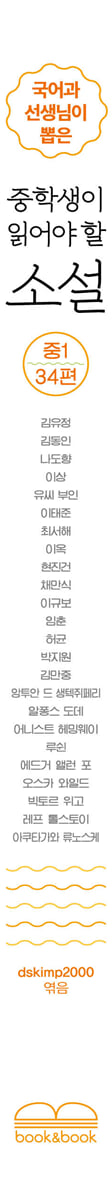 해설6 봄봄 / 김유정 15 동백꽃 / 김유정 29 붉은 산 / 김동인 39 광화사 / 김동인 48 물레방아 / 나도향 68 날개 / 이상 86 복덕방 / 이태준 111 홍염 / 최서해 127 B사감과 러브레터 / 현진건 147 빈처 / 현진건 156 치숙 / 채만식 176 어린 왕자 / 앙투안 드 생텍쥐페리 196 산문으로 쓴 환상시 / 알퐁스 도데 257 가난한 사람들 / 빅토르 위고 266 검은 고양이 / 에드거 앨런 포 274 살인자 / 어니스트 헤밍웨이286 행복한 왕자 / 오스카 와일드 303 두 노인/ 레프 톨스토이 317 유년 시대 / 레프 톨스토이 343 아Q정전 / 루쉰 347 라쇼몬 / 아쿠타가와 류노스케 395 주몽 신화 / 작자미상 403 바리데기 설화 / 작자미상411 아기장수 설화 / 작자미상 417 이옥설 / 이규보 422 공방전 / 임춘 424 홍길동전 / 허균 431 토끼전 / 작자미상 447 광문자전 / 박지원 460 구운몽 / 김만중 466 사씨남정기 / 김만중 484 심생전 / 이옥 509 인현왕후전 / 작자미상 518 조침문 / 유씨부인 540 |