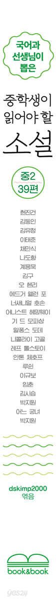 해설 6 운수 좋은 날 / 현진건 14 할머니의 죽음 / 현진건 28 감자 / 김동인 41 배따라기 / 김동인 52 금따는콩밭/ 김유정 69 노다지 / 김유정 84 달밤 / 이태준 97 이상한 선생님 / 이태준 109 미스터 방 / 채만식 119 벙어리 삼룡이 / 나도향 134 백치 아다다 / 계용묵 149 나의 소원 / 김구 166 마지막 잎새 / 오헨리 182 20년 후/ 오헨리 192 도둑맞은 편지 / 에드거 앨런 포 199 큰바위얼굴/ 너새니얼 호손 220 인디언 부락 / 어니스트 헤밍웨이 237 목걸이 / 기 드 모파상 244 두 친구/ 기 드 모파상 256 별/알퐁스 도데 267 스갱 씨의 산양 / 알퐁스 도데 275 외투 / 니콜라이 고골 282 바보 이반 / 레프 톨스토이 325 귀여운 여인 / 안톤 체호프 359 고향 / 루쉰 377 단군 신화 / 작자미상 390 조신 설화 / 작자미상 394 슬견설 / 이규보 399 국순전 / 임춘 403 흥부전 / 작자미상 410 춘향전 / 작자미상 425 운영전 / 작자미상 453 만복사저포기 / 김시습 470 양반전 / 박지원 479 허생전 / 박지원 486 박씨전 / 작자미상494 유충렬전 / 작자미상 507 계축일기 / 어느 궁녀 524 통곡할 만한 자리 / 박지원 540 |