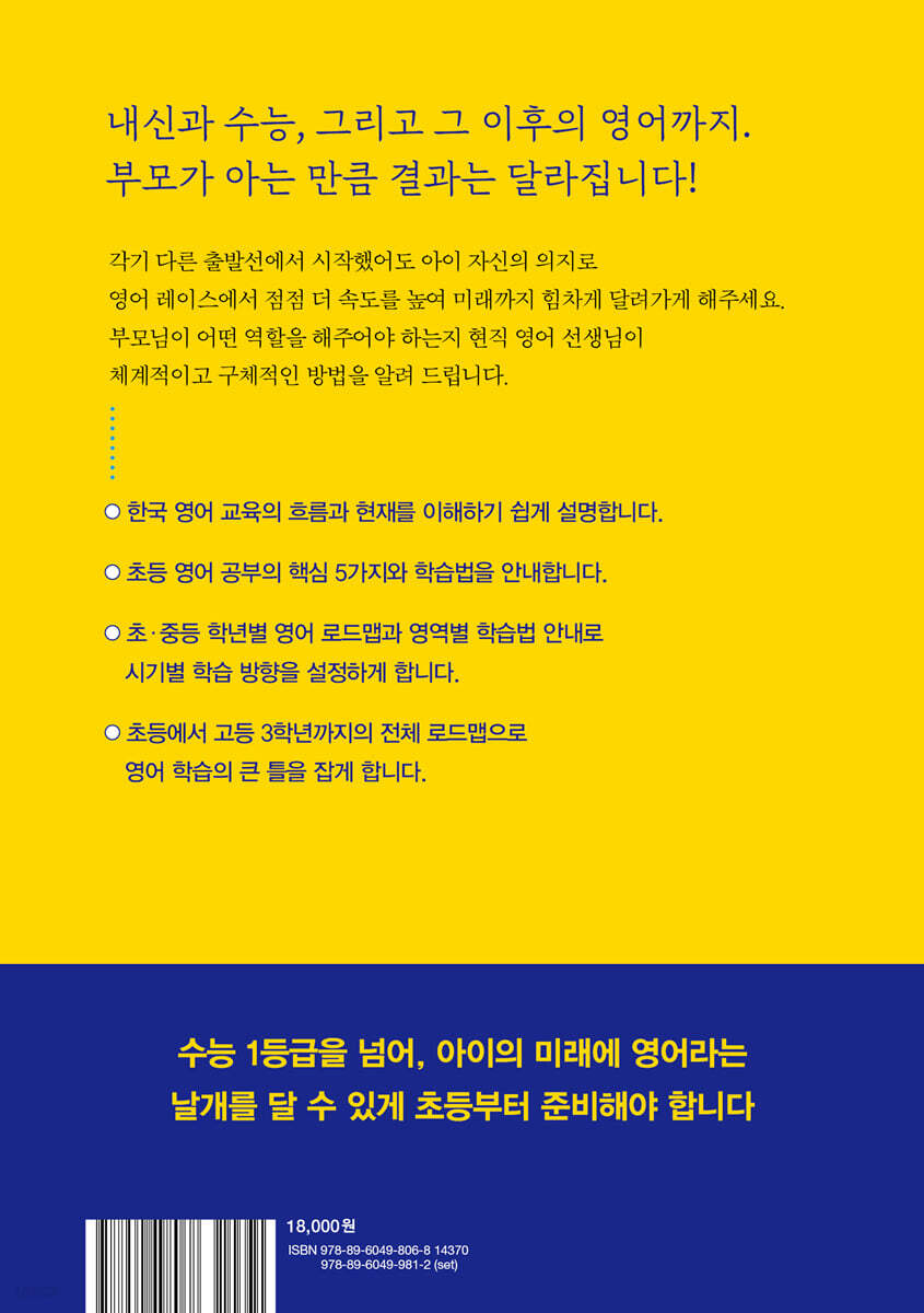 PART I 왜 아이들은 영포자가 되는가? 1장. 영어 교실의 현실 1 영어 시간에 빛나는 나현이 2 영어 공부를 열심히 하지만 성적이 나오지 않는 진영이 3 영어를 싫어하여 포기한 수빈이 4 학원표 영어, 혼자 공부할 엄두를 못 내는 지훈이 5 내신과 모의고사 성적의 비대칭을 겪고 있는 석우 2장. 영어를 망치는 초등학생 90%의 영어 공부 실태 1 사교육의 부정적인 경험으로 영어가 싫어진 아이들 2 이른 노출은 되었지만 자기 생각이 없는 아이들 3 문법 위주로 공부하여 영어에 흥미를 잃은 아이들 4 문법 기반이 탄탄히 잡히지 않은 아이들 5 해석을 넘어선 문해력을 쌓지 못한 아이들 6 초?중등은 영어 마스터, 고등은 수학?과학 올인이라는 잘못된 관념 PART II 초등 영어의 출발선과 종착점 로드맵 1장. 한국 영어 교육의 출발선 1 한국 영어 교육의 흐름 2 한국인의 영어 능력에 대한 오해 3 한국인 영어의 출발선 언어적 출발선: 모국어와 상극인 영어 | 환경적 출발선: ESL이 아닌 EFL 4 불리한 언어 습득 출발점을 극복하기 위한 영어 노출(Input)의 필요성 5 한국 영어 교육의 현재 영어 교과 역량 및 학교급별 영어 교육과정의 목표 | 초등 영어 교육과정의 이해 중·고등 영어 교육과정의 이해 | 초·중·고 교육과정 영어 노출의 실제 2장. 초·중·고 영어 공부 로드맵 1 영어 공부의 종착점, 수능 1등급+α 2 초등 1학년~고등 3학년 전체 로드맵 PART III 수능 1등급으로 이어지는 초등 영어의 핵심 1장. 절대평가여도 절대 쉽지 않은 수능 영어 1등급 1 수능 영어 영역 문항의 A to Z 2 수능 영어 출제 지문 예시 3 수능 출제 지문의 리딩 지수 분석 4 수능 영어 절대평가의 실제 5 재학생이 전적으로 불리한 수능에서 절대 전략 과목인 영어 2장. 초등 영어의 핵심 1. 목표 세우기 1 하루빨리 깨야 하는 부모와 아이의 영어 동상이몽 2 목표에 따른 과정과 태도의 변화 3 수능 영어 1등급은 ‘매일’의 목표를 수행한 끈기의 결과 3장. 초등 영어의 핵심 2. 흥미와 동기 부여 1 일찍 시작하면 오래 걸린다, 늦게 시작하면 금방 간다 2 끝까지 가는 영어 체력의 기초: 흥미와 동기 3 하브루타, 생각하는 영어 하브루타란 | 머리에 남는 효과적인 학습법 | 영어 하브루타의 실제 4장. 초등 영어의 핵심 3. 문해력의 기본, 어휘력 쌓기 1 우연적 학습 vs. 명시적 학습 2 다독을 통한 어휘 학습 3 게임을 통한 어휘 학습 워드 헌트(Word Hunt) | 플래시 카드(Flash Card) | 단어 오목 | 파운드 잇(Found It!) 워드 서치(Word Search) | 배스킨라빈스 31 게임(Baskin Robbins 31 5장. 초등 영어의 핵심 4. 문해력의 뼈대, 문법 기초 세우기 1 문법을 배우는 진짜 이유 2 무엇보다 중요한 문법 공부의 시작 3 시작은 가볍게 귀납적 문법 학습: 예문으로 문법의 규칙성 찾기 | 음독으로 자연스러운 문장 통암기 필사로 글쓰기까지 확장 | 연역적 문법 학습: 점차 깊고 넓어지는 심화의 과정으로 6장. 초등 영어의 핵심 5. 문해력의 핵심, 독서 근력 다지기 1 모든 것을 압도하는 읽기의 힘 2 영어책 읽기를 시작하는 팁 3 진정한 문해력은 읽기 유창성이 아닌 확장된 사고력 4 문해력의 필요 조건인 다독 5 다독+α: 단계별 책 읽기와 정독 6 논픽션 읽기를 시작하는 팁 7 논픽션 읽기를 확장하는 팁 신문 기사의 구성 | 주장 + 근거 및 예시(Argument + Evidence & Example) 통념 + 사실 및 비판(Myth + Truth & Criticism) | 비교 및 대조(Comparison & Contrast) 원인 및 결과(Cause & Effect) | 열거 및 부연(Listing & Addition) 8 국어와 영어의 상관관계: 모국어 실력을 절대 못 넘어서는 영어 실력 9 영어로의 전환이 쉬워지는 생각하는 힘과 배경지식 PART IV 수능 1등급으로 이어지는 초·중등 영어 로드맵 1장. 초등 학년별 영어 로드맵: 흥미·동기 내공 1 중·고등 영어를 견인하는 기초 근력 매일 듣기와 매일 읽기의 힘 | 부모의 역할: 페이스메이커 | 인풋, 인테이크, 아웃풋 2 초등 1, 2학년 영어 로드맵 영어 음원 노출 | 영어 그림책 읽기(청독) | 영어 영상 노출 3 초등 3, 4학년 영어 로드맵 꾸준한 영어책 읽기와 영상 시청 | 기본 파닉스 | 음독과 섀도우 스피킹 영어 필사와 영어 일기 쓰기 4 초등 5, 6학년 영어 로드맵 영어 슬로 리딩과 샛길 활동 | 영어 신문 읽기 | 아웃풋 활동 지속하기 영문법 입문하기 2장. 중등 영어 로드맵: 실력 내공 1 중학교 1학년 영어 로드맵 자유학년제의 이해 | 교과 진도와 평가계획 숙지 | 교과서 완전 학습 | 다독 2 중학교 2학년 영어 로드맵 학교 수업을 충실히 | 시험 기간과 비시험 기간의 전략적 학습 | 시험 후 학습 3 중학교 3학년 영어 로드맵 어휘의 깊이 더하기 | 문법의 깊이 더하기 | 독해 유형별 문제 적응력 키우기 3장. 중등 영어 영역별 학습법 1 어휘 나만의 단어장 만들기 | 자투리 시간에 반복하기 | 어원을 통한 어휘 학습 2 문법 영문법 기본서를 선택하여 이해·반복하기 | 끊어 읽기와 구문(=문법) 독해 연습 영작과 글쓰기로 영문법 적용하기 | 자주 틀리는 문법 문제 분석·반복하기 3 읽기 다독을 통해 넓게 읽기 | 정독을 통해 깊게 읽기 | 독해 연습 | 읽기 시험에 적응하기 4 듣기 많이 듣기(Extensive Listening) | 정확하게 듣기(Intensive Listening) 5 말하기와 쓰기 에필로그 참고 문헌 |
