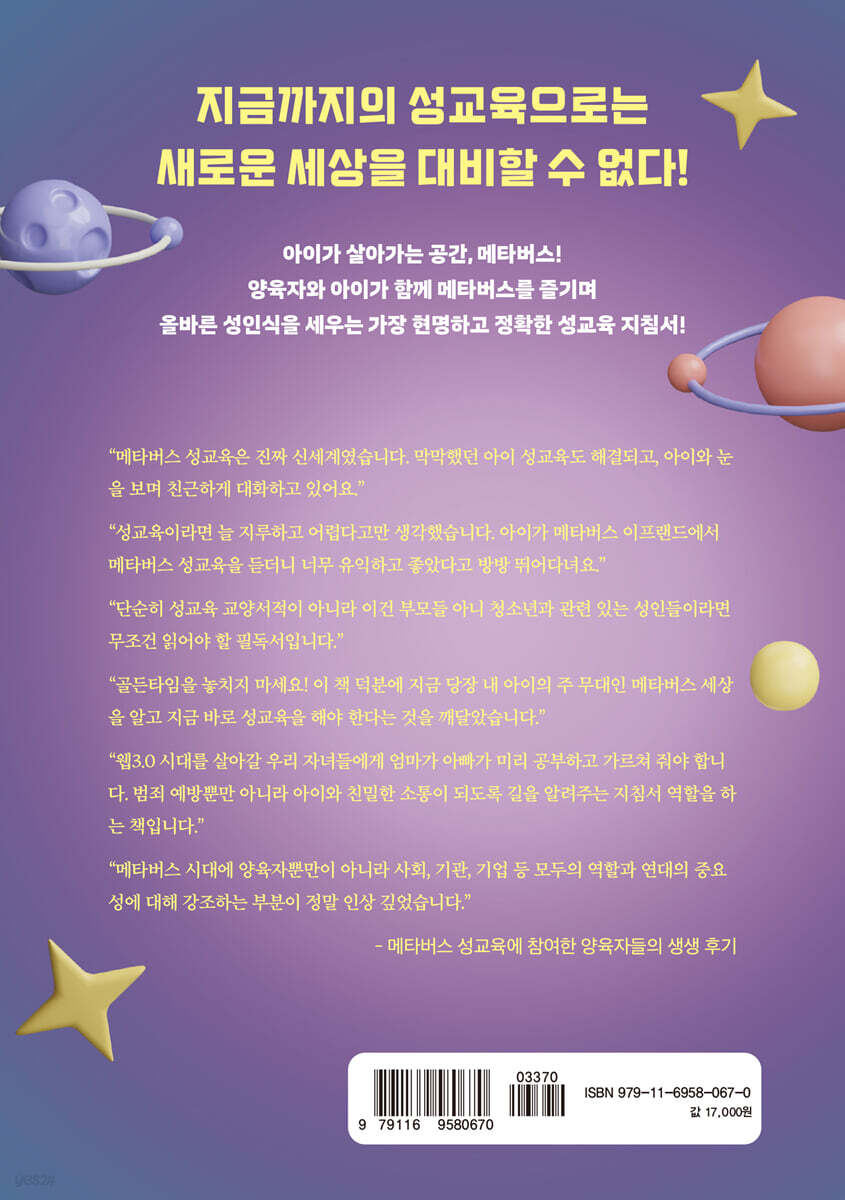 그럼 메타버스로 어떤 것들이 변화될까? 엄청나게 변하게 될 주요 세 가지를 말하고자 한다. 바로 미디어, 교육, 성산업이다. 이 세 가지는 매우 유기적으로 연결되어 있다. ---p.47 메타버스 안에는 다양한 일들이 일어나지만, 양육자가 개입하지 못하는 이유는 잘 모르기 때문이다. 메타버스가 어디까지 어떻게 발전했는지, 메타버스 시대의 성문화가 어떻게 변하고 우리 아이들에게 어떤 영향을 줄 것인지 알아차리지 못하면, 우리 아이들이 위험에 빠져도 도와줄 수 없게 된다. 그러니 메타버스 시대에 어떤 것들이 변할지 관심을 가지는 것이 필요하다. 더불어 메타버스 세계는 현실을 기반으로 만들어진다. 결국 메타버스도 인간의 지식과 삶, 상상력이 합쳐져서 만들어진 것이기 때문이다. 그러니 우리 아이들이 사용하는 메타버스 안의 건강하고 안전한 성문화를 원한다면, 이 사회의 어른으로서 아이들에게 부끄럽지 않은 현실 속의 성문화부터 만들어가야 할 것이다. ---p.86 메타버스는 분별력 있게 판단할 수 있는 능력이 중요하다. 현실과 가상을 구분하면서 적절하게 다양한 자아가 공존할 수 있도록 컨트롤할 수 있는 선에서 사용해야 한다. 그러기 위해서는 아이가 생각하는 것들을 가볍게 여기고 무시하지 않아야 한다. 양육자가 아이의 생각과 고민을 함께해 주고 아이가 분별력 있게 결정할 수 있도록 옆에서 도와줘야 한다. 비록 그것이 아주 사소하고 하찮은 사안이라고 느껴진다 해도, 무시하지 않고 함께 고민해 줬으면 한다. 만약 아이의 말을 가볍게 생각한다면 아이도 진지하게 고민해서 판단하는 게 아니라 그저 그렇게 호기심과 욕구에 따라 움직일 수 있는 것이다. 아이가 주체적으로 메타버스 사용을 선택할 수 있도록 지도하려면, 아이의 말을 무시하지 않고 끝까지 들어주어야 한다. 그리고 아이의 고민이나 불안을 가볍게 여기지 않고 함께 생각을 보태주는 것이 필요하다. ---p.127 가정, 교육기관, 국가, 전문가가 힘을 합해야 한다. 어른들이 적극적으로 변화를 취하지 않으면 우리 아이들은 점점 더 큰 위험에 빠질 수밖에 없다. 강의 때마다, 책을 쓸 때마다 강조하는 부분이지만, 정말 어른들이 정신 차려야 한다. 아직도 성교육을 해줘야 하나 말아야 하는 고민만 하고 행동하지 않는 양육자, 권력에 의해 움직이며 옳고 그름이 무엇인지 판단할 의욕 없이 과거로 돌아가려는 교육 책임자, 사회적으로 심각한 문제라는 것을 알고 있음에도 적극적으로 움직이지 않는 국가 모두가 아이들을 위험으로 몰아넣는 원인이라는 것을 알아야 한다. ---p.176 집에서 성에 관한 이야기를 편하게 나눌 수 있고 질문할 수 있는 분위기가 중요하다. 그런 분위기를 만들지 못하면 아이들은 점점 궁금한 점이 있어도 양육자에게 가정에서 질문하지 않게 된다. 디지털 기기 사용 습관도 유아기 때부터 제대로 갖도록 하는 게 필요하다. 너무 일찍 디지털 기기를 사용하는 아이들은 인지, 언어, 정서, 행동 발달에 부정적 영향을 받을 수도 있다는 연구는 수없이 많이 있다. 그러니 유아기 때부터 성교육을 제대로 해주는 것은 아이가 평생 건강한 성인식을 가지고 살아갈 수 있는 밑바탕을 만들어주는 것이며, 디지털 기기 사용에 대한 좋은 습관을 가지게 하는 것은 아이가 건강하게 발달할 수 있도록 해주는 것이다. ---p.224 |