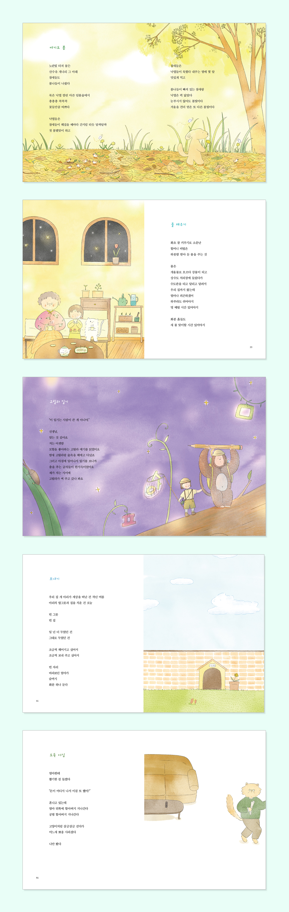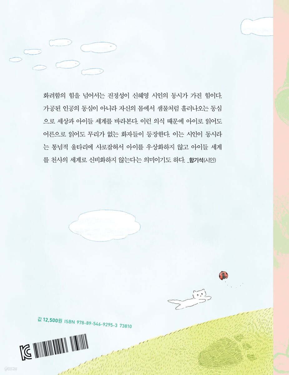 1부 처음 보는 것처럼 여기도 봄 12 · 처음 보는 것 14 · 두꺼비를 만났습니다 16 · 햇살을 등지고 있으면 18 · 퐁 퐁 끙 끙 19 · 만만한 창문 20 · 물 재우기 22 · 고둥이 궁금해서 24 · 자전거 타고 가요 26 · 오늘만 개구리 28 2부 콩만 한 걸 굴려서 달콤한 걸 첨가해 포도 한 송이 32 · 수학 시간에 나온 사자 33 · 숨바꼭질 달팽이 36 · 해바라기 농사 38 · 언니 할 사람 40 · 암호 42 · 고릴라 일기 44 · 아빠가 궁금한 날 46 · 천적 48 · 오래된 시소 50 · 노래를 불러 52 3부 도토리는 궁리 중 도토리는 궁리 중 56 · 개미 산 58 · 감자 이삭 줍기 59 · 쉿! 60 ·막대사탕 62 · 보내기 64 · 고둥 껍데기와 소라게 66 · 소금이 온다 68 · 겨울 호수 72 · 씨앗 하나 떨굴 때마다 74 · 초대합니다 76 4부 공룡아, 이사 와 줘서 고마워 눈으로 80 · 급식 시간 82 · 도둑 아님 84 · 나보다 심한 놈 86 · 가오리연 88 · 워메 할머니 90 · 어느 날 학교에서 92 · 연꽃 93 · 샌드위치 먹기 좋은 공원 94 · 공룡의 이삿날 96 · 산책 시간 98 해설 함기석 100 |