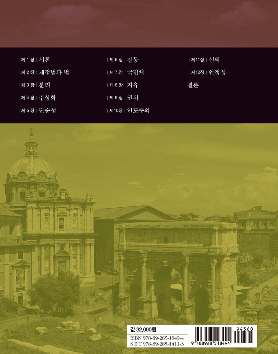 약어 목록 제1장 서론 Ⅰ. 로마법의 원리 Ⅱ. 선행연구 Ⅲ. 과제의 설정 제2장 제정법과 법 Ⅰ. 여기에서 제정법은 국가에 의한 모든 일반적 법제정을 의미한다 Ⅱ. 로마의 원리 Ⅲ. 로마의 법전편찬 Ⅳ. 의결법률(leges rogatae)과 위임법률(leges datae) Ⅴ. 입법자로서의 원로원 Ⅵ. 황제의 칙법 Ⅶ. 고시 Ⅷ. 사비니의 입법에 대한 태도 Ⅸ. 로마 관습법 제3장 분리 Ⅰ. 분석기술로서의 법학. 독일과의 비교 Ⅱ. 법과 법 아닌 것의 분리 Ⅲ. 신성법과 세속법의 구별 Ⅳ. 공법과 사법의 준별 Ⅴ. 사법私法 영역내에서의 구별, 로마시의 관점 Ⅵ. 다양한 분리과정의 결과 Ⅶ. 19세기 독일법학에서의 분리 원리 제4장 추상화 Ⅰ. 사안판결과 추상적 법규칙 Ⅱ. 로마적 태도: 추상화에 대한 주저 Ⅲ. 소권법적 취급 Ⅳ. 추상적 정의定義에 대한 거부감 Ⅴ. 법규칙의 추상적 정식화에 대한 거부감 Ⅵ. 체계화 시도 제5장 단순성 Ⅰ. 로마의 원리: 단순성, 게르만법의 복잡성ㆍ다종성과의 대조 Ⅱ. 사법상私法上 로마법의 원리 Ⅲ. 공법 Ⅳ. 단순성과 명료성을 추구하는 로마적 표현으로서 로마법상의 개념 제6장 전통 Ⅰ. 로마인들의 삶과 로마법상의 전통, 로마의 원리 Ⅱ. 헌법상 로마법의 원리 Ⅲ. 절차법상 로마법의 원리 Ⅳ. 사법私法에서의 보수적 성향 Ⅴ. 법비판 및 법정책의 거부 Ⅵ. 법사학의 부재 Ⅶ. 로마법사 및 로마법학사에서의 시대성 구분의 부재 제7장 국민체 Ⅰ. 국민체 개념 Ⅱ. 라틴국민체, 이탈리아국민체, 로마통치권 국민체 Ⅲ. 로마의 역사적 사명 Ⅳ. 로마법의 발전요소로서 로마국민체 감정 제8장 자유 Ⅰ. 로마의 자유개념 Ⅱ. 헌법상 자유원리 Ⅲ. 사법상私法上 자유원리, 사법私法의 개인주의적 특성 Ⅳ. 개인과 국가에 대한 관계에서의 자유원리 제9장 권위 Ⅰ. 권위의 개념, 로마법의 원리 Ⅱ. 로마 가내家內에서의 권위 원리 Ⅲ. 로마국 및 정무관과 국가구성원 간의 관계에서의 권위 원리 Ⅳ. 정무관의 책임 Ⅴ. 권력분립이 없음 Ⅵ. 정무관의 자문회, 특히 원로원 Ⅶ. 원수(princeps)의 ‘카리스마적 권위’ Ⅷ. 법률가들의 권위 Ⅸ. 자유와 구속 제10장 인도주의 Ⅰ. “인도주의”의 의미와 역사 Ⅱ. 가家에서의 인도주의 원리 Ⅲ. 로마시민 내에서의 인도주의 원리 Ⅳ. 외인들을 규율하는 법에서의 인도주의 원리 Ⅴ. 노예 관련법에서의 인도주의 원리 제11장 신의 Ⅰ. 로마의 신의 Ⅱ. 무방식의 법률행위 Ⅲ. 계약에 대한 엄격한 구속성 Ⅳ. 신의성실(bona fides) Ⅴ. 선서상의 신의 Ⅵ. 법원론상의 신의 원리 Ⅶ. 신의에 기반한 계속적 관계 제12장 안정성 법적 안정성의 개념 Ⅰ. 법이 불법과의 투쟁에서 관철되리라는 확실성으로서의 법적 안정성 Ⅱ. 무엇이 법인가에 대한 확실성으로서의 법적 안정성 결론 역자 후기 색인 |