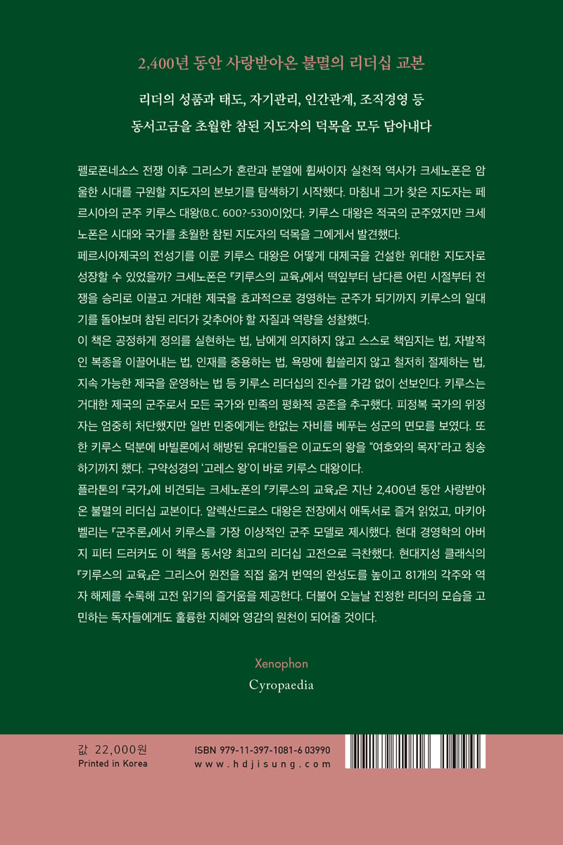 불멸의 리더십 교본 고대 그리스의 역사가이자 철학자인 크세노폰이 기원전 4세기에 집필한 『키루스의 교육』(그리스어로 ‘키로파에디아’)은 지난 2,400년 동안 사랑받아온 인류 최고의 리더십 교본이다. 현대 경영학의 아버지 피터 드러커가 말했듯이 군주의 리더십 또는 지도력을 체계적으로 다룬 역사상 ‘가장 오래된(最古)’ 책일 뿐만 아니라 ‘가장 으뜸인(最高)’ 책이기도 하다. 역사가 이 책의 가치를 잘 증명한다. 동서 융합의 대제국을 건설한 알렉산드로스 대왕은 앞서 거대한 페르시아 제국을 세운 키루스 대왕을 롤모델로 삼았다. 그는 전장에 나갈 때마다 『키루스의 교육』을 지참해 애독서로 즐겨 읽었다. 유대인들도 키루스 대왕을 메시아로 칭송했다. 바빌론 포로 생활에서 해방시켜준 키루스를 “여호와의 목자”라고 찬양했다. 선민사상이 투철한 유대인들이 이교도의 왕을 높이는 것은 매우 이례적인 일이다. 르네상스 시대 정치사상가인 니콜로 마키아벨리도 『군주론』에서 키루스 대왕을 역사상 가장 훌륭한 군주로 여겼다. 『키루스의 교육』에 직접적인 영향을 받은 『군주론』은 모세, 로물루스, 테세우스와 함께 키루스 대왕을 가장 이상적인 군주 모델로 제시했다. 오늘날은 어떠한가? 피터 드러커가 동서양 최고의 리더십 고전으로 꼽을 만큼 지금도 『키루스의 교육』은 훌륭한 지도자에 대한 지혜와 영감의 풍부한 원천이 되고 있다. 실천적 역사가 크세노폰, 참된 리더를 찾아나서다 크세노폰은 『키루스의 교육』을 어떻게 저술하게 되었을까? 크세노폰은 그리스가 아테네와 스파르타의 펠로폰네소스 전쟁으로 혼란에 빠지자 암울한 시대를 구원할 참된 리더의 본보기를 탐색하기 시작했다. 그는 그리스 사람이었지만, 당시 라이벌 국가의 수장인 키루스에게서 본받을 만한 지도자의 덕목을 발견했다. 이른바 어느 한 ‘국가’, ‘민족’, ‘시대’의 이념적 편향에 빠지지 않고 오로지 인물의 됨됨이를 평가할 수 있었던 이유는 크세노폰의 생애나 철학과 밀접한 관련이 있다. 크세노폰은 그리스 아테네에서 태어났지만 페르시아 내전이 발생한 당시 용병으로 참여했다. 고국으로 돌아왔을 때 아테네에서는 적국 스파르타의 동맹국 페르시아에서 용병으로 활동했다는 이유로 추방당하고 만다. 크세노폰은 여생을 스파르타의 변방에서 보내야 했는데, 이때 『키루스의 교육』을 비롯해 여러 저작을 저술했다. 그리스와 페르시아라는 두 제국 사이에서, 그리고 아테네와 스파르타라는 두 도시 사이에서 어느 한쪽에도 속하지 않은 ‘경계인’이자 ‘주변인’으로 살아갔다. 경계에 설 때 비로소 현실을 객관적으로 냉철하게 꿰뚫어 볼 수 있는 법. 크세노폰은 그리스가 추구해야 할 참된 지도자상을 정확하게 찾아낼 수 있었다. 소크라테스의 제자인 크세노폰은 또 다른 제자 플라톤과 비견된다. 그리스가 위기에서 벗어나는 방법에 대해, 플라톤은 『국가』에서 ‘철인정치(哲人政治)’와 같은 그럴듯하지만 이상적인 대안을 제시한 반면, 크세노폰은 『키루스의 교육』에서 지금 여기 발붙이고 사는 땅 위에서 실천할 수 있는 현실적인 해결책을 모색했다. 실천적 역사가 크세노폰은 직접 몸으로 겪고 성찰한 경험과 지식을 토대로 자신이 추구하는 철학을 『키루스의 교육』에 오롯이 녹여냈다. 동서고금을 초월한 키루스 리더십의 진수 크세노폰이 어느 한쪽의 정치나 이념에 치우치지 않고 모두에게 통하는 리더십의 진수를 찾아나선 덕분에 『키루스의 교육』은 지금까지 오랜 세월 동안 많은 이에게 사랑을 받고 있다. 『키루스의 교육』은 어린 시절부터 시작해 세상을 떠날 때까지 키루스의 일대기를 다루는 전기 형식을 띠고 있지만, 단순한 위인전은 아니다. 크세노폰은 키루스의 덕목에서 영감을 받았으나, 거꾸로 자신이 추구하던 리더십의 철학을 키루스에게 투영하기도 한다. 이 점이 『키루스의 교육』의 전체 콘셉트와 구성 방식에 큰 영향을 미쳤다. 예컨대, 책 초반에 어머니가 키루스를 데리고 외할아버지 나라 메디아에 방문하는 이야기가 나온다. 그 어머니에 그 아들이라고 했던가. 어머니는 아들에게 메디아와 페르시아가 추구하는 정의(正義)가 어떻게 다른지 비교해서 가르친다. 메디아에서는 군주의 명령이 곧 법이었지만, 페르시아에서는 군주 위에 법이 존재했다. 페르시아는 ‘만인 앞에 평등한 법’이라는 정의를 추구했는데, 이것은 크세노폰이 추구하던 가치이기도 했다. 키루스는 이러한 정의를 지도자로서 평생의 대원칙으로 삼았다. 『키루스의 교육』은 키루스가 전쟁의 선두에 서서 주변국을 하나씩 점령해가고 마침내 거대한 페르시아 제국을 세우는 과정을 전개했다. 이 과정에서 키루스가 일개 장군에서 제국의 군주로 점차 리더십이 성장해가는 모습을 보여준다. 리더로서 스스로를 절제하는 ‘자기관리’부터 주변 동료에게 인덕을 베푸는 ‘인간관계’, 다양한 민족으로 구성된 거대한 페르시아 제국을 갈등 없이 평화롭게 통치하는 ‘조직경영’까지 지도자가 갖춰야 할 거의 모든 덕목을 담고 있다. 오늘날에도 우리는 한 사람