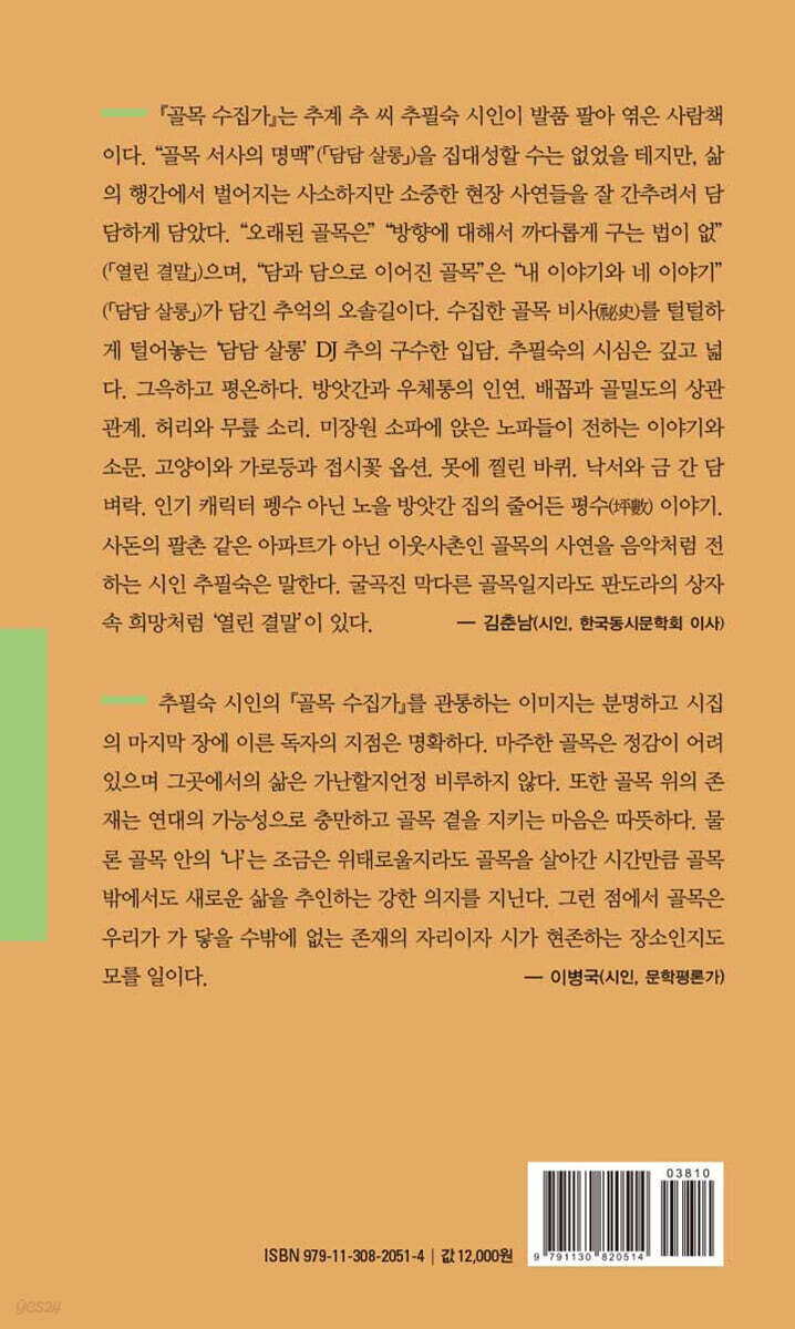『골목 수집가』는 추계 추 씨 추필숙 시인이 발품 팔아 엮은 사람책이다. “골목 서사의 명맥”(「담담 살롱」)을 집대성할 수는 없었을 테지만, 삶의 행간에서 벌어지는 사소하지만 소중한 현장 사연들을 잘 간추려서 담담하게 담았다. “오래된 골목은” “방향에 대해서 까다롭게 구는 법이 없”(「열린 결말」)으며, “담과 담으로 이어진 골목”은 “내 이야기와 네 이야기”(「담담 살롱」)가 담긴 추억의 오솔길이다. 수집한 골목 비사(?史)를 털털하게 털어놓는 ‘담담 살롱’ DJ 추의 구수한 입담. 추필숙의 시심은 깊고 넓다. 그윽하고 평온하다. 방앗간과 우체통의 인연. 배꼽과 골밀도의 상관관계. 허리와 무릎 소리. 미장원 소파에 앉은 노파들이 전하는 이야기와 소문. 고양이와 가로등과 접시꽃 옵션. 못에 찔린 바퀴. 낙서와 금 간 담벼락. 인기 캐릭터 펭수 아닌 노을 방앗간 집의 줄어든 평수(坪數) 이야기. 사돈의 팔촌 같은 아파트가 아닌 이웃사촌인 골목의 사연을 음악처럼 전하는 시인 추필숙은 말한다. 굴곡진 막다른 골목일지라도 판도라의 상자 속 희망처럼 ‘열린 결말’이 있다. - 김춘남 (시인, 한국동시문학회 이사)