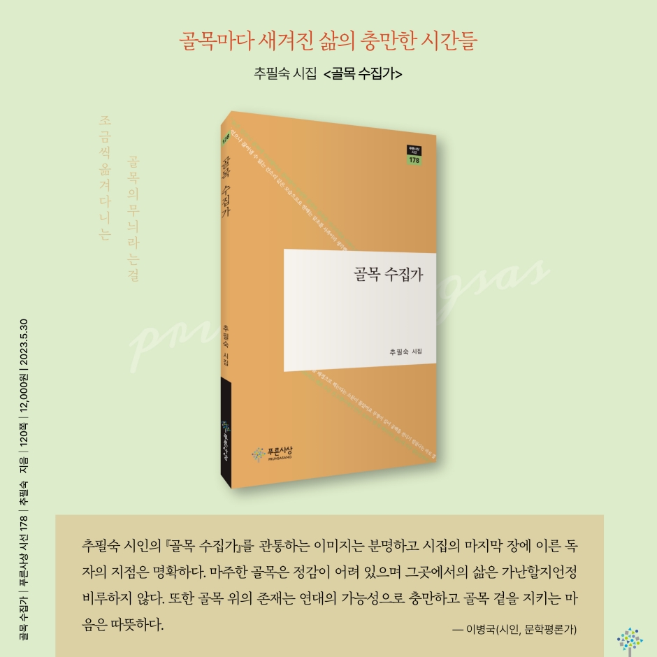 시(詩)의 어느 골목을 걷다가 걸음걸이는 말투처럼 쉬이 바뀌지 않는다는 걸 깨달았네. 이제야, 네 얘기를 내 얘기처럼 쓰게 되었네. 작품 세계 추필숙 시인의 『골목 수집가』를 관통하는 이미지는 분명하고 시집의 마지막 장에 이른 독자의 지점은 명확하다. 마주한 골목은 정감이 어려 있으며 그곳에서의 삶은 가난할지언정 비루하지 않다. 또한 골목 위의 존재는 연대의 가능성으로 충만하고 골목 곁을 지키는 마음은 따뜻하다. 물론 골목 안의 ‘나’는 조금은 위태로울지라도 골목을 살아간 시간만큼 골목 밖에서도 새로운 삶을 추인하는 강한 의지를 지닌다. 그런 점에서 골목은 우리가 가 닿을 수밖에 없는 존재의 자리이자 시가 현존하는 장소인지도 모를 일이다. 시집에 담긴 시편을 읽기 전에 골목에 관한 이야기를 좀 더 해보려고 한다. 골목을 상상하는 우리는 추필숙 시인이 형상화한 바에 어떠한 의문도 제기할 수 없다. 예컨대, 「주차 금지」에서 드러나듯 “늙은 타이어 하나” 앞에서 “젊은 타이어 넷”이 “꼼짝 못 하고 물러간다”는 표현이 구현하는 아이러니한 유쾌함처럼 시간과 공간의 층위를 장소의 정동으로 전환하여 골목이 지닌 내밀한 삶의 어떤 양태를 독자로 하여금 상상하게끔 한다. 이는 우리가 경험한 삶의 과정에서 골목이 환기하는 기억과 그로부터 야기되는 보편적 정서를 공유하기 때문이다. 도시화가 이루어지는 과정에서 의도적으로 구획된 공간이 주는 삭막함과는 달리 골목은 이웃들이 옹기종기 모여 살아가는, 일종의 어우러짐이라는 공동체적 가치를 실현한다. (중략) 골목을 떠나 다른 세계로 나아가는 것 역시 또 다른 삶의 골목을 마련하는 일인지도 모른다. “삶이 어떻게 피어나는지” 알기 위해 씨앗을 “묻고/햇살 옆에 쪼그리고 앉아” “다시 태어”날 필요가 있다(「씨앗」). 길을 열어 새로운 골목을 맞이하는, 마중하는 일을 수행해야 한다. “하늘 한 페이지가 넘어가”기 위해서는 “삶은 언제나 끝에서 시작”(「늦 꽃」)한다는 말처럼 골목 끝을 골목의 시작으로 전유할 수 있어야 한다. 골목에의 정주(定住)가 골목에의 안주(安住)가 되지 않도록, 존재의 내밀함이 꽃 피어나도록 “엎어지고 포개지고 다시 물러나고 흩어”(「11월, 해파랑길」)짐의 세계로 나아갈 필요가 있는 것이다. 그렇게 열린 장 속에서 어떤 골목이 새로 마련될지 알 수 없기에 그것은 두려운 일이다. 그러나 이미 골목을 경험해본 존재라면 흔들림 없이 자신을 바로 세울 수 있을 것이라고 추필숙 시인의 시는 말하고 있다. - 이병국(시인, 문학평론가) 작품 해설 중에서 |