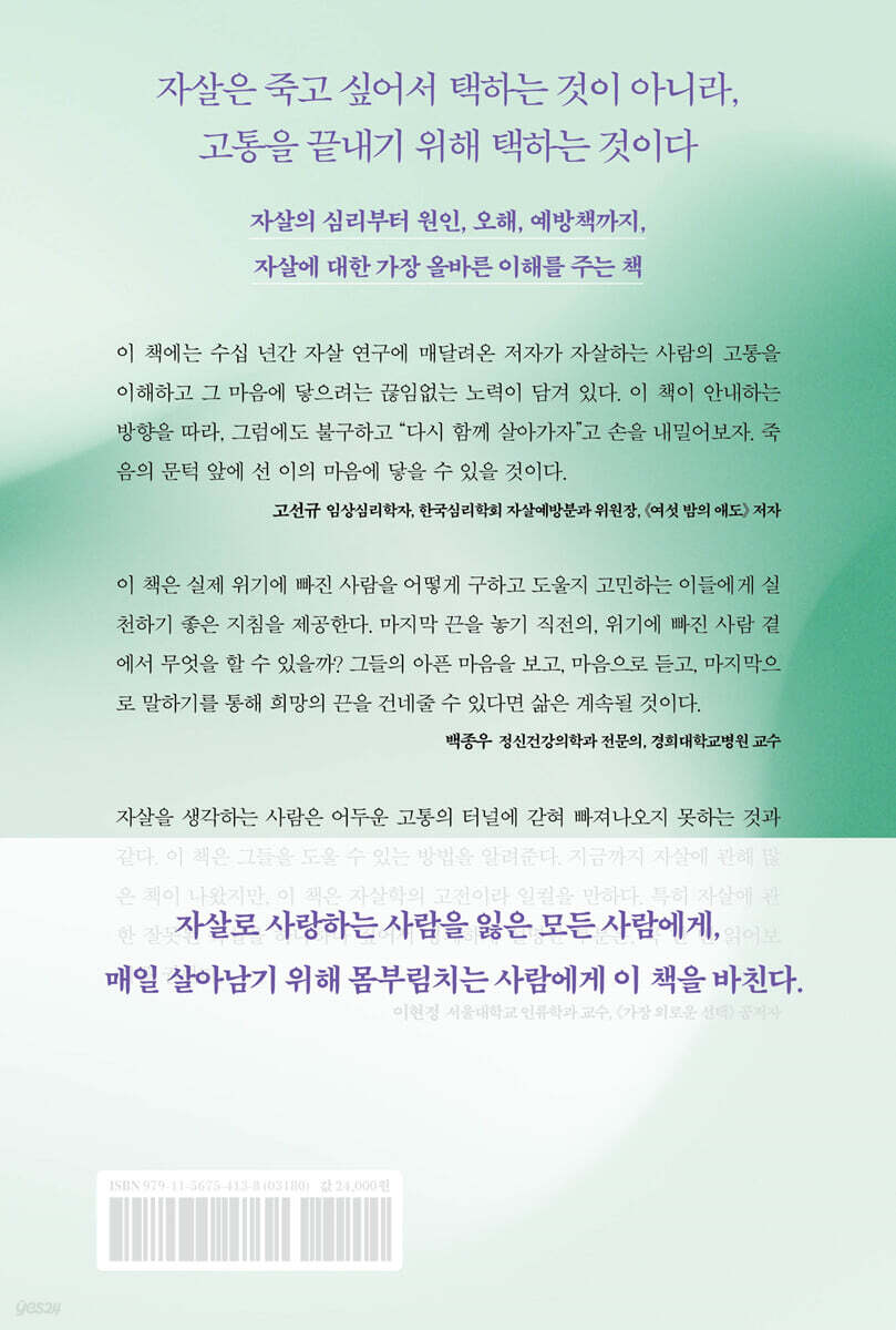 안타깝게도 우리는 자살하는 사람의 심리를 완벽히 알 수 없다. 그 답을 해줄 수 있는 사람은 이미 곁에 없기 때문이다. 자살을 시도했다가 다시 삶을 이어가는 사람들, 누군가를 자살로 잃은 사람들의 이야기를 통해서 그 마음을 짐작할 수 있을 뿐이다. 이 책에는 수십 년간 자살 연구에 매달려온 저자가 자살하는 사람의 고통을 이해하고 그 마음에 닿으려는 끊임없는 노력이 담겨 있다. 이 책이 안내하는 방향을 따라, 그럼에도 불구하고 “다시 함께 살아가자”고 손을 내밀어보자. 죽음의 문턱 앞에 선 이의 마음에 닿을 수 있을 것이다. - 고선규 (임상심리학자, 한국심리학회 자살예방분과 위원장, 『여섯 밤의 애도』저자)