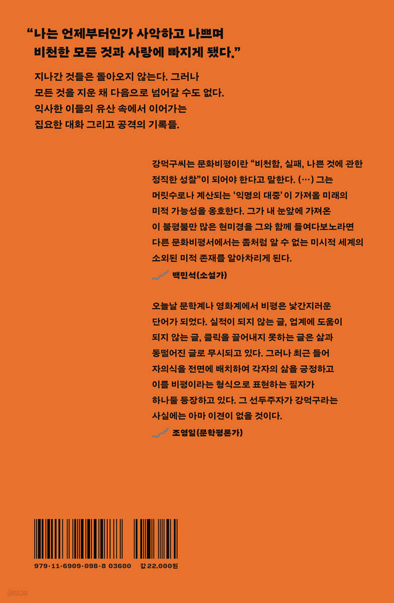 1부 오늘: 내일과 어제 힙스터리즘(1), 우리의 취향이 막다른 곳에 이르렀을 때 힙스터리즘(2), 내가 죽어 누워 있을 때 힙스터리즘(3),「구모」를 보고 한 생각 힙스터리즘(4), 피치포크의 수정주의적 전환에 관한 메모 플레이리스트, 그것은 나의 즐거움: 취향, 폭력, 짐 오로크-기능 문화비평: 비천함, 실패, 나쁜 것에 관한 정직한 성찰 비평? 라이프 스타일? 우리는 웃고 있다 2022년: 조각난 시네필리아에 관한 메모 2부 내면: 유머와 비극 유머의 보수적 용례: 하이데거가 아니라 놈 맥도널드의 경우 루이 C. K. vs. 강덕구 방 안에 있는 남자(악마): 영혼, 성격, 내면 그래서 무엇보다 사랑에 빠진 기분: 동시대 영화의 형식에 대한 고찰 팝음악에서 말년의 양식이란 무엇인가?: 사라진, 실종된, 은둔한, 그리고 다시 돌아오는 음악 3부 우리: 한국과 한국인 전통은 아무리 더러운 전통이라도 좋다: 250의 《뽕》 에 관해 「버닝」은 문화의 폭발이다 아프리카TV의 지속 시간: 리얼의 무대화 홍상수에 관한 별 볼 일 없는 생각 정성일-기능에 관해서 혹은 우리가 앓고 있는 질병은 오래된 것이다 4부 추문: 도발과 공격 「살인마 잭의 집」에 관한 12편의 메모 세르주 다네의 「‘카포’의 트래블링」에 대하여 왕빙은 어떤 문제인가? 정전은 오늘부터 내일까지 우리를 괴롭힌다 물질을 불태우고, 타오르는 물질에서 말런 브랜도의 손, 존 웨인의 손: 영화라는 가치 체계 에필로그: 완전한 무정부 사태를 회고하며 |
