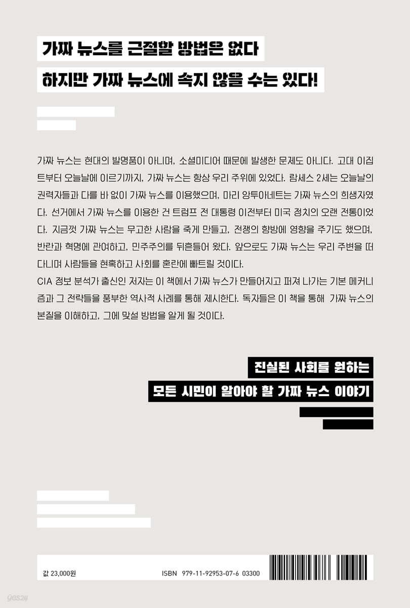 제1막 가짜 뉴스는 생각보다 훨씬 오래전부터 있었다 제1장 가짜 뉴스의 영향 제2장 가짜 뉴스의 시작 ―보론: 인쇄기 제3장 가짜 뉴스와 프랑스 왕실 ―보론: 최초의 신문 제4장 가짜 뉴스와 미국의 건국자들 제5장 가짜 뉴스, 과학을 공략하다 ―보론: 전신이 가짜 뉴스에 끼친 영향 제2막 황색 언론과 선전과 역정보 제6장 황색 언론 ―보론: 황색 언론에 대한 역풍 제7장 가짜 뉴스와 전쟁 제8장 인종차별 음모론이 가짜 뉴스가 되다 보론: 실제가 아니었던 외계인 침공 제9장 가짜 뉴스와 흡연과 건강 ―보론: 텔레비전의 도입 제10장 가짜 뉴스 첩보전 ―보론: 인터넷에 오신 것을 환영합니다 제3막 가짜 뉴스 홍수의 시대 제11장 디지털 시대의 개막 ―보론: 사실 확인 웹사이트 제12장 가짜 뉴스의 대유행 제13장 가짜 뉴스, 선거를 장악하다 ―보론: 세계 각지에서 무기로 사용된 가짜 뉴스 제2부 가짜 뉴스와 싸우는 방법 제14장 사실 VS 의견 ―연습문제: 사실일까, 아니면 의견일까? 제15장 나는 편향되었고, 너도 편향되었고, 우리 모두 편향되었다 ―연습문제: 자신의 편견을 확인하기 제16장 뉴스 미디어의 편향 이해하기 ―연습문제: 기사에서 편향을 찾아낼 수 있을까? 제17장 가짜 뉴스 기사 알아보기 ―연습문제: 진짜일까 가짜일까? 제18장 여론 조사와 가짜 통계 ―연습문제: 여론 조사 연습 제19장 당신의 눈은 거짓말을 한다: 가짜 사진과 동영상 알아보기 ―연습문제: 어떻게 포토샵 처리를 했을까? 제20장 인터넷 밈은 뉴스가 아니다 ―연습문제: 신뢰할 것인가, 신뢰하지 않을 것인가? 제21장 자칭 긴급 속보를 대하는 방법 ―연습문제: 긴급 속보 분류하기 제22장 결론 |