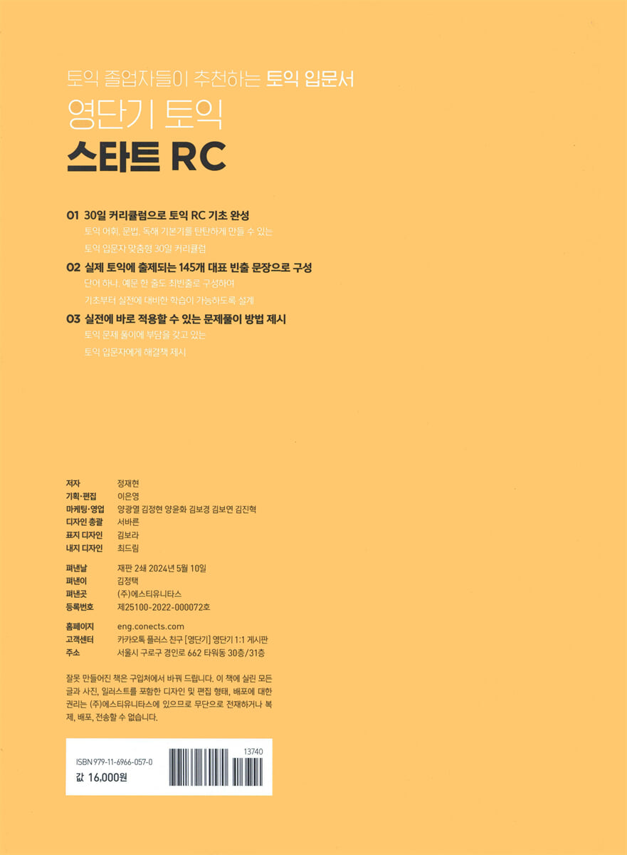 [STEP 1. 개념 정리 - STEP 2. 유형 훈련 - STEP 3. 실전 훈련] 순으로 기본 실력을 효과적으로 향상시킬 수 있는 체계적 학습 시스템을 제공한다. 특히 유형 훈련에서는 문제 유형을 확인한 후 문장 구조나 문제 풀이의 단서를 파악하여 문제를 푸는 과정을 단계적으로 제시하여 학습한 문법 포인트를 문제 풀이에 연결하는 방법을 알려 준다. 2. 약점을 보완하는 연습 훈련 문제 풀이를 통해 학습한 어휘와 문법 포인트를 바로바로 확인하고 점검할 수 있다. 토익에서 자주 정답으로 출제되는 표현이나 문법 사항을 정답으로 제시하여 실전을 대비해 정답 유형에 친숙해질 수 있도록 구성하였다. 3. 친절하고 자세한 설명 개념 정리 페이지에서 우측 보조단을 통해 학습에 도움이 되는 요소들을 추가적으로 제공한다. 보조단에는 문법 용어 설명 및 보충 설명, 필수 어휘 정리, 고득점 포인트 정리, 실수하기 쉬운 내용 등을 담았다. 4. 위트 있는 그림을 통해 재미있고 효과적인 학습 제공 Part 5-6의 모든 Day마다 [토익에 자주 나오는 짝꿍 표현]을 그림으로 제시하여 연상을 활용한 암기를 통해, 쉽게 암기하고 암기한 내용을 오래 기억할 수 있도록 한다. 대표 문장의 상황도 그림과 연결하여 학습의 재미를 배가하였다. 토익 책은 지루하다는 편견을 깨고 재미는 물론 학습 효과까지 상승시키고자 하였다. [이 책이 필요한 학습자] - 토익 빈출 기초 문법을 빠르게 익혀 토익 700점 달성을 목표로 하는 학습자 - 가장 효과적인 방법으로 토익 기초 문법과 어휘, 독해를 익히고 싶은 학습자 - 딱딱하고 지루한 교재 대신 친절하고 재미있는 토익 교재로 공부하고 싶은 학습자 [이 책의 활용법] - 앞부분의 [토익 이렇게 나와요]를 읽고 Part 5, 6, 7의 최신 출제 경향을 파악한다. - [토익 학습 플래너] 페이지에 Day별 학습 내용을 기록하고, 한 번에 이해가 안 되는 내용은 다음날 반드시 복습한다. - 보다 상세한 설명이 필요하거나 독학이 어렵다면, 영단기에서 저자가 직접 설명해 주는 온라인 강의를 듣는다. (유료) |