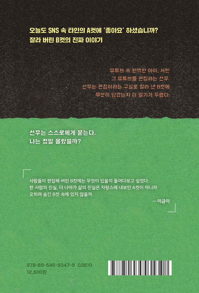 --- p.19 인터넷에서 재생되는 영상은 컴퓨터에 저장해 놓은 걸 보는 것과는 느낌이 사뭇 달랐다. (…) 앞으로 영상 자주 올려 달라는 댓글 다음에 자막이 재미있고 음악도 센스 있다는 댓글이 있었다. 심장이 쿵쿵 뛰었다. 가족이나 친척들에게 칭찬받는 것과는 비교가 되지 않았다. --- p.25 ‘#서빈이_생축’이라는 해시태그가 붙은 아이들 사진에 나는 없었다. 그뿐만 아니라 포카리스는 학교에서도 내게 알은체하지 않았다. 반 아이들 사이에서 불맛 떡볶이 먹방 영상 이야기가 나왔을 때도 서빈이는 내가 편집했다는 걸 말하지 않았다. 비밀로 해 달라고 했으면서도 아예 없는 존재처럼 되는 건 조금 서운했다. 내가 마치 편집하면서 잘라 낸 B컷이 된 것 같았다. --- p.51 나도 내 일에 열중해서 그 애들을 잊고 싶었다. 연락이 와도 까맣게 모르고 있다가 한참 뒤에야 보고 ‘어, 미안. 톡 온 줄 몰랐어.’라고 답하고 싶었다. 그래서 카톡 알림 소리를 꺼 놓았지만 명제랑 게임을 하면서도 자꾸만 휴대폰 쪽으로 신경이 쏠렸다. --- p.62 셋이 있는 영상을 여러 번 보았더니 이제 처음 같은 호기심이나 재미는 없었다. 그 대신 아이들의 본모습이 눈에 들어왔다. 아람이는 촐랑대는 편이고, 태하는 욕을 많이 하고 별일 아닌 일에 버럭 화를 낼 때가 많았다. 서빈이 또한 독단적일 때가 종종 있었는데 자칫 비호감으로 비칠 수 있는 모습들을 어떻게 편집하면 좋을지 이젠 영상을 보면 금방 감이 왔다. 학교나 써빈로긴에서의 모습과 날영상 속 민낯 사이에 느껴지는 괴리감을 줄이는 게 내 일이었다. --- p.99 내가 편집한 영상을 보는 사람들도 서빈이를 모든 걸 다 가진 아이로 여기며 부러워할 거다. 미호 엄마의 페이스북을 보는 사람들도, 숙모의 인스타그램을 보는 사람들도 마찬가지겠지. 현실과 편집된 세계 사이에는 누더기 차림의 신데렐라와 마법으로 화려하게 변신한 신데렐라의 차이만큼이나 거리가 있었다. --- p.103 서빈이가 남들에게 보여 주고 싶어 하는 모습, 내가 원하는 그 애의 모습으로 연출하기 위해 애썼다. 영상 속 서빈이가 눈을 찡긋하며 가위질하는 시늉을 하면 나를 그만큼 신뢰하는 것 같아 기쁘기까지 했다. 그렇게 나는 모든 것을 잘라 냈다. --- p.151 |