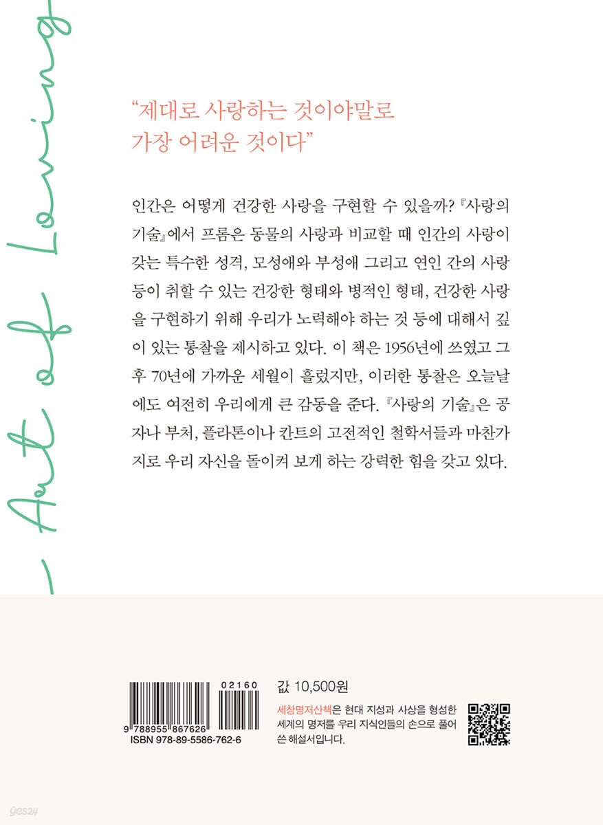 세계적 베스트셀러, 에리히 프롬의 『사랑의 기술』을 서울대학교 철학과 박찬국 교수의 해설로 만나다! 우리는 사랑에 대해서 얼마나 알고 있는가? 다양한 모습으로 존재하는 인간의 사랑 사랑은 모든 사람을 고뇌하게 만든다. 인생의 가장 큰 행복은 사랑이 주는 기쁨이지만, 사랑 때문에 슬픔에 빠진 사람은 자신이 세상에서 가장 불행하다고 느낀다. 불교에서는 사랑을 집착으로 보면서 평정한 마음을 유지하기 위해서는 사랑을 포함한 모든 집착에서 벗어나라고 한다. 그러나 사랑이라는 감정을 끊어 내는 일은 쉽지 않다. 사실 불가능하다고 보아야 할 것이다. 사랑은 어느 순간 갑자기 찾아오며 우리는 그 감정에 대해서 무력하다. 사랑에 빠진 사람은 자신의 모든 에너지를 사랑하는 대상에 쏟는다. 그렇기에 사랑을 불가능을 가능케 하는 힘이라고도 한다. 이 위대한 힘은 부모가 자녀의 양육을 기꺼이 도맡게 하고 연인이 서로를 위해 목숨을 바치게도 한다. 위대한 종교와 예술작품 역시 신과 아름다움에 대한 사랑에서 비롯된 것이다. 한편 사랑은 위험한 것이기도 하다. 성숙한 형태의 사랑이 아닌 집착의 형태를 띤 사랑은 상대방의 개성과 고유한 인격을 존중하지 않고 상대를 통해서 자신의 욕망을 구현하려고 한다. 이러한 사랑은 우리에게 성숙과 행복 대신 슬픔과 좌절만을 경험하게 한다. 그런데 과연 우리는 사랑을 잘 알고 있는가? 만약 우리가 동물과 같은 존재라면, 동물들이 본능에 따라 새끼를 자연스럽게 양육하는 것처럼 우리도 본능적으로 연인과 사랑을 하고 자녀를 키울 것이다. 그러나 인간은 동물과는 다르다. 프롬은 “인간은 약화된 본능과 함께 이성을 갖는 존재”라고 정의했다. 따라서 인간의 사랑은 훨씬 다양한 모습으로 존재한다. 친절하고 명료한 해설로 이해하는 사랑에 대한 에리히 프롬의 예리한 통찰 『사랑의 기술』에서 프롬은 동물의 사랑과 비교할 때 인간의 사랑이 갖는 특수한 성격, 모성애와 부성애 그리고 연인 간의 사랑 등이 취할 수 있는 건강한 형태와 병적인 형태, 건강한 사랑을 구현하기 위해 우리가 노력해야 하는 것 등에 대해서 깊이 있는 통찰을 제시하고 있다. 이 책은 1956년에 쓰였고 그 후 70년에 가까운 세월이 흘렀지만, 이러한 통찰은 오늘날에도 여전히 우리에게 큰 감동을 준다. 프롬이 이 책에서 제시하는 통찰은 예리하면서도 인간의 가능성에 대한 신뢰로 가득 차 있다. 이 책, 『에리히 프롬의 《사랑의 기술》 읽기』는 사랑에 대한 프롬의 통찰을 명료하고 이해하기 쉽게 소개하였다. 저자 박찬국 서울대학교 철학과 교수는 이 책에서 『사랑의 기술』을 집중적으로 해설하면서, 프롬에 대해 썼던 기존 글들의 내용을 사랑이란 주제를 중심으로 새롭게 조명하였다. 프롬의 사랑관, 나아가 프롬의 사상을 이해하고자 하는 사람이라면 반드시 이 책을 읽어 보기를 권한다. ◆ 세창명저산책 100권 기념 특별판 ◆ 시대를 관통하는 명저를 우리 지식인들의 눈으로 조망하며 명저 읽기의 새로운 지평을 연 세창명저산책 시리즈! 핵심을 담은 친절한 해설로 독자 여러분과 함께합니다. 현대 지성과 사상을 형성한 명저를 우리 지식인들의 손으로 풀어 쓴 세창명저산책 시리즈는 2012년 『들뢰즈의 《니체와 철학》 읽기』를 시작으로 100번째 『에리히 프롬의 《사랑의 기술》 읽기』에 이르기까지 10년 넘게 많은 독자들의 사랑을 받아 왔습니다. 세창미디어는 ‘오래 보는 책, 멀리 보는 책, 함께하는 책’을 모토로 새로운 지적 즐거움을 제공하는 세창명저산책 시리즈를 앞으로도 꾸준히 만들어 나갈 것입니다. 인문학을 깊이 사랑하는 독자 여러분의 많은 관심을 부탁드립니다. |