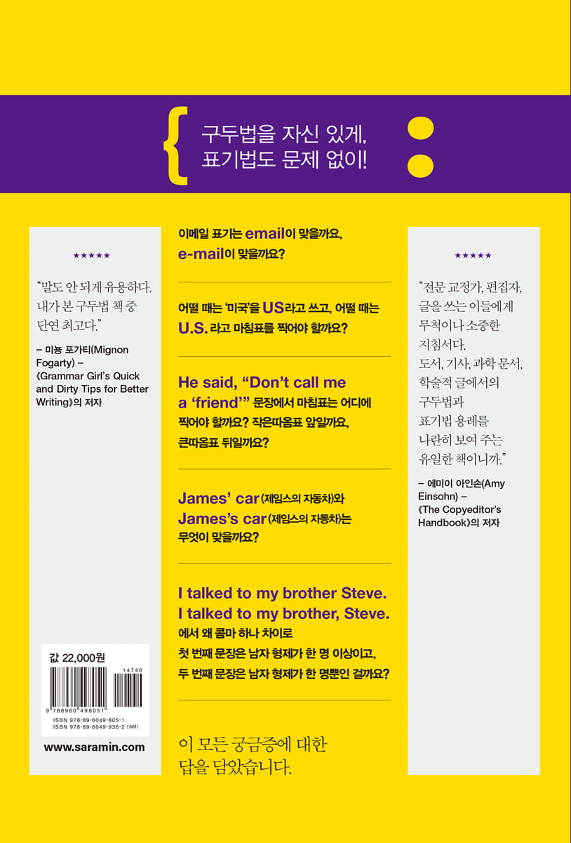 서문: 구두법은 쉽습니다. 어려울 때만 빼고. 표기법의 근거와 활용 이 책의 구성과 특징 CHAPTER 1 아포스트로피 대부분의 단수 명사 소유격 | s로 끝나는 단수 보통명사 소유격 s로 끝나는 단수 고유명사 소유격 | s로 끝나는 복수 명사 소유격 s로 끝나지 않는 복수 명사 소유격 | 이름에서 성(姓)의 복수형 소유격 고유명사에 쓰는 아포스트로피 | it의 소유격 its에는 아포스트로피를 쓰지 않는다 소유대명사 his, hers, yours, ours, theirs에는 아포스트로피를 쓰지 않는다 소유격을 만드는 기본 규칙의 예외 | 공동 소유 vs. 독립 소유 준 소유격 (Quasi Possessives) | 합성어의 소유격 소유격 vs. 형용사형 | 동명사의 소유격 이중 소유격 | 축약형에서의 아포스트로피와 기타 생략된 글자를 나타내는 아포스트로피 축약형 ’s vs. 소유격 ’s | 아포스트로피의 방향 아포스트로피로 시작하는 문장의 첫 글자는 대문자로 | 개별 문자의 복수형을 만드는 아포스트로피 숫자의 복수형에는 아포스트로피를 쓰지 않는다 | 소유격 아포스트로피가 들어간 고유명사 복수형 소유격 아포스트로피가 들어간 고유명사 단수 소유격 | 소유격 아포스트로피가 들어간 고유명사 복수 소유격 동사로 쓰이는 약어들 | 다른 구두점과 함께 쓰이는 아포스트로피 CHAPTER 2 쉼표 쉼표는 표기법에 따라 쓰임에 거의 차이가 없다 | 열거된 항목을 구분하는 쉼표 명사 앞의 비등위 형용사에서의 쉼표 | 자체 쉼표가 쓰인 열거 항목과 복잡한 열거 항목의 경우: 쉼표 대신 세미콜론 | and 대신 & 기호를 쓴 경우의 쉼표 여러 개의 부사나 반복되는 부사들을 구분하는 쉼표 | 문장의 첫 단어나 구 뒤의 쉼표 독립절을 구분하는 쉼표 | 복합 술어, 복합 주어 등을 구분하는 쉼표 주절 앞에 종속절이 올 때 쉼표 | 주절 뒤에 종속절이 올 때 쉼표 계속적 용법의 관계대명사절 앞에 있는 쉼표 | 동격 앞의 쉼표 형용사, 부사, 기타 삽입된 묘사어들을 구분해 주는 쉼표 생각이나 관찰에 따른 의견을 나타내는 삽입 어구 앞의 쉼표 | 호칭을 구분해 주는 쉼표 인용문을 구분해 주는 쉼표 | 반복되는 패턴에서 생략된 단어들을 나타내는 쉼표 is is, in in, that that처럼 반복되는 단어들 사이의 쉼표 | 영어 주소에서의 쉼표 나이, 거주 도시, 소속 정당 뒤의 쉼표 | 측정 단위에서의 쉼표 too, also, either에서 쉼표 | however, therefore, indeed에서 쉼표 including, such as, 그 외 유사한 표현에서 쉼표 | etc.에서 쉼표 et al., and so forth, and the like에서 쉼표 | Yes와 No에서 쉼표 respectively에서 쉼표 | oh, um, ah, well 등에서 쉼표 Inc., Ltd., 그리고 유사한 약어에서 쉼표 | PhD, MD, MA, DDS, JD, 그 외의 학력 표현에서 쉼표 Jr., Sr., II, III 등에서 쉼표 | 주, 국가, 지방, the District of Columbia (DC/D. C.)에서 쉼표 날짜와 연도에서 쉼표 | 중간에 쉼표가 들어가는 기관명 중간에 쉼표가 들어가는 작품명 | not으로 시작하는 명사구에서 쉼표 not only A but B 구 등에서 쉼표 | please에서 쉼표 the more ~ the less, the more ~ the more 등에서 쉼표 | 큰따옴표와 함께 쓰일 때 쉼표 작은따옴표와 함께 쓰일 때 쉼표 | 아포스트로피와 함께 쓰일 때 쉼표 괄호와 함께 쓰일 때 쉼표 | 줄임표와 함께 쓰일 때 쉼표 하이픈이나 엔 대시가 쓰일 때 쉼표 | 프라임 기호나 기타 측정 기호와 함께 쓰일 때 쉼표 명확성을 위해 쉼표를 쓰는 경우 | 느낌표나 물음표로 끝나는 고유명사 뒤의 쉼표 문장 부호가 너무 많아서 쉼표를 생략하는 경우 | 구두법 자문단의 쉼표 사용법 판정 몇 가지 CHAPTER 3 마침표 문장이나 문장의 단편을 끝내는 마침표 | 마침표 뒤의 간격 사람 이름의 이니셜(머리글자)에 쓰이는 마침표 | 사람 이름 외의 고유명사 이니셜 (미국의 주와 지방 이름 제외)에 쓰이는 마침표 미국의 주, 캐나다의 주(Provinces), District of Columbia의 약어에 쓰이는 마침표 | 약어와 마침표 두문자어와 마침표 | URL 주소 뒤의 마침표 큰따옴표와 함께 쓰일 때 마침표 | 작은따옴표와 함께 쓰일 때 마침표 아포스트로피와 함께 쓰일 때 마침표 | 소괄호( )나 대괄호[ ]와 함께 쓰일 때 마침표 프라임 기호와 기타 측정 기호와 함께 쓰일 때 마침표 | 대시와 함께 쓰일 때 마침표 줄임표와 함께 쓰일 때 마침표 | 이중 구두점을 방지하기 위한 마침표의 생략 | 수사 의문문에서 마침표 CHAPTER 4 콜론 앞의 내용을 설명하거나 강조하는 내용을 이끄는 콜론 | 열거되는 내용을 소개하는 including 뒤에 콜론 사용 금지 인용문, 대화, 발췌문을 소개하는 콜론 | as follows, the following 등과 함께 쓰이는 콜론 인사말 뒤의 콜론 | 비율 표현에서의 콜론 다른 숫자 표현에서의 콜론 | 제목과 부제 사이의 콜론 출처 인용에서의 콜론 | 콜론 뒤의 간격 콜론 뒤에 대문자를 쓸지 소문자를 쓸지 | 괄호와 함께 쓰일 때 콜론 큰따옴표와 함께 쓰일 때 콜론 | 고유명사나 제목에 느낌표나 물음표가 들어 있을 때 콜론 CHAPTER 5 세미콜론 however, therefore, indeed 같은 접속부사 앞에 세미콜론 | that is, namely, for example 같은 표현 앞에 세미콜론 문장 부호가 많이 쓰인 절들 사이에서 세미콜론 | 열거된 항목들을 분리해 주는 세미콜론 색인, 텍스트 인용 등에서의 세미콜론 CHAPTER 6 큰따옴표 직접 인용이나 대화를 나타내는 큰따옴표