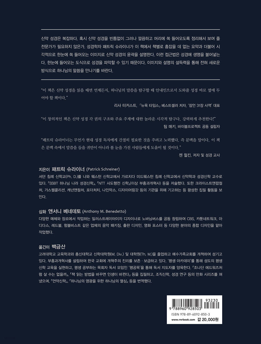 패트릭 슈라이너는 무언가 현대 성경 독자에게 간절히 필요한 것을 주려고 노력했다. 즉 문맥을 말이다. 그리고 그는 접근하기도 쉽고 기억하기도 쉬운 방식으로 이 일을 해냈다. 여기에 무엇보다도 그림을 사용해 신약 성경의 각 권의 ‘큰 그림’을 파악하기 위한, 가르치려는 사람과 배우려는 사람 모두에게 유용한 도구가 있다. 이 책은 문맥 속에서 말씀을 ‘들을 귀만이 아니라 볼 눈을 가진’ 사람들에게 도움이 될 것이다. - 젠 윌킨 (저자 및 성경 교사)
