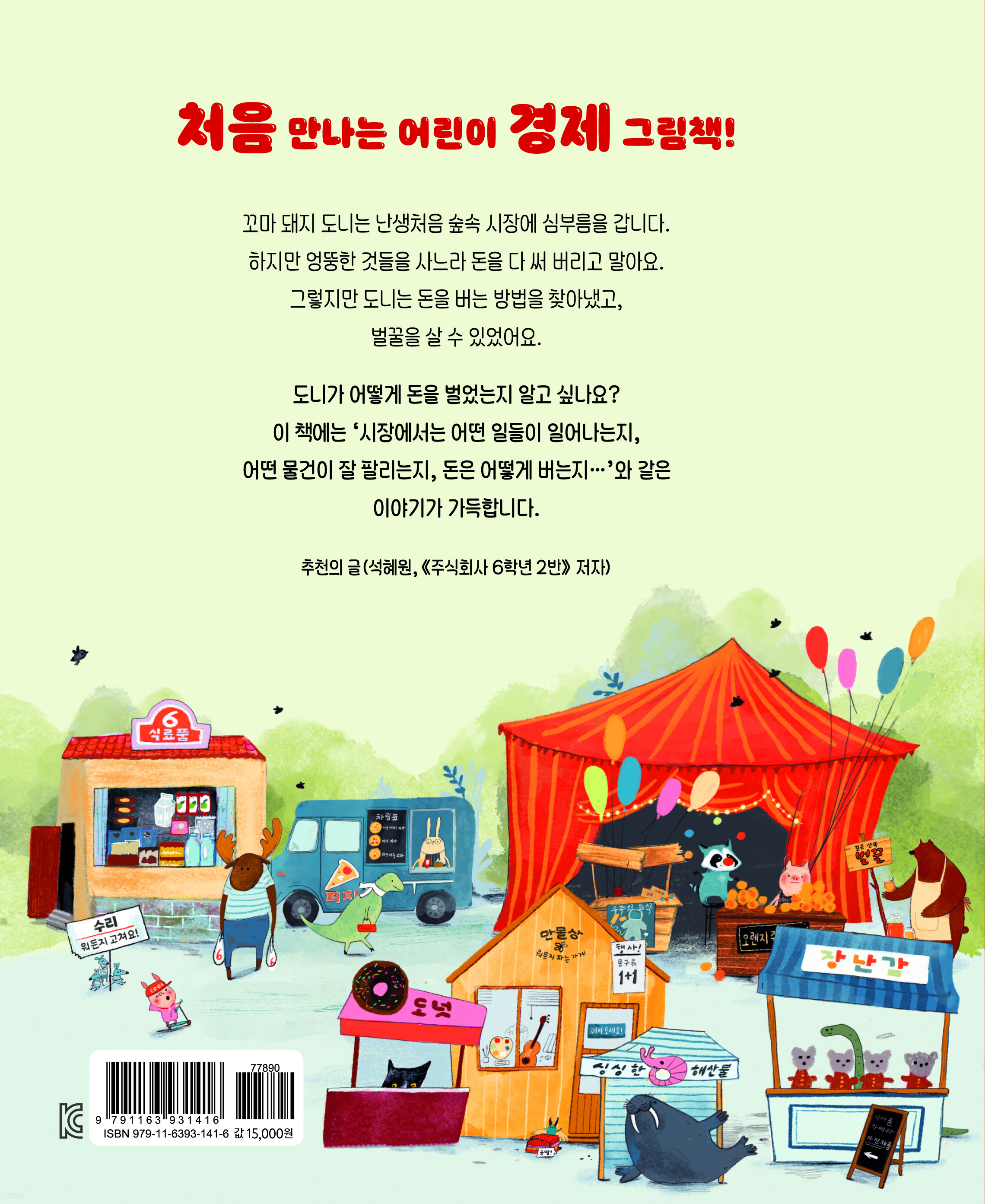 꼬마 돼지 도니는 난생처음 숲속 시장에 심부름을 갑니다. 하지만 엉뚱한 것들을 사느라 돈을 다 써 버리고 말아요. 그렇지만 도니는 돈을 버는 방법을 찾아냈고, 벌꿀을 살 수 있었어요. 도니가 어떻게 돈을 벌었는지 알고 싶나요? 이 책에는 ‘시장에서는 어떤 일들이 일어나는지, 어떤 물건이 잘 팔리는지, 돈은 어떻게 버는지…’와 같은 이야기가 가득합니다. - 석혜원 (『주식회사 6학년 2반』 저자)