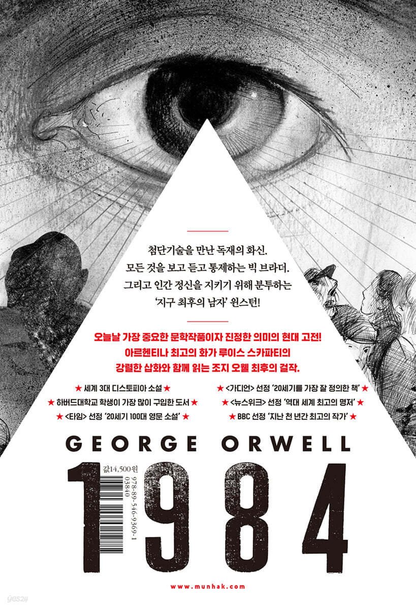 * 조지 오웰 탄생 120주년, 데뷔 90주년 기념 * 일러스트와 함께 읽는 불후의 명작 『1984』 “미래상을 그려보기를 원한다면 사람의 얼굴을 짓밟는 구둣발을 상상하면 되네. 사람의 얼굴은 언제나 짓밟히고 있을 거야. 사회의 적인 이단자는 항상 짓밟힐 것이므로 계속해서 패배당하고 모욕을 받을 걸세. 자네가 우리 손에 넘어온 이래 겪은 모든 일이 ─그 모든 것이 그치지 않을 것이고 더욱 심해질 거야.” 첨단기술을 만난 독재의 화신. 모든 것을 보고 듣고 통제하는 빅 브라더. 그리고 인간 정신을 지키기 위해 분투하는 ‘지구 최후의 남자’ 윈스턴! 오늘날 가장 중요한 문학작품이자 진정한 의미의 현대 고전! 아르헨티나 최고의 화가 루이스 스카파티의 강렬한 삽화와 함께 읽는 조지 오웰 최후의 걸작. * 세계 3대 디스토피아 소설 * * 하버드대학교 학생이 가장 많이 구입한 도서 * * 〈타임〉 선정 ‘20세기 100대 영문 소설’ * * 〈가디언〉 선정 ‘20세기를 가장 잘 정의한 책’ * * 〈뉴스위크〉 선정 ‘역대 세계 최고의 명저’ * * BBC 선정 ‘지난 천 년간 최고의 작가’ * * 전 세계 65개국 언어로 번역된 진정한 의미의 고전 * “『1984』는 첫 문장에서 마지막 네 단어에 이르기까지 완벽하게 설득력 있는 가상의 세계를 창조해냈다.” _에리히 프롬 “전 세계에서 가장 영향력 있는 작가” “20세기를 대표하는 인물”로 꼽히는 조지 오웰의 작가적 목소리가 오롯이 담긴 최후의 걸작 『1984』가 조지 오웰 탄생 120주년, 작가 데뷔 90주년을 맞아 문학동네에서 일러스트판으로 출간된다. 아르헨티나 최고 화가에게 주어지는 ‘살론 나시오날 데 그랑프리’를 받은 세계적인 화가 루이스 스카파티의 시선을 사로잡는 삽화로 『1984』의 메시지가 더욱 강렬하게 다가온다. 『1984』는 1949년 출간 당시 이미 “20세기 가장 중요한 문학작품 중 하나가 될 것”이라는 언론의 찬사를 받았고, 영국과 미국에서만 40만 부가 팔리며 문학사에 다시없을 흥행을 기록했다. 작품과 관련된 ‘오웰리언’ ‘빅 브라더’와 같은 용어가 사전에 등재되기도 했으며 문학계와 영화, 음악, 미술 등 다양한 문화 영역에서 끊임없이 영감을 주고 인용되고 있다. 또한 정치와 사회 일반에서도 중요한 의미를 가지는 작품이자 “세계 3대 디스토피아 소설”로 꼽힌다. 미래에게 혹은 과거에게, 사상이 자유롭고 인간의 생각이 서로 다를 수 있고 서로 고립돼 살지 않는 시대에게─그리고 진실이 죽지 않고, 이루어진 것은 짓밟혀 없어질 수 없는 시대에게. 획일성의 시대로부터, 고독의 시대로부터, 빅 브라더의 시대로부터, 이중사고의 시대로부터─축복이 있기를! (본문 42쪽) 전체주의가 지배하는 가상의 미래, 세계 곳곳에서 핵전쟁이 일어났고 그 결과 전 세계는 3대 초강대국으로 재편되어 분할 통치된다. 윈스턴 스미스는 초강대국 중 하나인 오세아니아의 하급 당원이다. 윈스턴은 물론이고 모든 사람들은 어디에서나 24시간 송수신이 가능한 ‘텔레스크린’에 의해 일거수일투족을 감시당한다. 도시 곳곳에는 당의 지도자 ‘빅 브라더가 당신을 지켜보고 있다’는 문구가 붙어 있다. 어느 날 홀린 듯 공책을 구매한 윈스턴은 텔레스크린의 시선이 닿지 않는 유일한 공간인 방안 구석 책상에 앉아, 그동안 상상 속에서 벼르고 벼른 그 일을 시작한다. 그 일이란 바로 일기를 쓰는 것이다. 오세아니아에서 일기를 쓰는 것은 ‘사상죄’에 해당하고 사상죄는 사형에까지 이를 수 있는 중범죄다. 국가는 개인의 감정과 사고까지 감시, 통제함은 물론 조작도 서슴지 않는다. 하지만 인간 정신을 지켜내기 위해 분투하는 ‘최후의 인간’ 윈스턴은 죽음을 각오하고 일기를 써내려간다. “빅 브라더 타도, 빅 브라더 타도, 빅 브라더 타도……” 과연 윈스턴은 인간다운 삶을 쟁취할 수 있을까? ‘인간이 인간을 지배하는 상황’에 대한 섬뜩한 경고, 조지 오웰의 작가적 목소리가 오롯이 담긴 최후의 걸작! 조지 오웰은 1945년 발표한 『동물농장』으로 큰 작가적 명성을 얻었지만 이후 그의 삶은 암울하기 그지없었다. 2차대전 말엽 유럽에서 특파원 활동을 하며 전쟁의 실체를 온몸으로 겪었고, 사상적 동반자이자 문학 활동의 조력자인 부인을 잃었으며, 폐결핵의 악화로 병원에 입원하고 요양하기를 반복했다. 오웰은 결국 1947년 스코틀랜드 주라섬으로 들어갔다. 그곳에서 자신이 평생에 걸쳐 목소리를 내온, 현대 사회 지배체제에 내포된 위험성을 경고하는 작품을 쓰는 데 몰두했다. 1948년 병상에서 그는 마침내 자신의 마지막 작품이자 20세기 영문학사에 한 획을 그은 정치소설 『1984』를 탈고했다. 1949년 출간되자마자 『1984』는 전작을 뛰어넘는 큰 반향을 불러일으켰다. 하지만 이러한 성공을 뒤로하고 오웰은 결국 1950년 1월 23일, 런던의 한 병원에서 47세의 젊은 나이로 숨을 거두었다. 조지 오웰은 마지막 걸작 『1984』를 통해 ‘인간이 인간을 지배하는 상황’에 대한 비판과 경고를 더없이 예리하고 공포스럽게 그려냈다. 작품이 던지는 경고의 메시지는 지금 시대에 이르러서도 전혀 효력을 잃지 않았는데, 오히려 에리히 프롬은 “1949년의 오