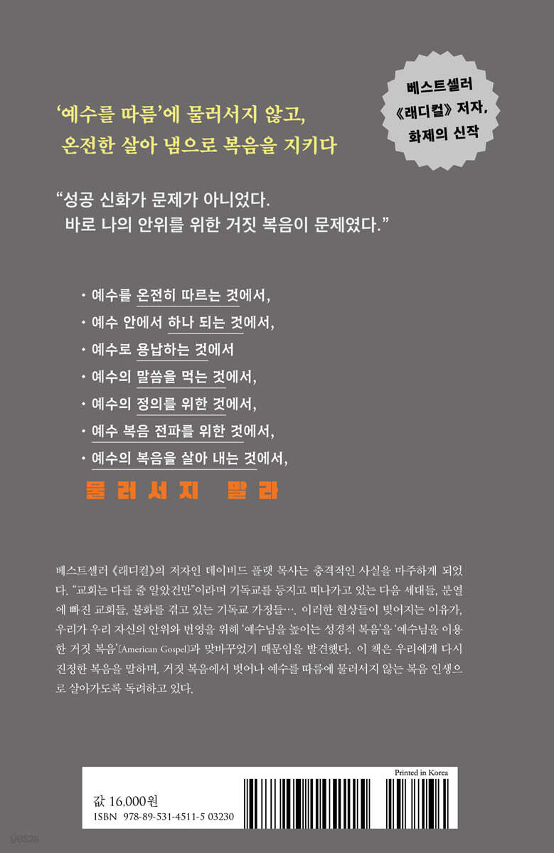 바로 나의 안위를 위한 거짓 복음이 문제였다.” · 예수를 온전히 따르는 것에서, · 예수 안에서 하나 되는 것에서, · 예수로 용납하는 것에서 · 예수의 말씀을 먹는 것에서, · 예수의 정의를 위한 것에서, · 예수 복음 전 파를 위한 것에서, · 예수의 복음을 살아 내는 것에서, 물 러 서 지 말 라 우리 앞에 선택이 놓여 있다. 아메리칸 복음이냐 성경적인 복음이냐. 그 어떤 공격에도 물러서지 않는 순전한 복음을! 우리 앞에 놓인 위험, 낙심하고 지친 이들 베스트셀러 『래디컬』의 저자인 데이비드 플랫 목사는 충격적인 사실을 마주하게 되었다. 요즘 낙심하고 좌절하고 지친 예수님의 제자들은 나만이 아니다. 이 나라의 중심지에서 보니 사방이 아우성이다. 교회 안에서 영적, 감정적, 관계적, 심지어 육체적 상처를 경험한 사람들, 냉랭해진 가족들, 서먹해진 친구들, 편을 나눠 서로 원수처럼 다투는 장로들, 파벌들이 서로 빼앗고 뺏기는 교단들, “교회는 다를 줄 알았건만”이라며 기독교에 실망하여 신앙을 등지고 떠나가고 있는 다음 세대들…. 문제는 아메리칸 드림에 기독교 색깔만 입힌 거짓 복음 이러한 현상들이 빚어지는 이유가, 우리가 우리 자신의 안위와 번영을 위해 ‘예수님을 높이는 성경적 복음’을 ‘예수님을 이용한 거짓 복음’ 〔American Gospel〕과 맞바꾸었기 때문임을 발견했다. 아메리칸 복음[American Gospel]은 아메리칸 드림〔American Dream〕에 기독교의 색깔만 입힌 거짓 복음이다. ‘철저한’ 돌이킴을 넘어 ‘온전한’ 살아 냄으로, 우리는 예수님의 놀라운 경이와 그분의 교회가 보여주는 초월적인 아름다움을 경험할 수 있다. 하지만 그렇게 되려면 우리부터 시작해서 뭔가가 달라져야 한다. 마음에 진정한 복음을 품고 하나님을 상으로 여기면서 포기하지 말고 꿋꿋이 앞으로 나아가자. 성경적 복음으로 달려가게 하는 매일의 실천 6가지. 1. 하늘에서처럼 이 땅에서 공동체를 이루라 2. 아침과 저녁에 오랜 시간 동안 하나님을 찾으라 3. 머리와 가슴에 하나님의 말씀을 가득 채우라 4. 세상 문화를 거스르는 연민을 보여 주라 5. 정의를 행하라 6. 복음을 듣지 못한 이들에게 복음을 전하라 이 책은 우리에게 다시 진정한 복음을 말하며, 거짓 복음에서 벗어나 예수를 따름에 물러서지 않는 복음 인생으로 살아가도록 독려하고 있다. 순전한 복음으로 돌아가, 주님이 원하시는 아름다운 연합과 그분이 꿈꾸시는 교회와 가정을 이루는 일에 물러서지 말자. 우리의 열심과 최선이 아닌 예수의 영광을 위해 살자. |
